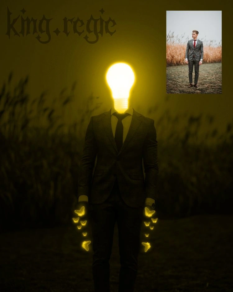 "IDEA" A unique and symbolic representation. The suit with a light bulb in place of his head suggests a metaphorical representation of ideas, creativity.