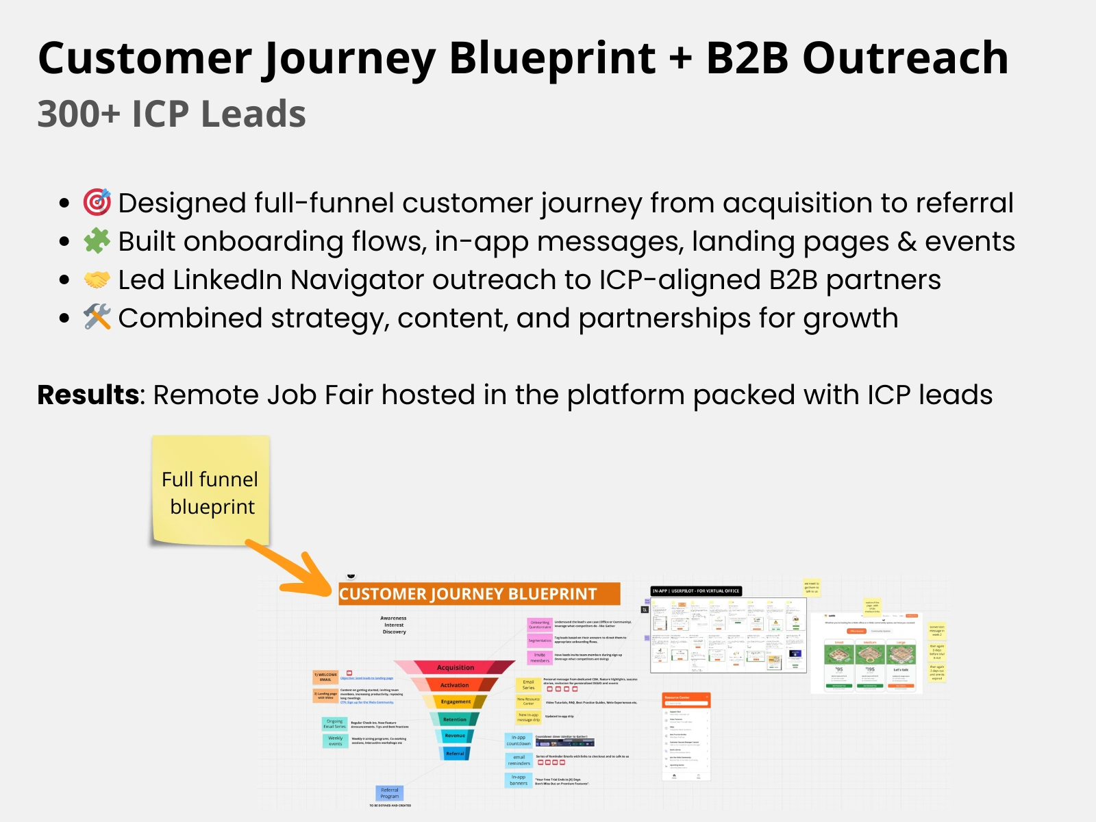 Built new full customer journey blueprint and launched B2B LinkedIn outreach campaign — drove Job Fair with 300+ ICP leads and multiple sales opportunities.
