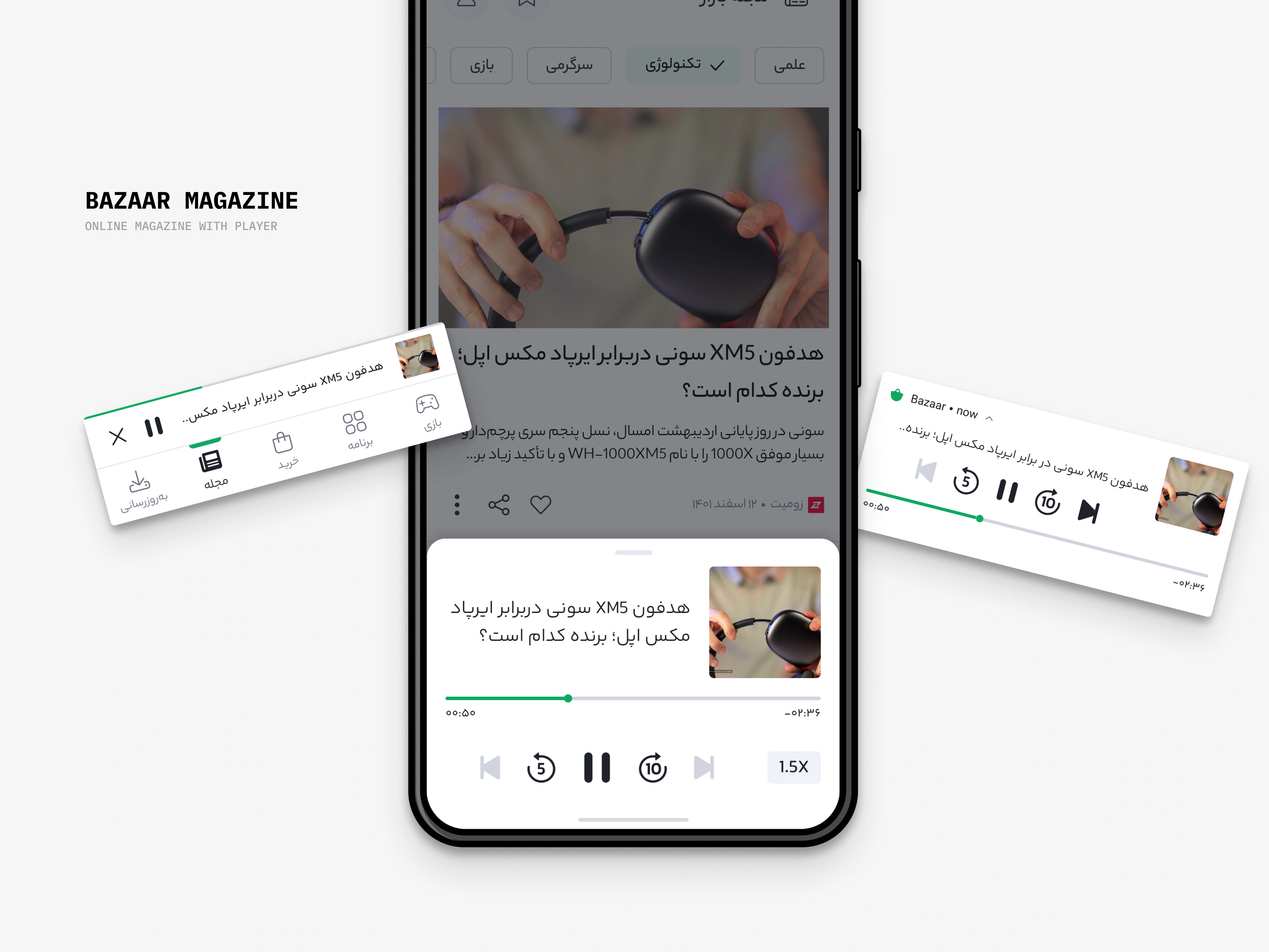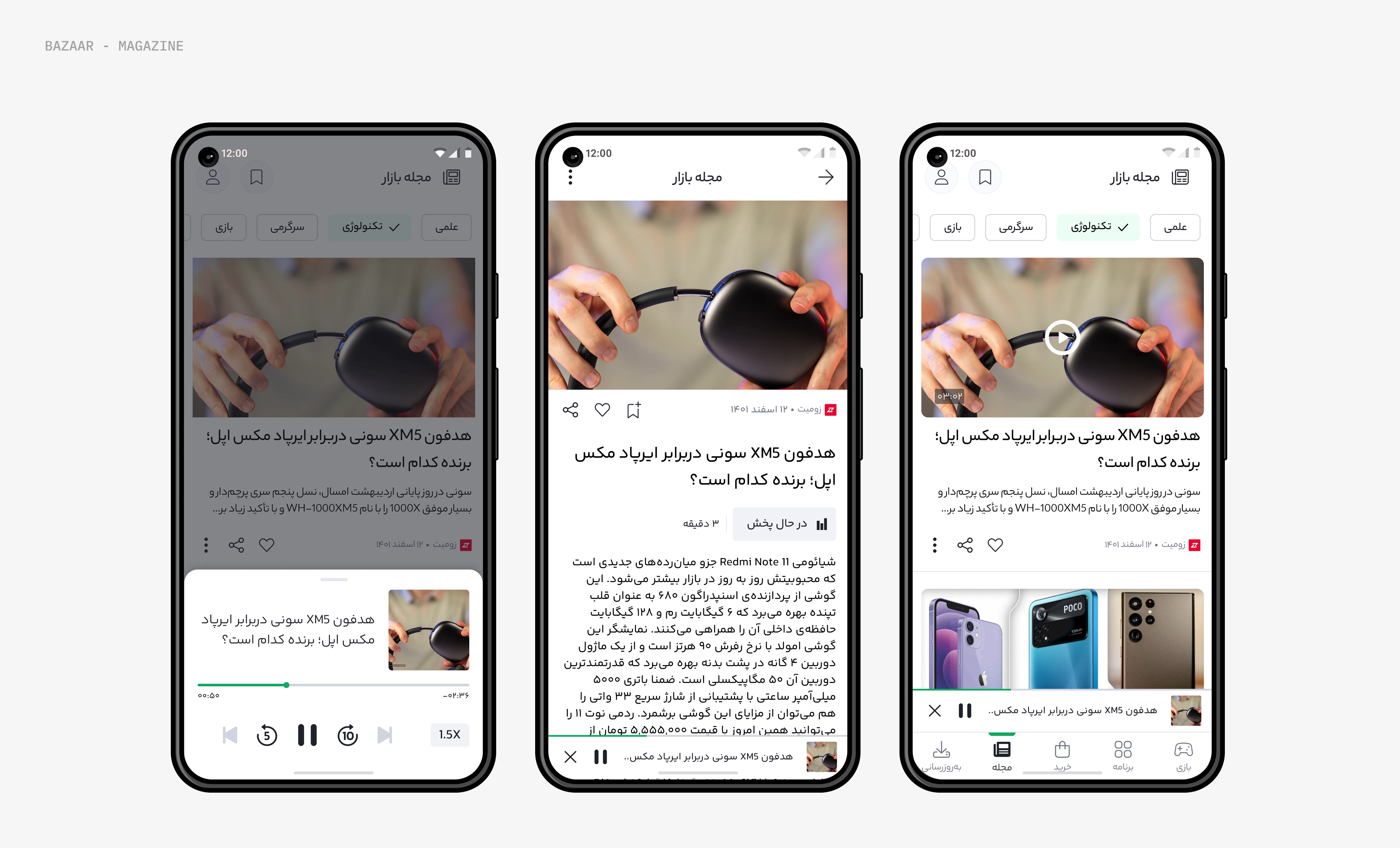 Bazaar wanted to bring a magazine section into their app to share articles alongside apps and games. I designed the browsing experience with clear categories, smooth navigation, and a built-in audio player so users could choose to read or listen. The goal was to make the magazine feel easy to explore while adding flexibility in how people consume content.