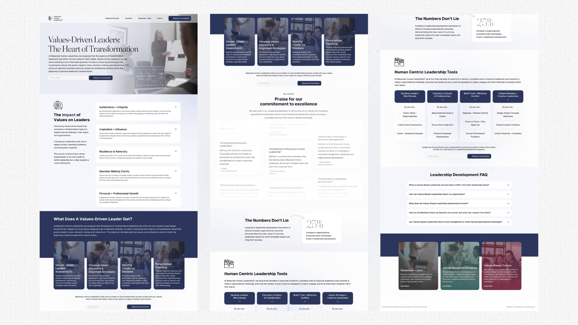 also worked on refining the website copy to be clear, concise, and compelling. This included sections like the Values-Driven Leadership Impact, Client Testimonials, and the FAQ—all aimed at showcasing the benefits of MHL’s leadership programs in a way that resonates with potential clients.