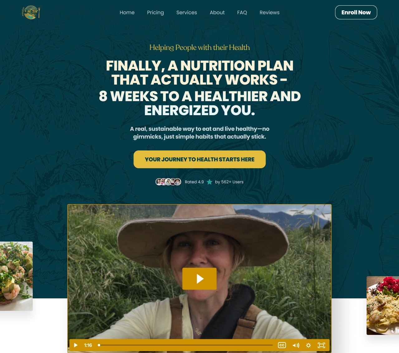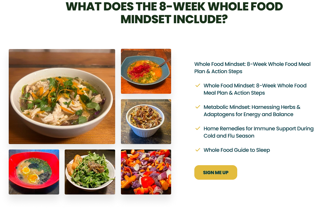 The site walks users through the Whole Food Mindset Method—a step-by-step course that redefines what it means to eat healthy. It covers mindset, food choices, meal planning, and emotional wellness. Testimonials, recipe previews, and callouts build excitement and reduce friction.