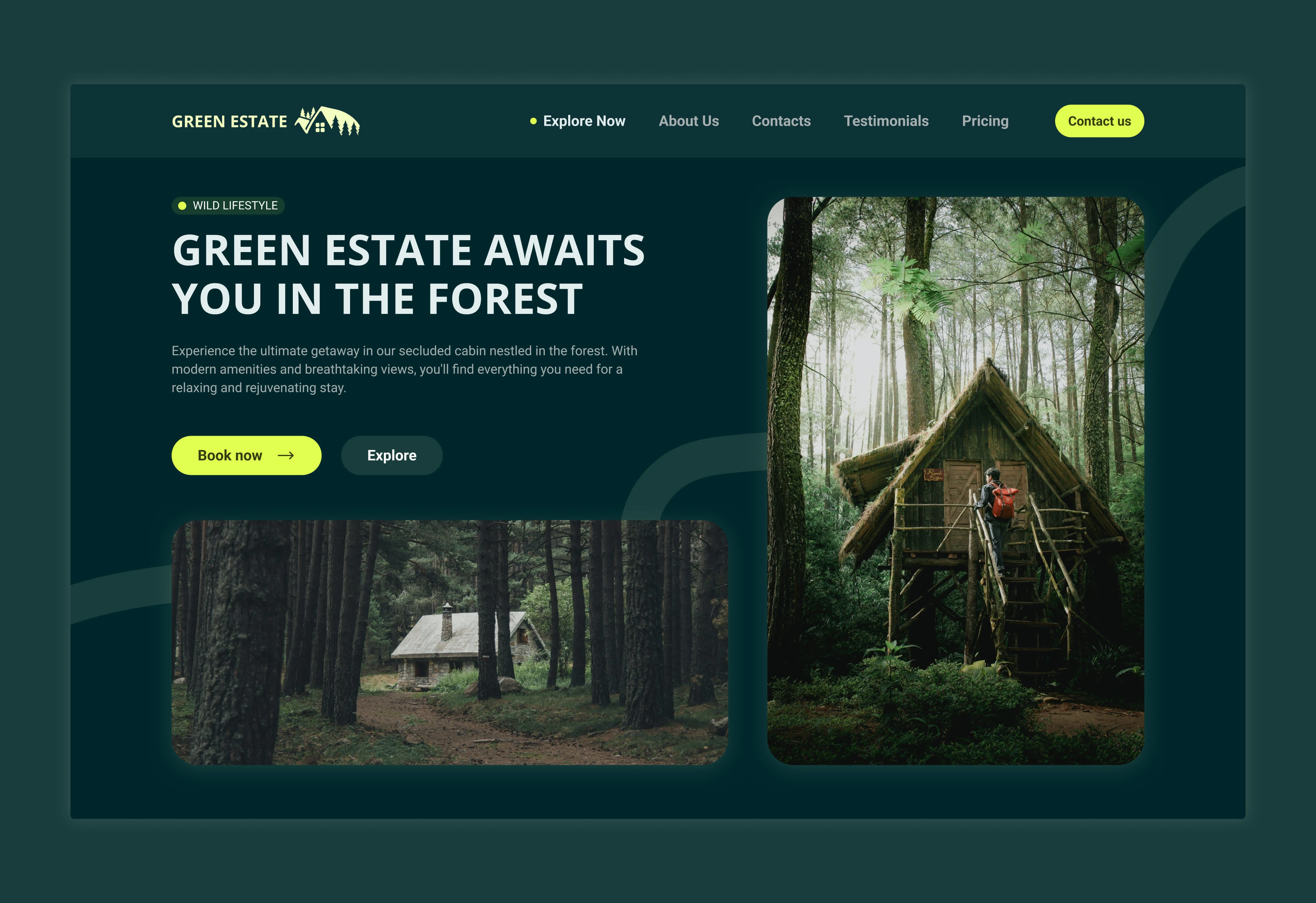 Visual Theme: A deep teal-green color palette mirrors forest depths, with subtle yellow accents for calls-to-action (e.g., "Explore Now" button) and white icons like pine tree silhouettes for a clean, organic feel. High-quality images showcase misty woods, elevated cabins, and winding paths, creating an immersive, aspirational atmosphere.