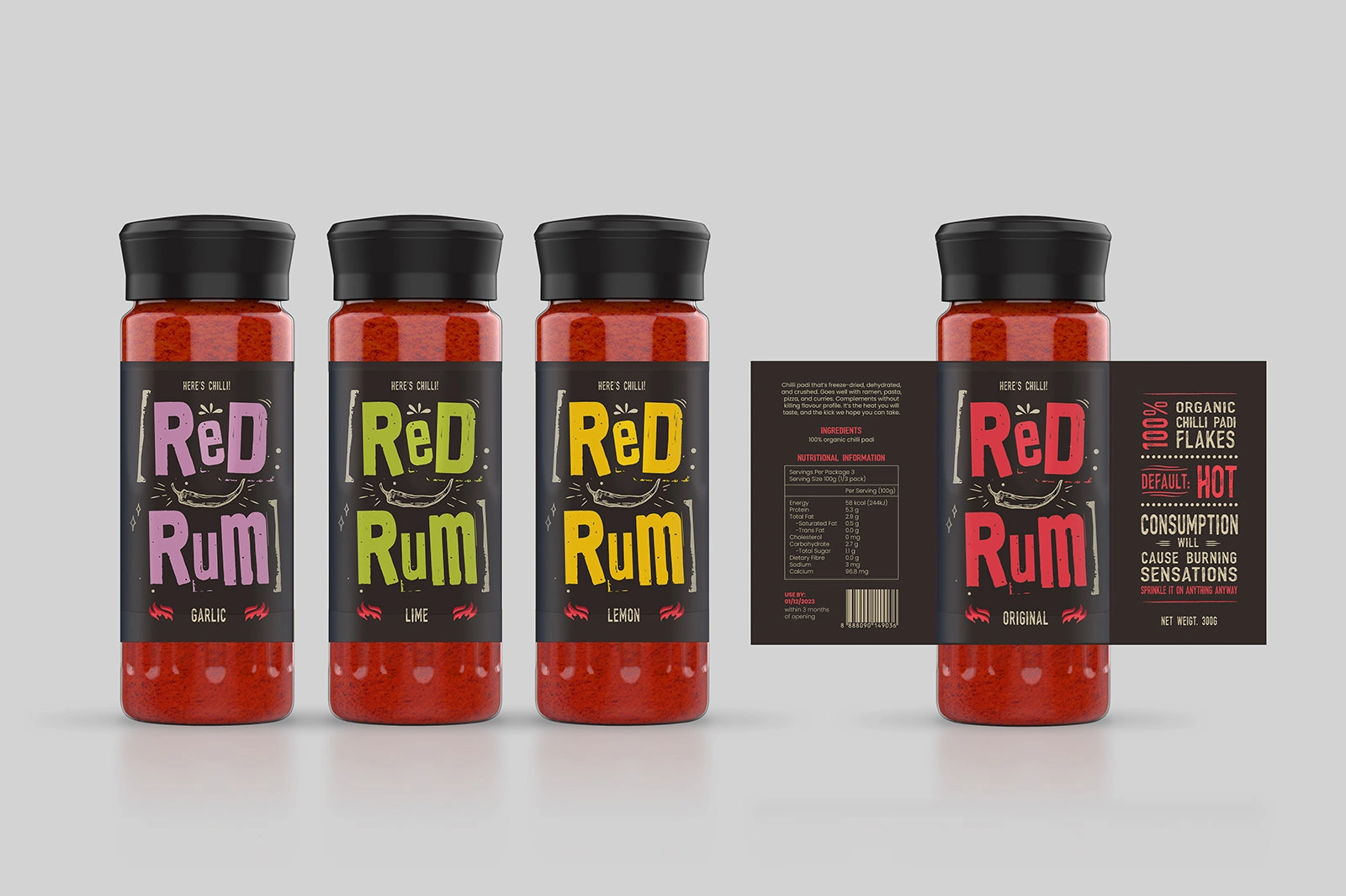 Chili Powder Series – A custom line of four blends: Original Chili, Garlic Chili, Lime Chili, and Lemon Chili. Designed with distinct color accents, each label reflects the fiery yet playful spirit of RedRum.