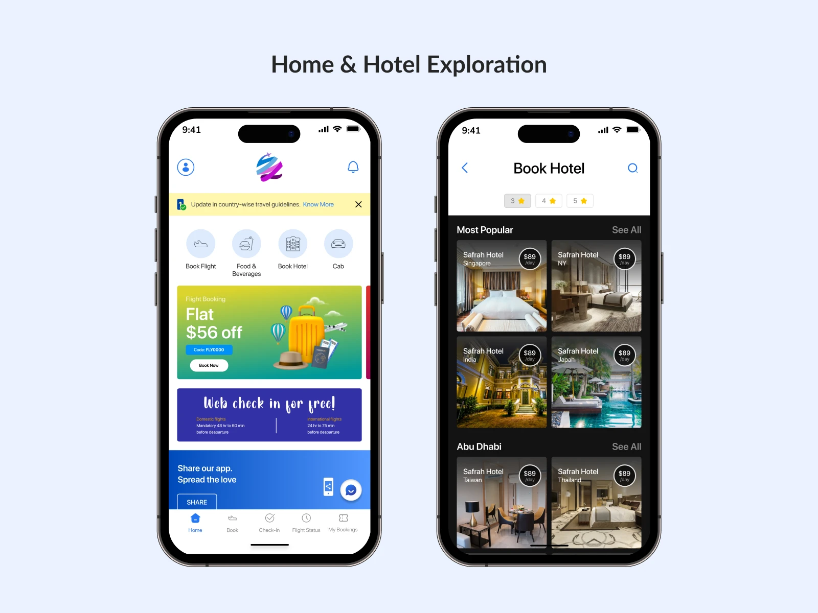 Safrah is a mobile app design concept created to simplify and streamline the travel booking experience. The app enables users to explore destinations, compare flight prices, check travel requirements, search hotels and resorts, and track flight updates—all in one place.
