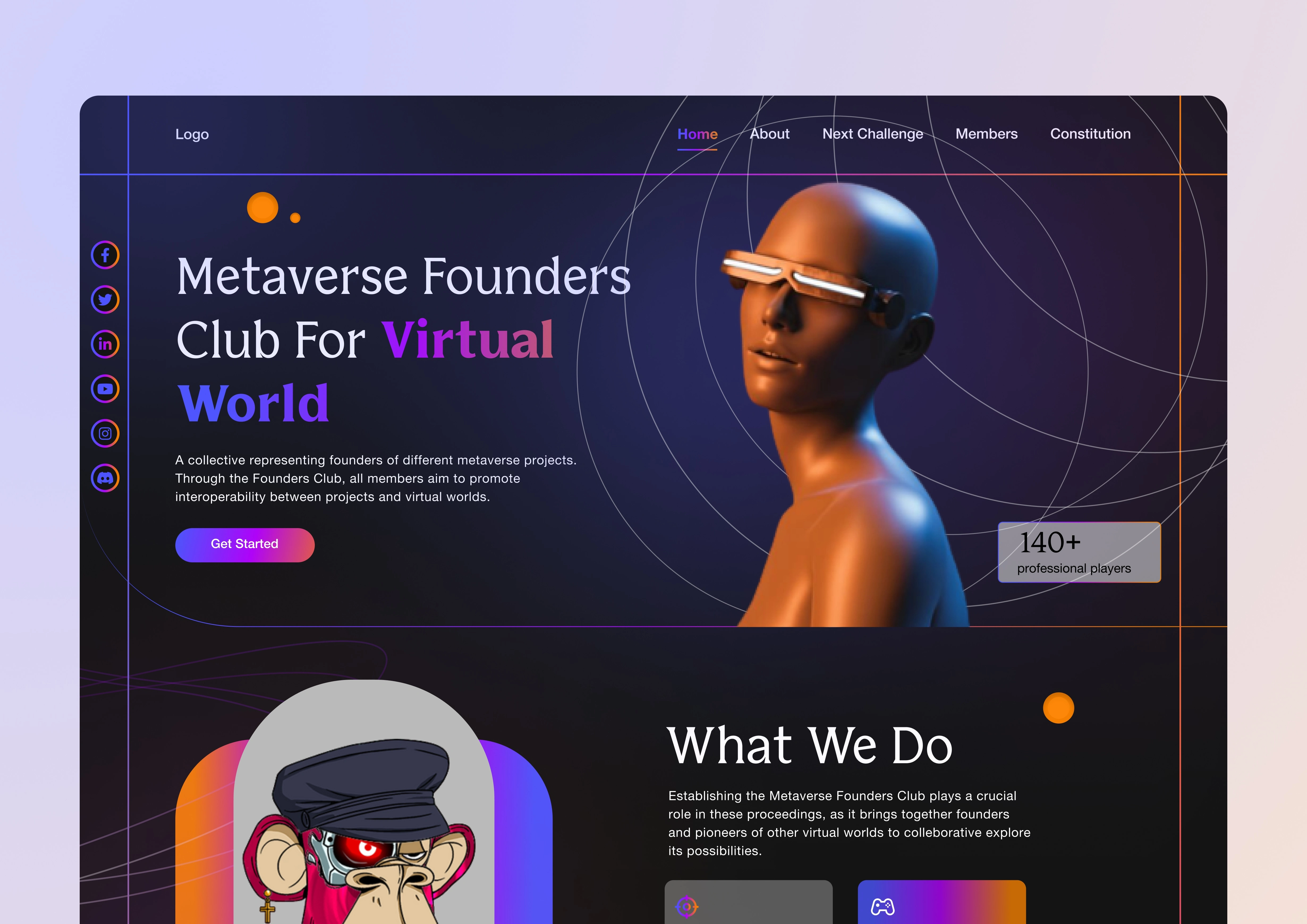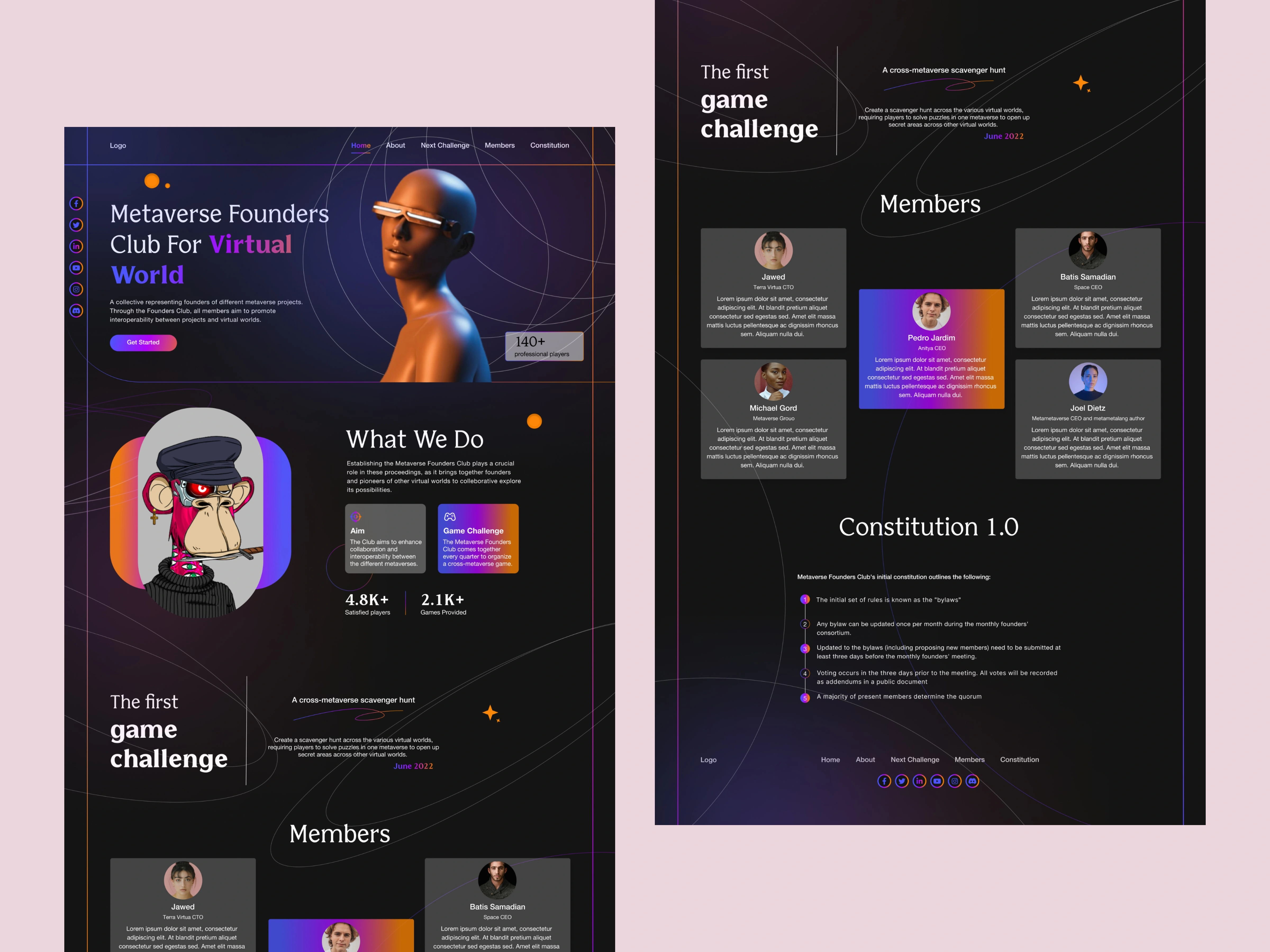 The Metaverse Founders Club landing page was designed as a digital gateway for founders, builders and players exploring the future of virtual worlds. My goal was to create a modern and engaging interface that clearly communicates the mission of the club while highlighting community activities, membership value and platform governance.