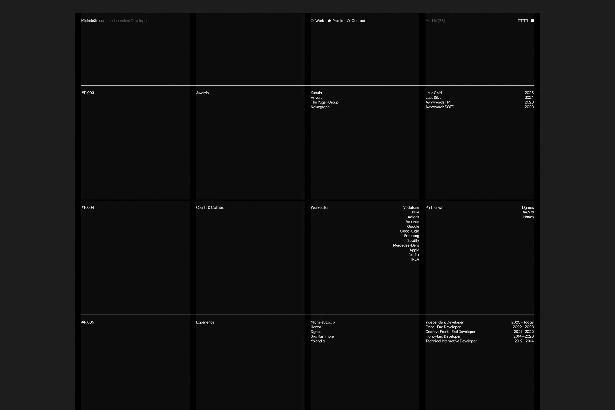 Michele Stoico is an independent interactive developer with two decades of experience, specialising in crafting bespoke hand-coded websites for international brands and agencies.