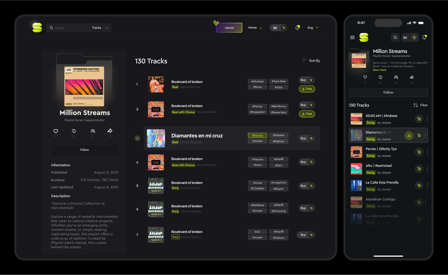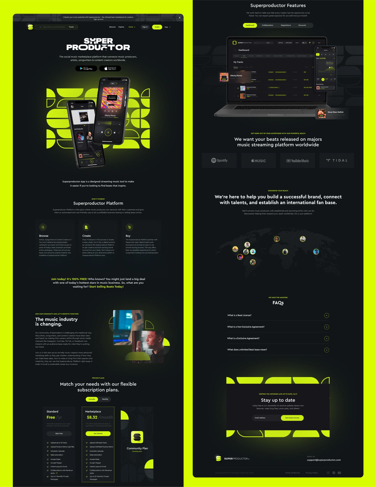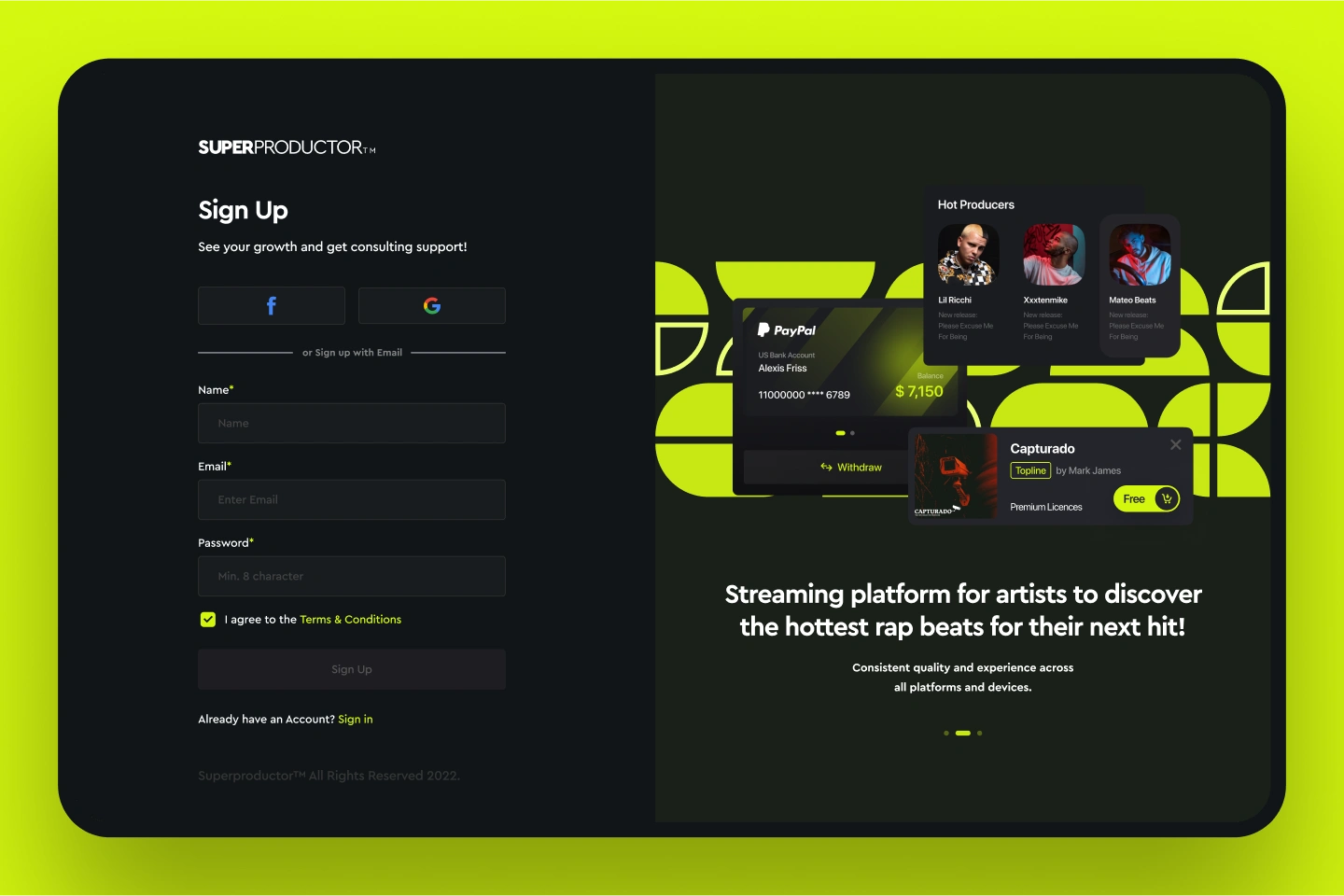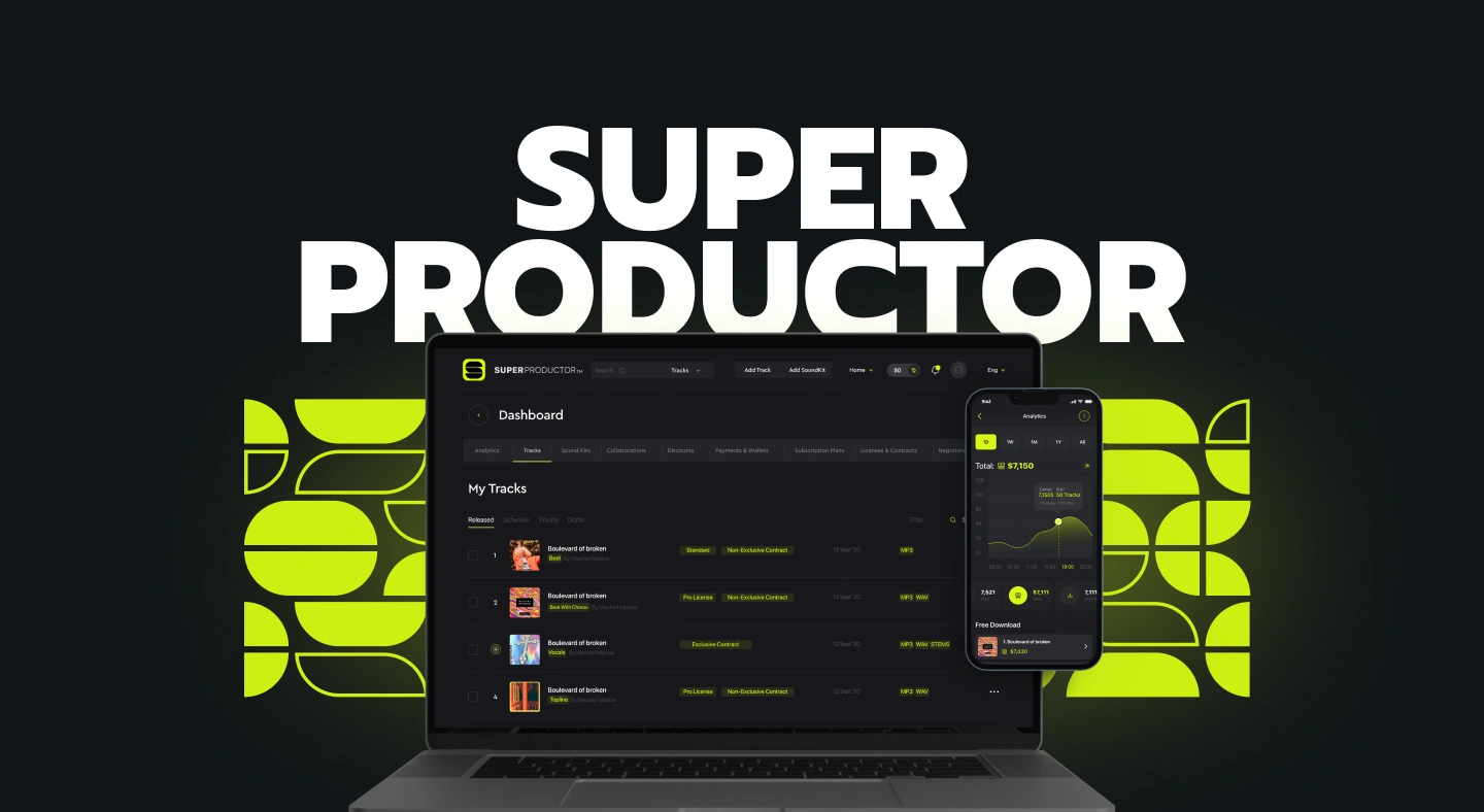 Сreated Super Productor from scratch, designing the entire platform, including desktop and mobile apps, a complete design system, brand identity, and marketing materials. The focus was on building a consistent, user-friendly experience that helps music creators connect, sell, and license their beats.
