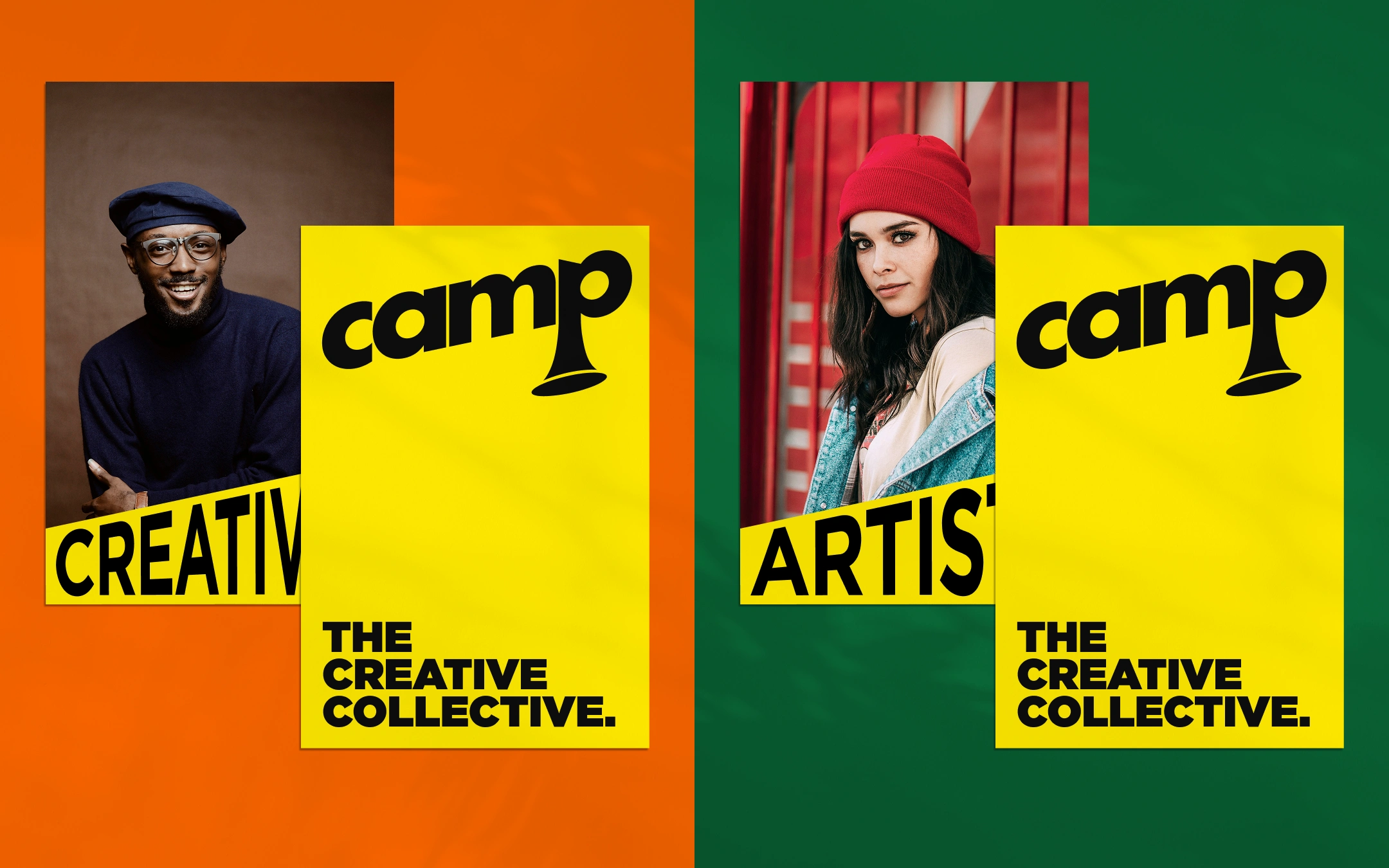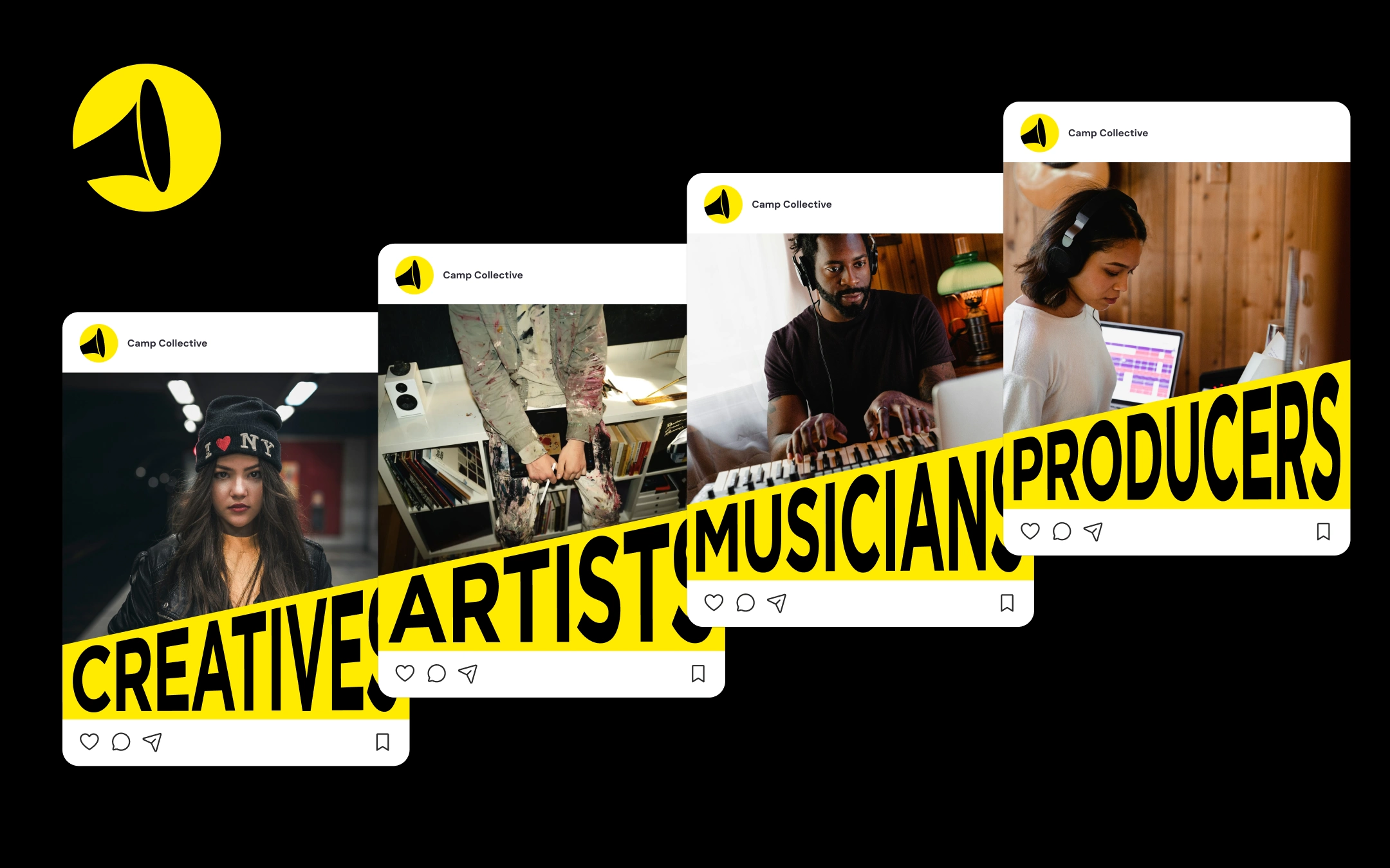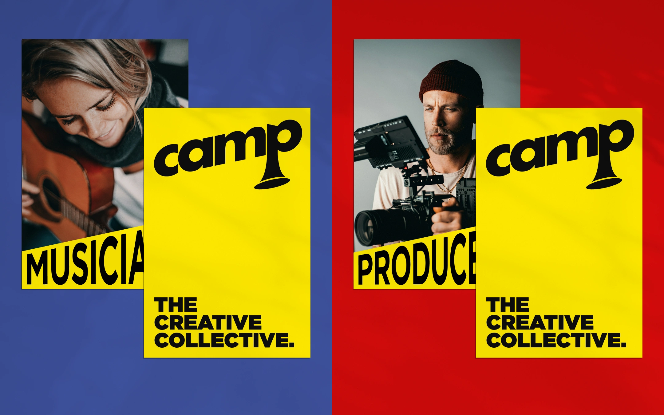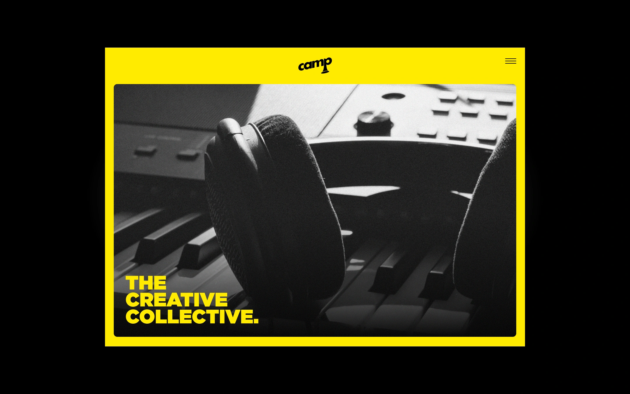Camp is a creative collective studio that produces its own IP across the music and film industries. The abstract P in the camp wordmark represents a horn instrument as music is their foundation, it can also be seen as a megaphone that's commonly used on movie sets.