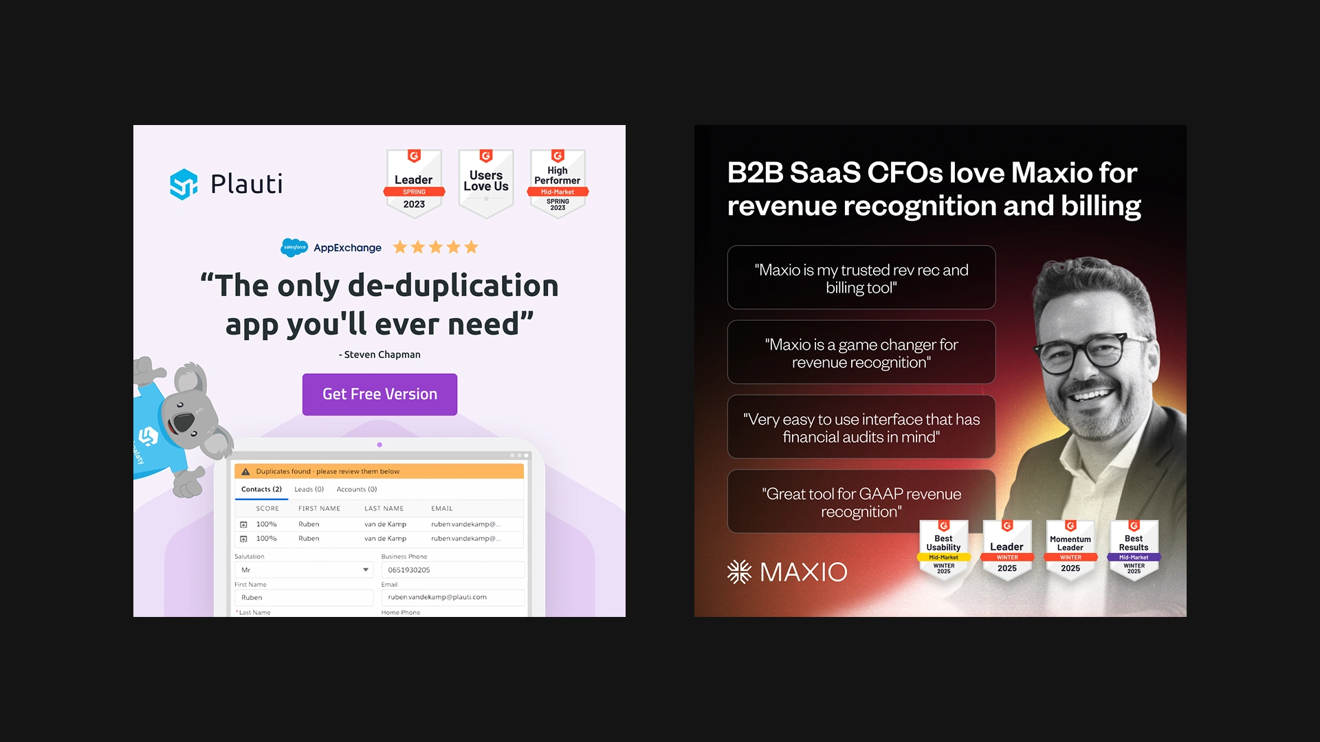 Designed strategic Facebook and LinkedIn testimonial ad creatives that leveraged social proof to build trust for B2B SaaS companies.