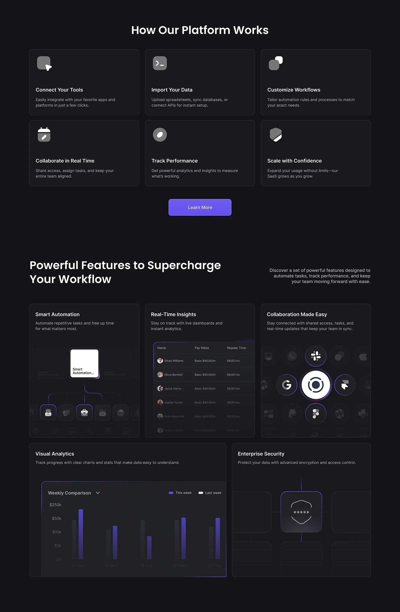 The interface was designed with modular components, strong hierarchy, and a dark UI optimized for long usage sessions. The full product was developed in Framer, ensuring fast performance, smooth interactions, and easy scalability for future features.
