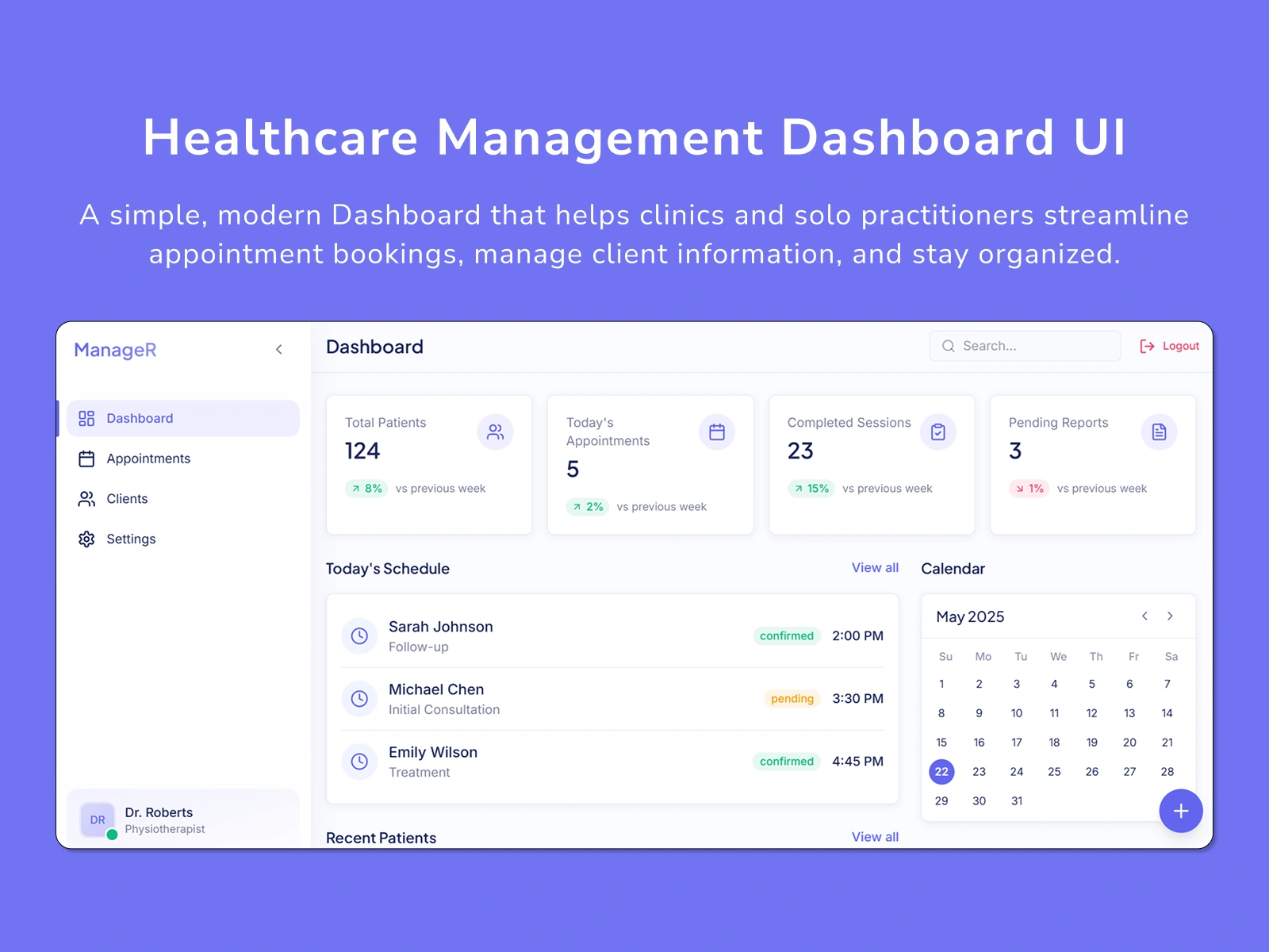 ManageR is a lightweight, no-fuss platform built for clinics, solo practitioners, and small healthcare teams to efficiently manage their appointment bookings and client interactions. With a clean dashboard, real-time updates, and a seamless booking workflow, ManageR helps you stay organized, reduce admin overhead, and focus on delivering great care - without getting lost in bloated software.