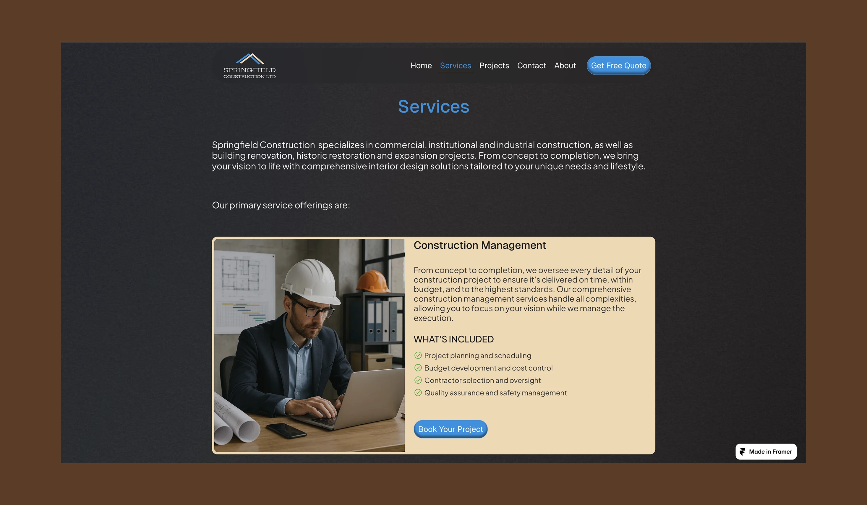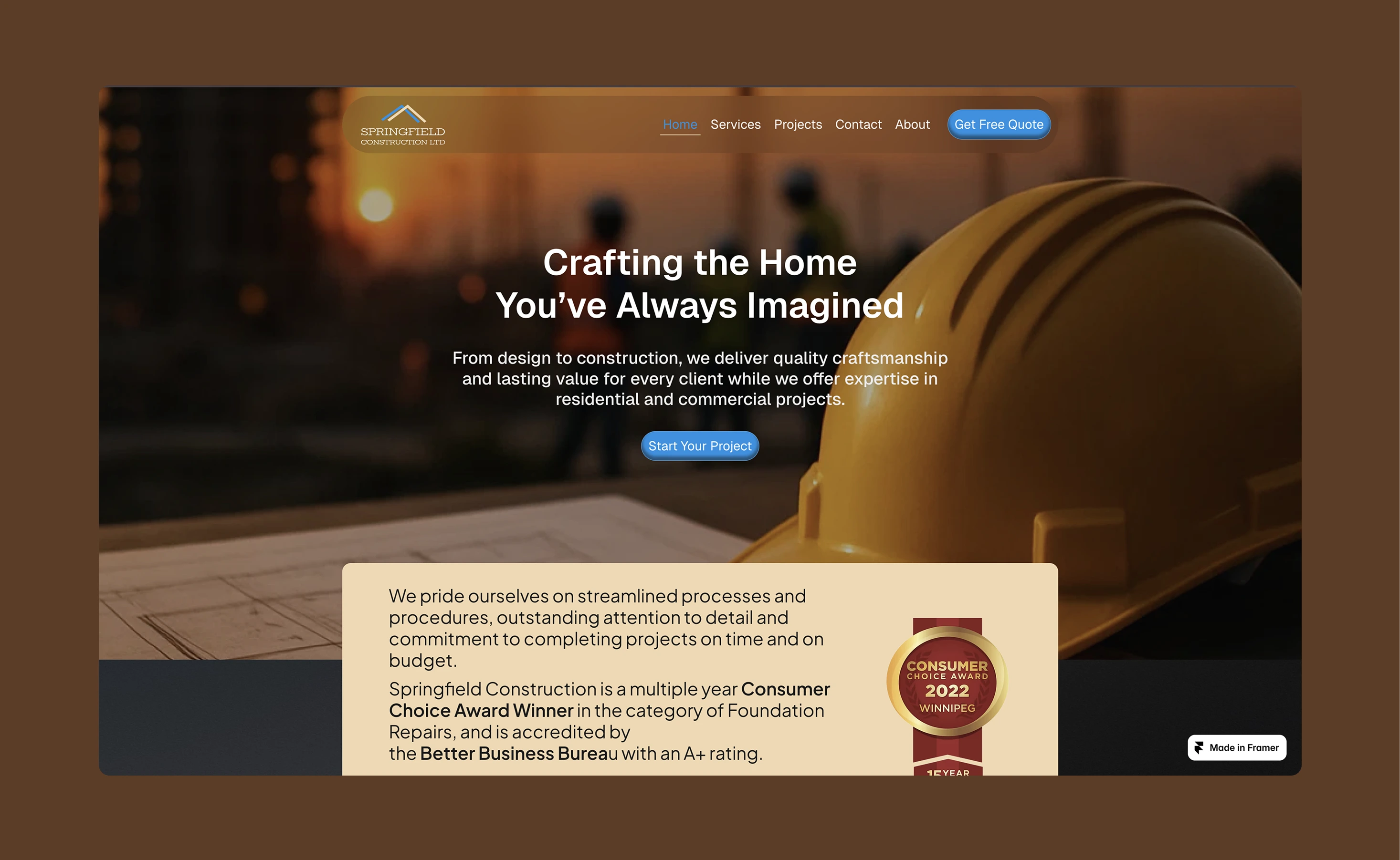 Springfield Construction Ltd. is an award-winning Winnipeg-based firm specializing in foundation repairs, residential, and commercial projects. Despite their prestige, including a Consumer Choice Award and an A+ BBB rating; their digital presence needed a "cinematic" upgrade to match the quality of their physical builds. The goal was to strip away the noise and create a minimalist environment that emphasizes credibility and craftsmanship of the company.