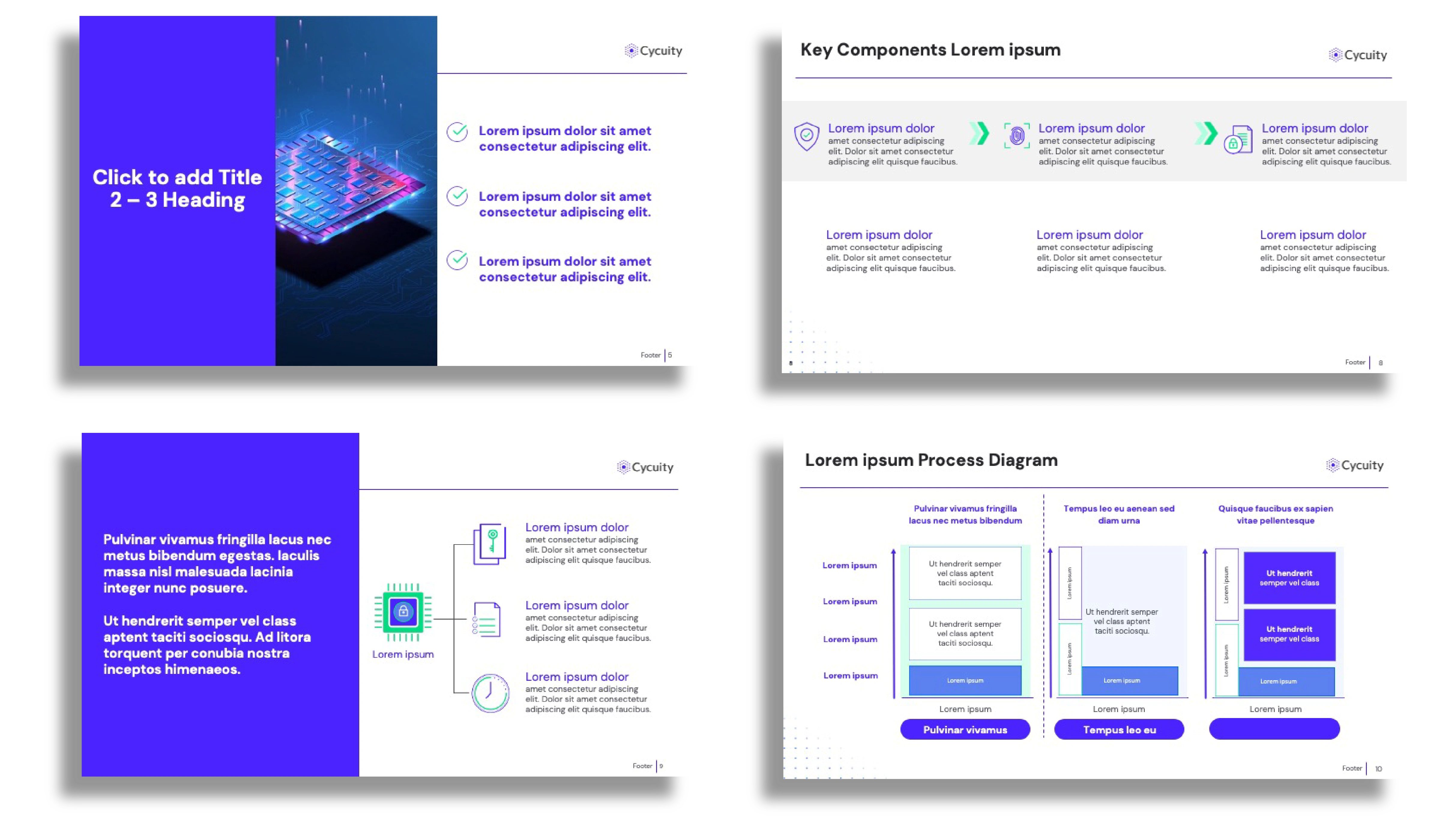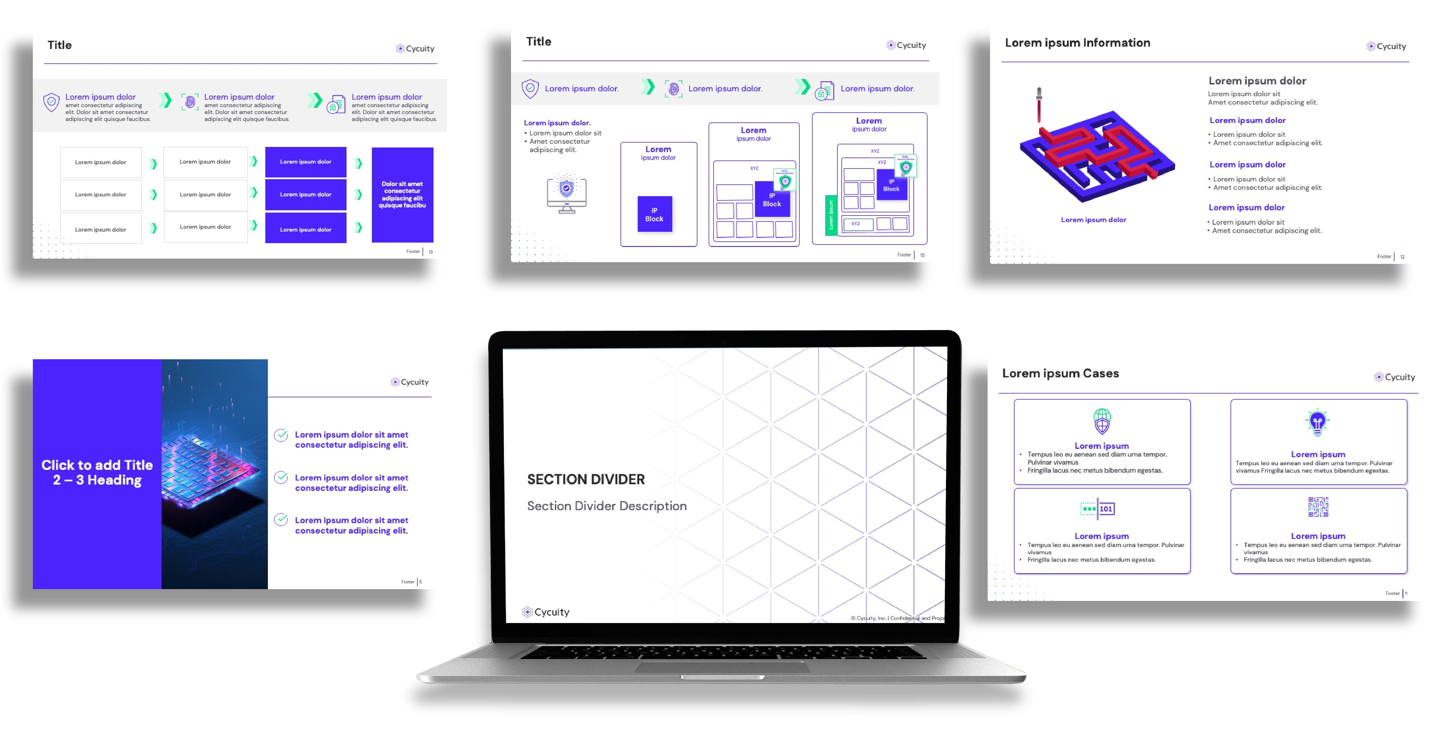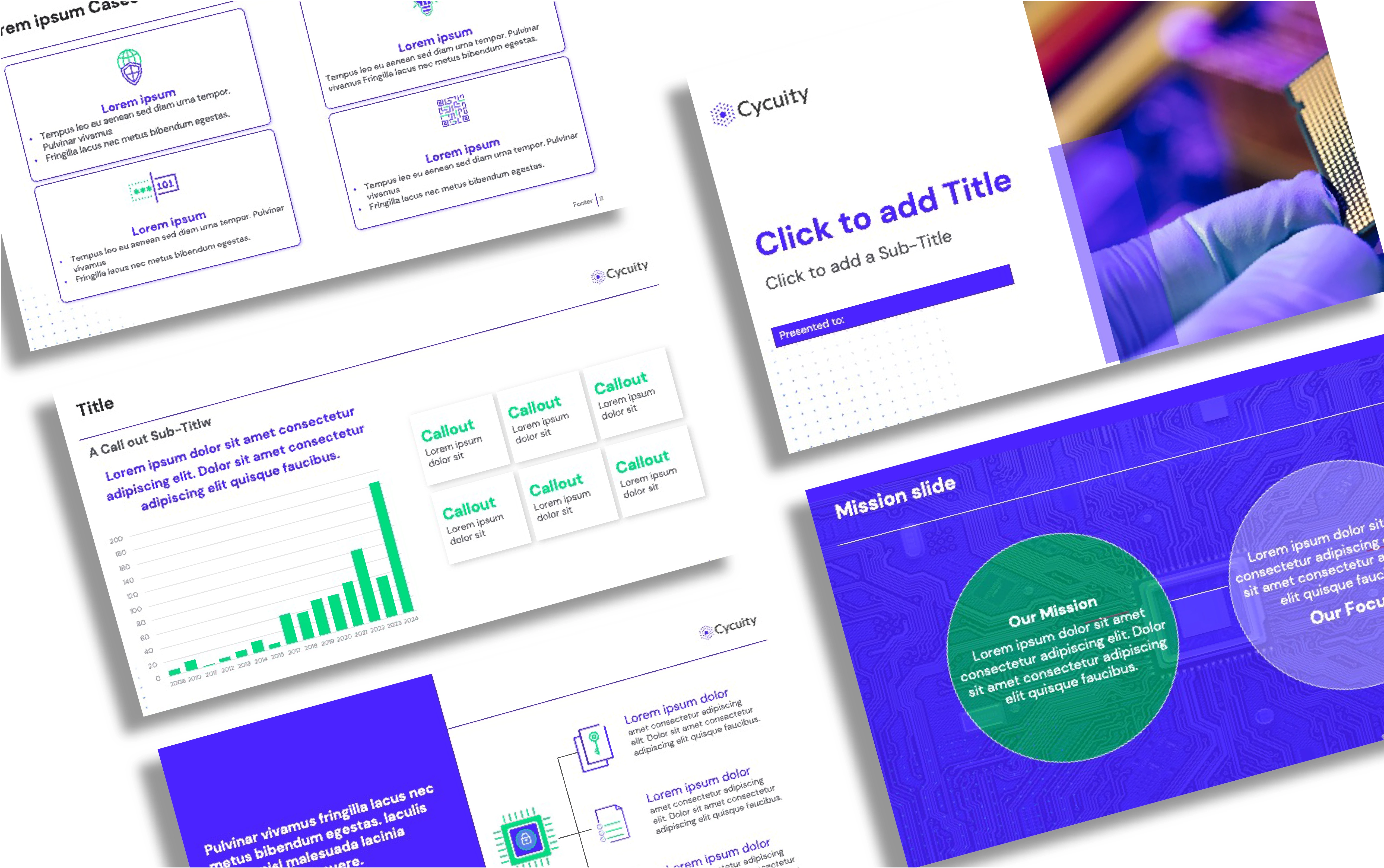 Designed Cycuity’s pitch deck, icon library, motion graphics, and technical sheets—clean, dynamic visuals built for digital and print cohesion.
