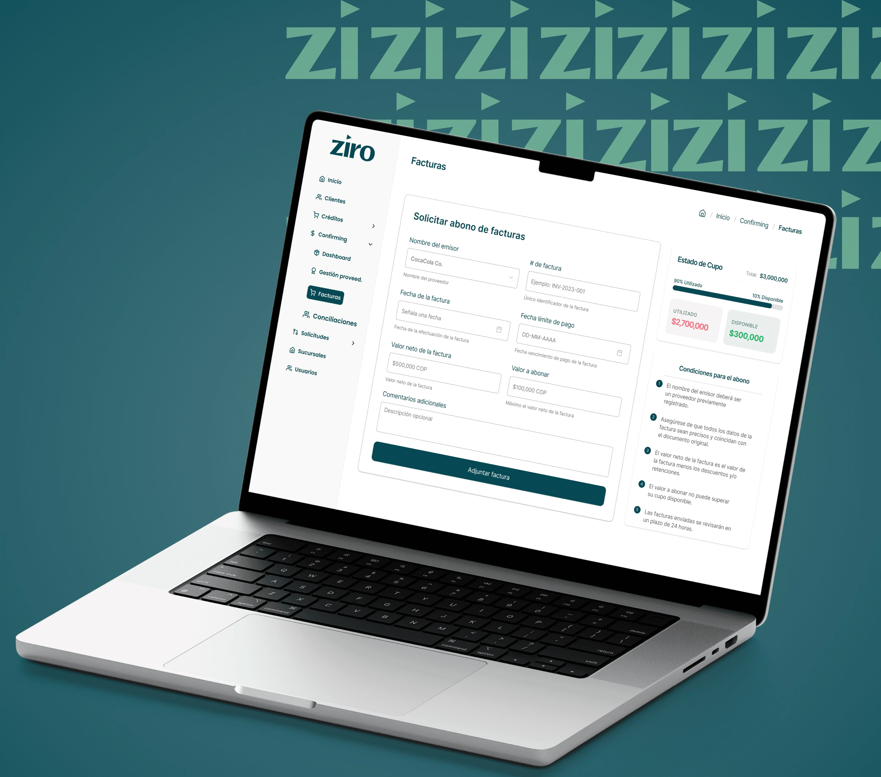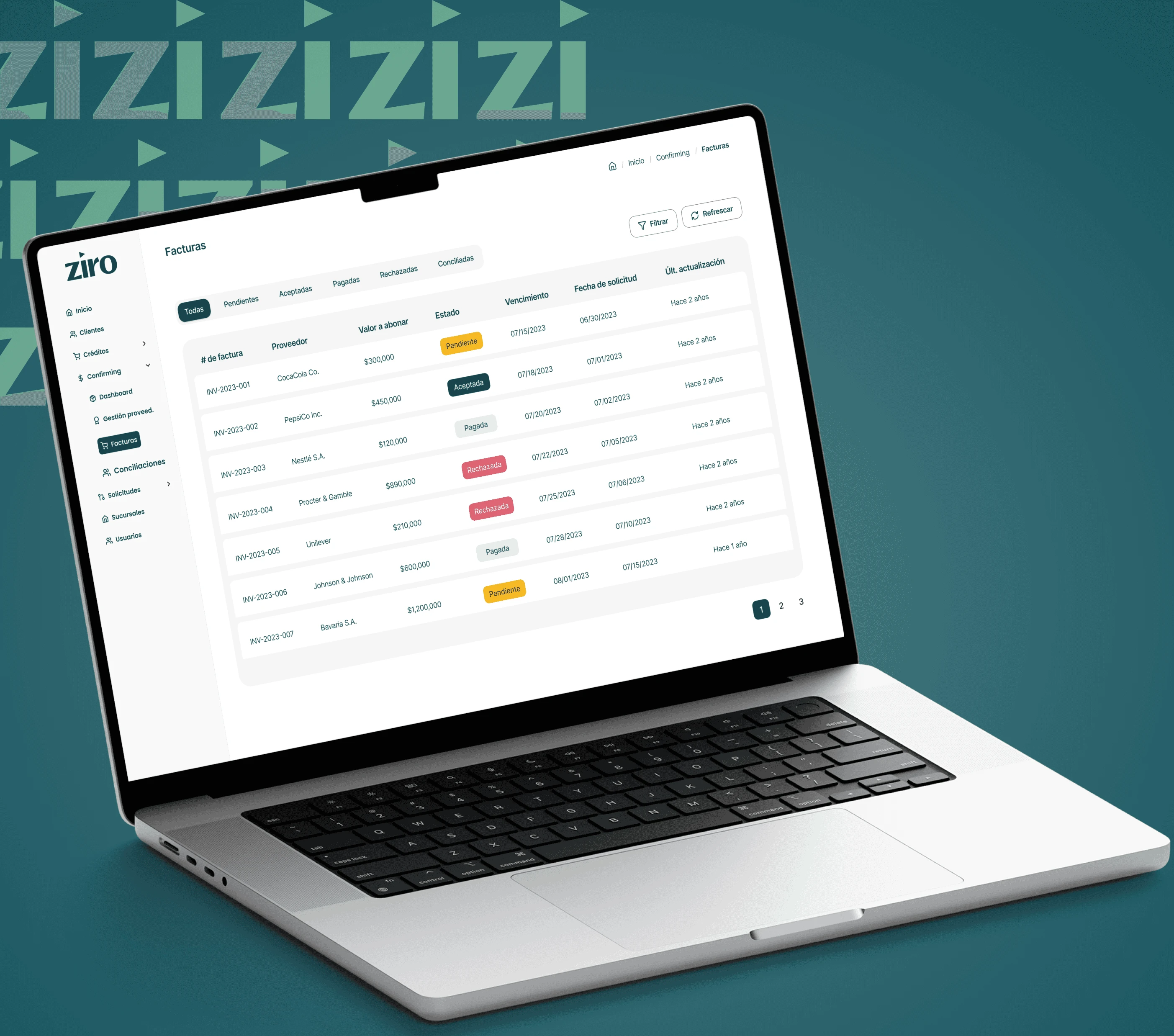 Created a dedicated Confirming area with sub-navigation for Dashboard, Invoices, and Reconciliations. Designed an invoice list with filters and color-coded statuses (Pending, Accepted, Paid, Rejected). Built a reconciliation dashboard with summary cards for confirming debt, interests, total cupo, and available cupo.
