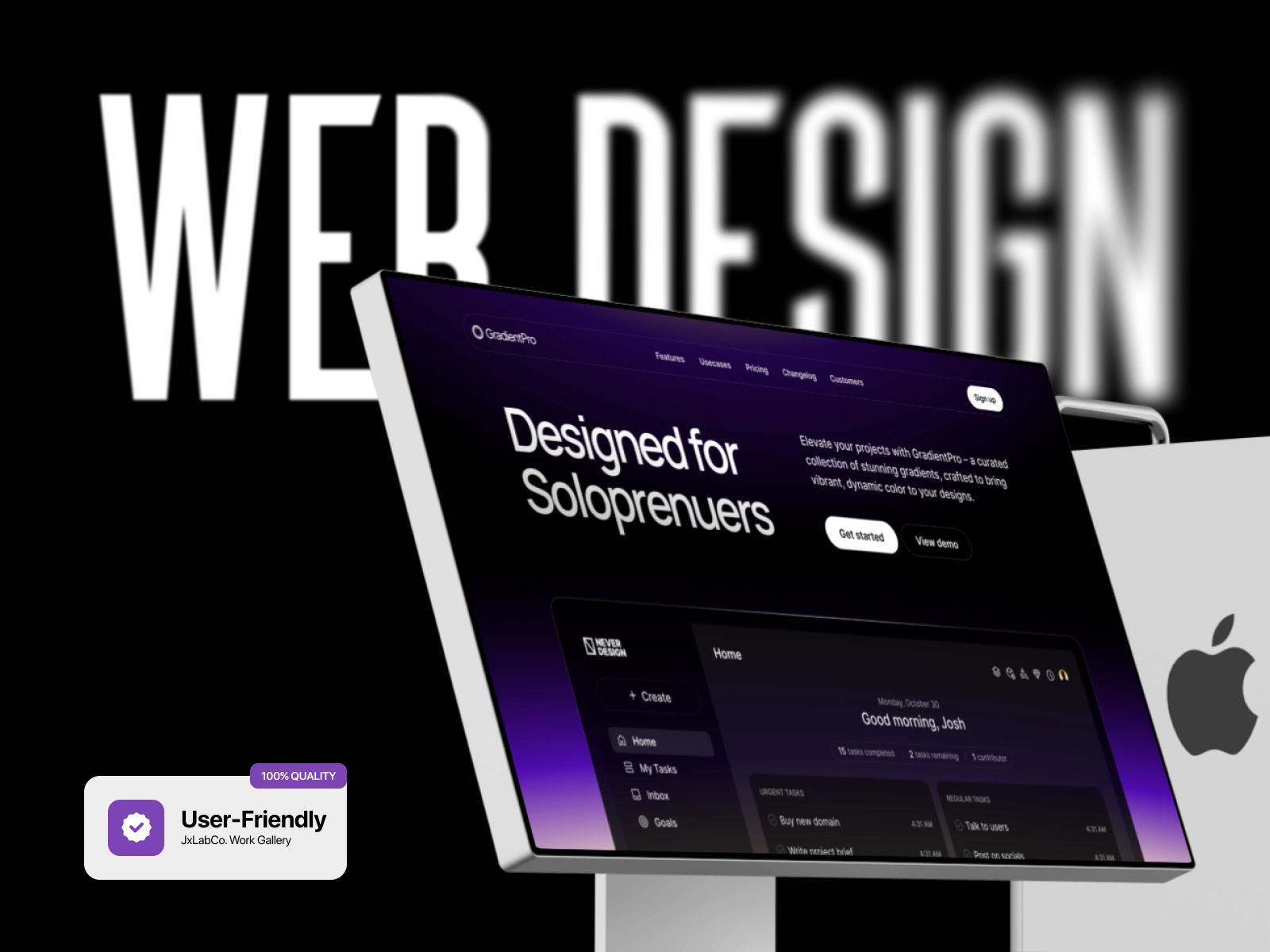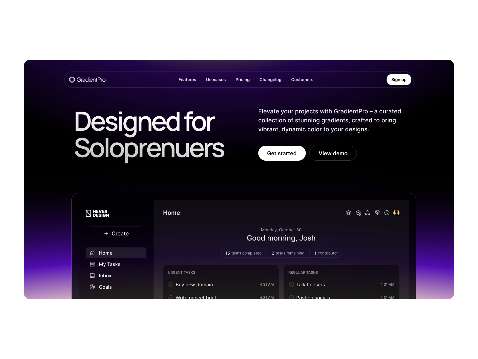 GradientPro, a tool offering curated color gradients, needed a powerful landing page to target its core audience: solopreneurs and designers. The objective was to convey professionalism and utility while emphasizing the creative, dynamic value of their product.