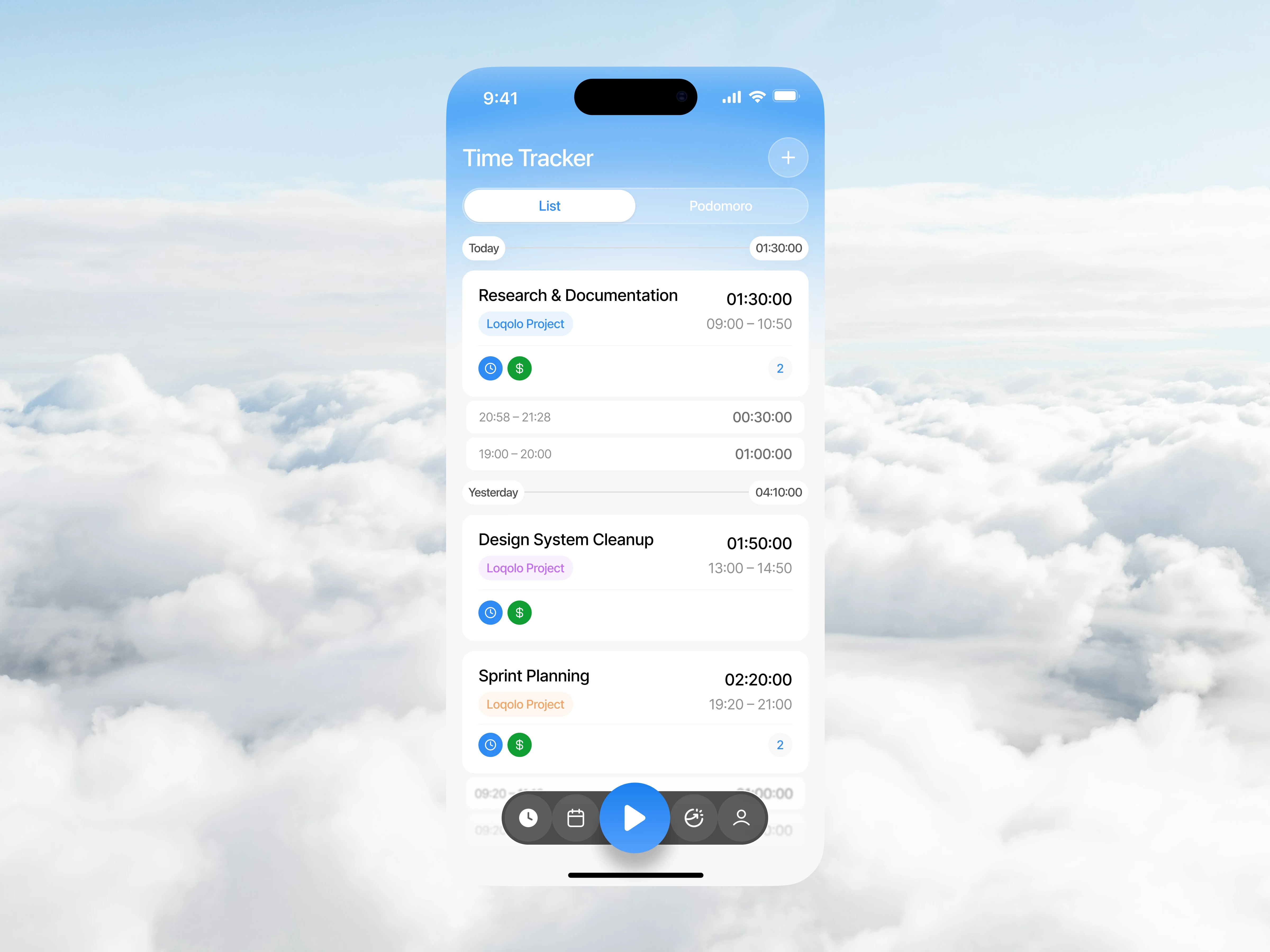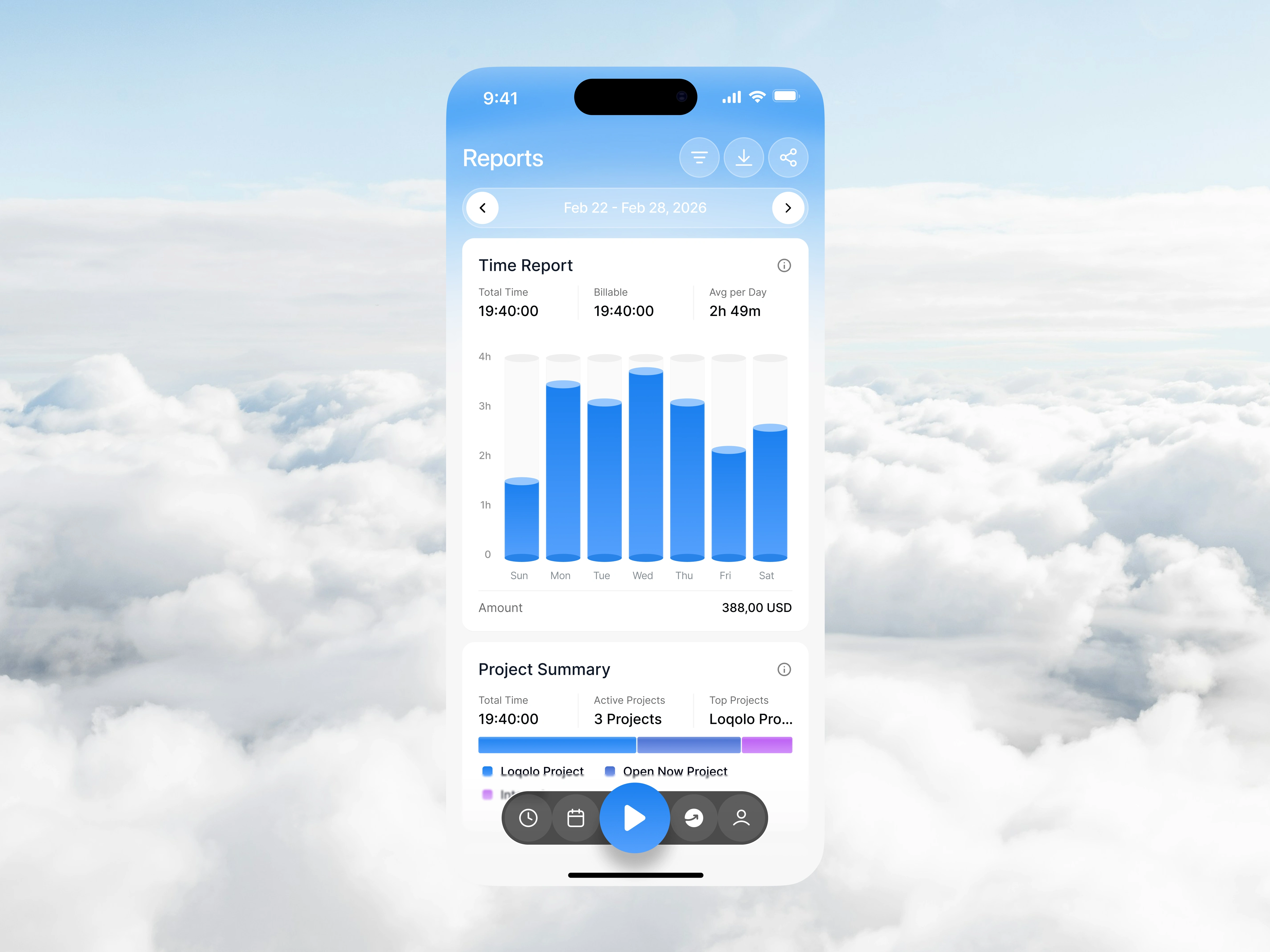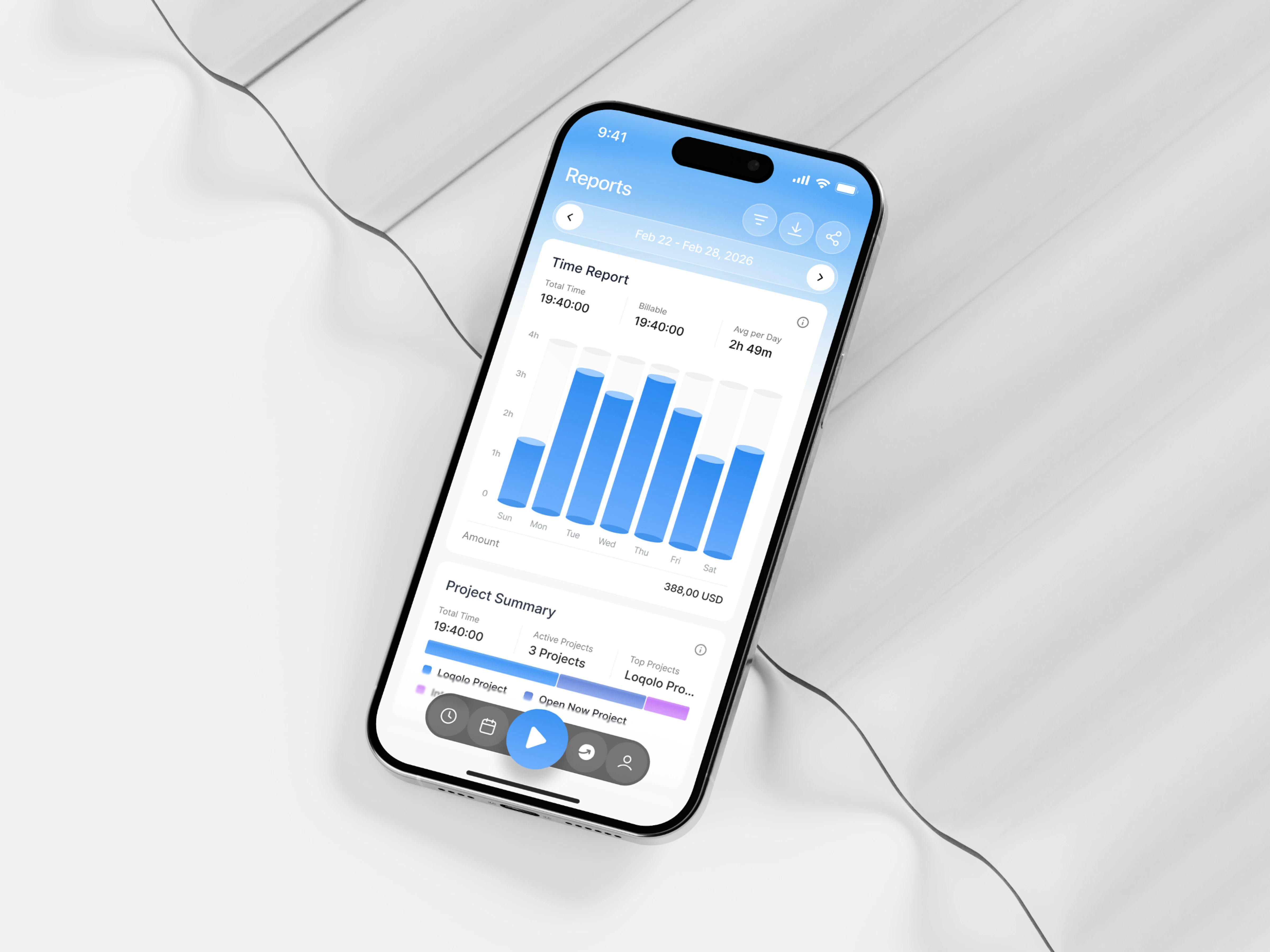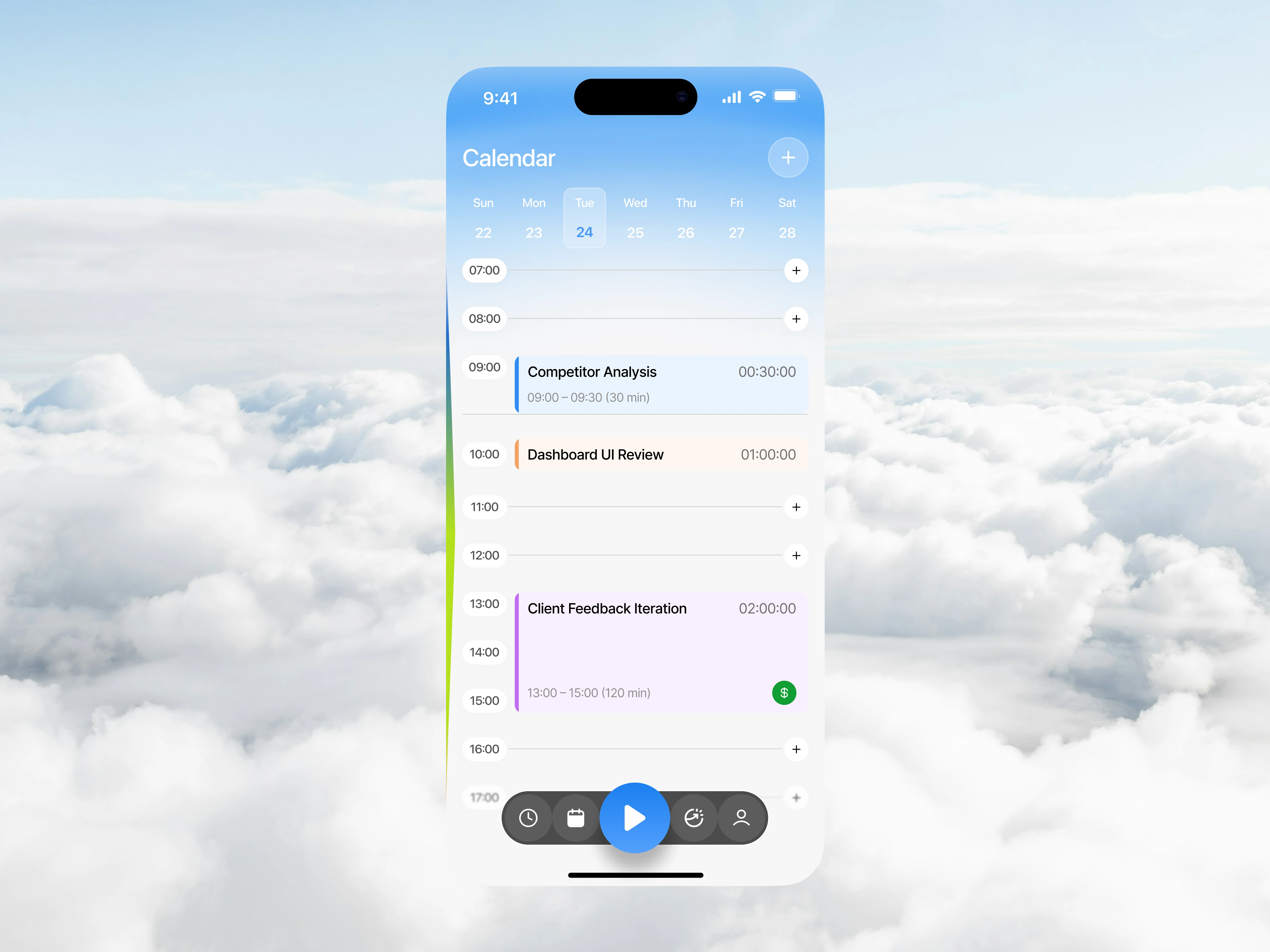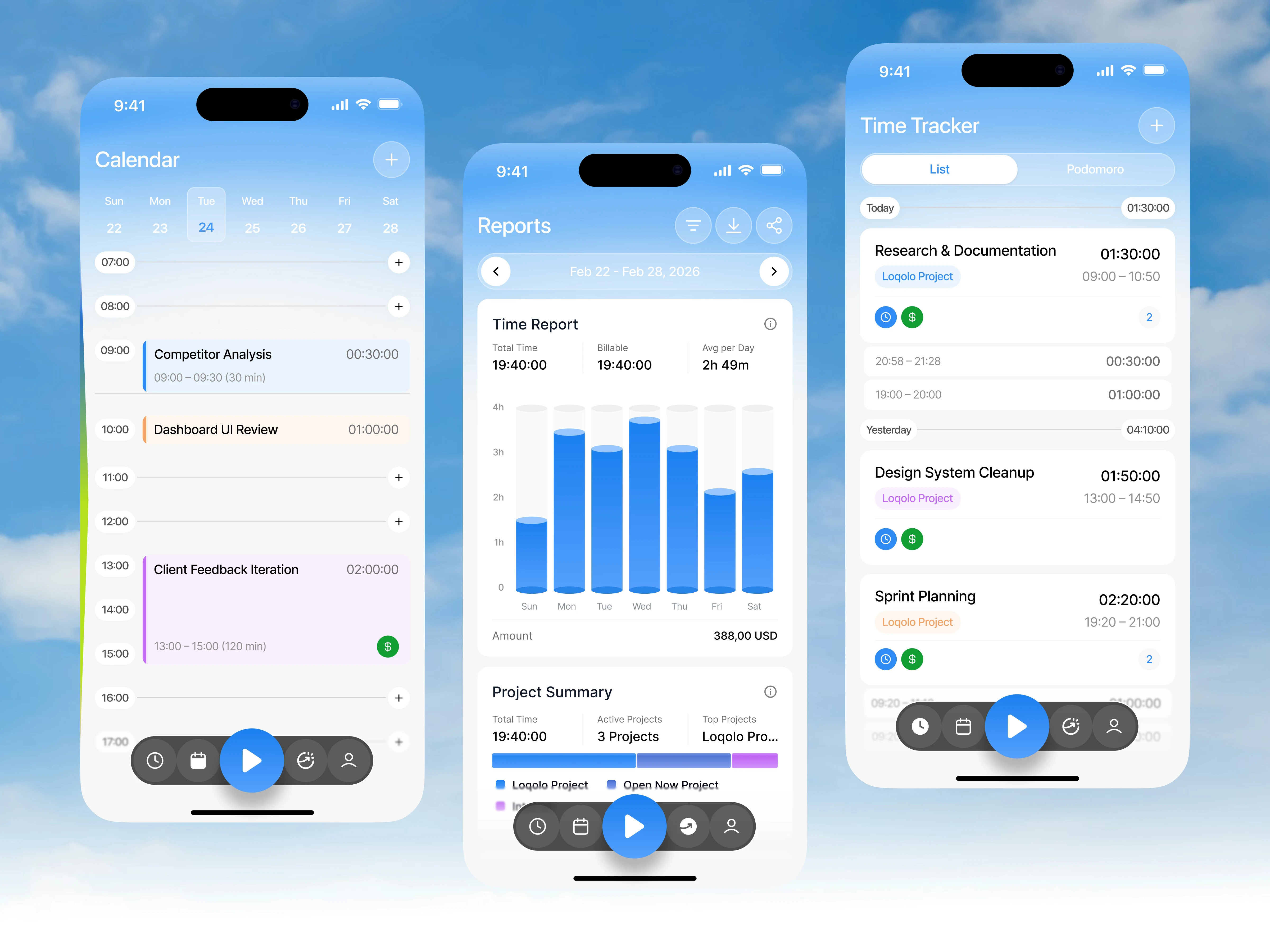 This Time Tracker Mobile App is designed to help users monitor, manage, and optimize their daily productivity through a clean and structured interface. The design focuses on clarity, accessibility, and efficiency—combining time tracking, calendar scheduling, and performance analytics into a seamless mobile experience. With a soft gradient aesthetic and minimal visual noise, the interface creates a calm environment that supports focus and decision-making.