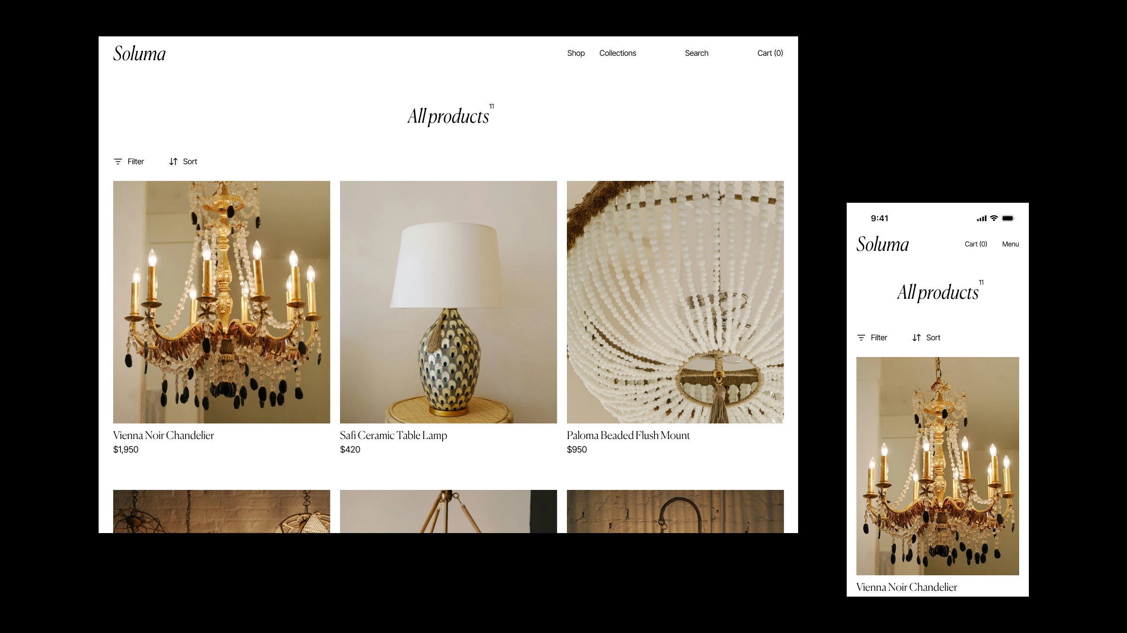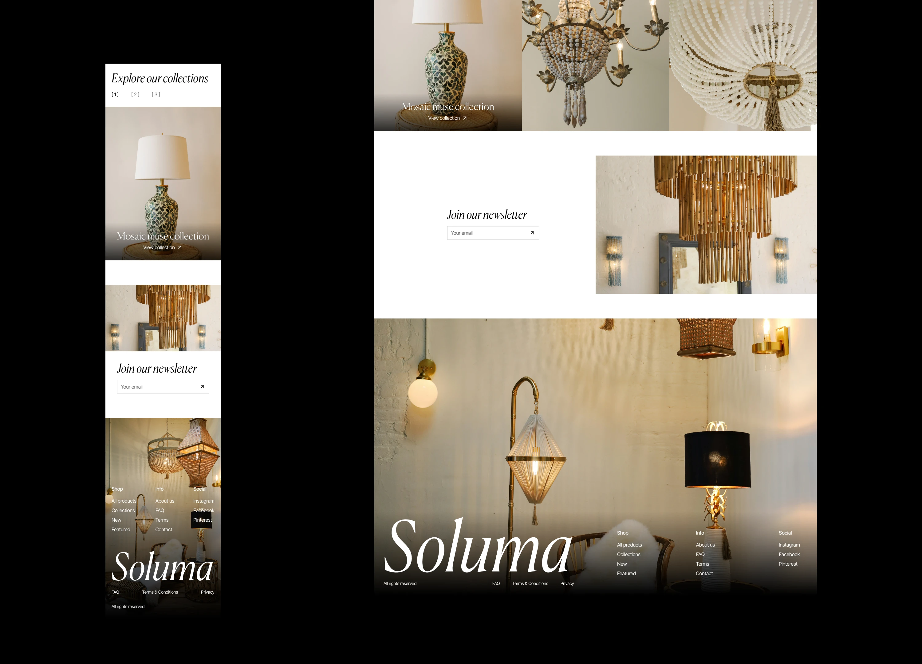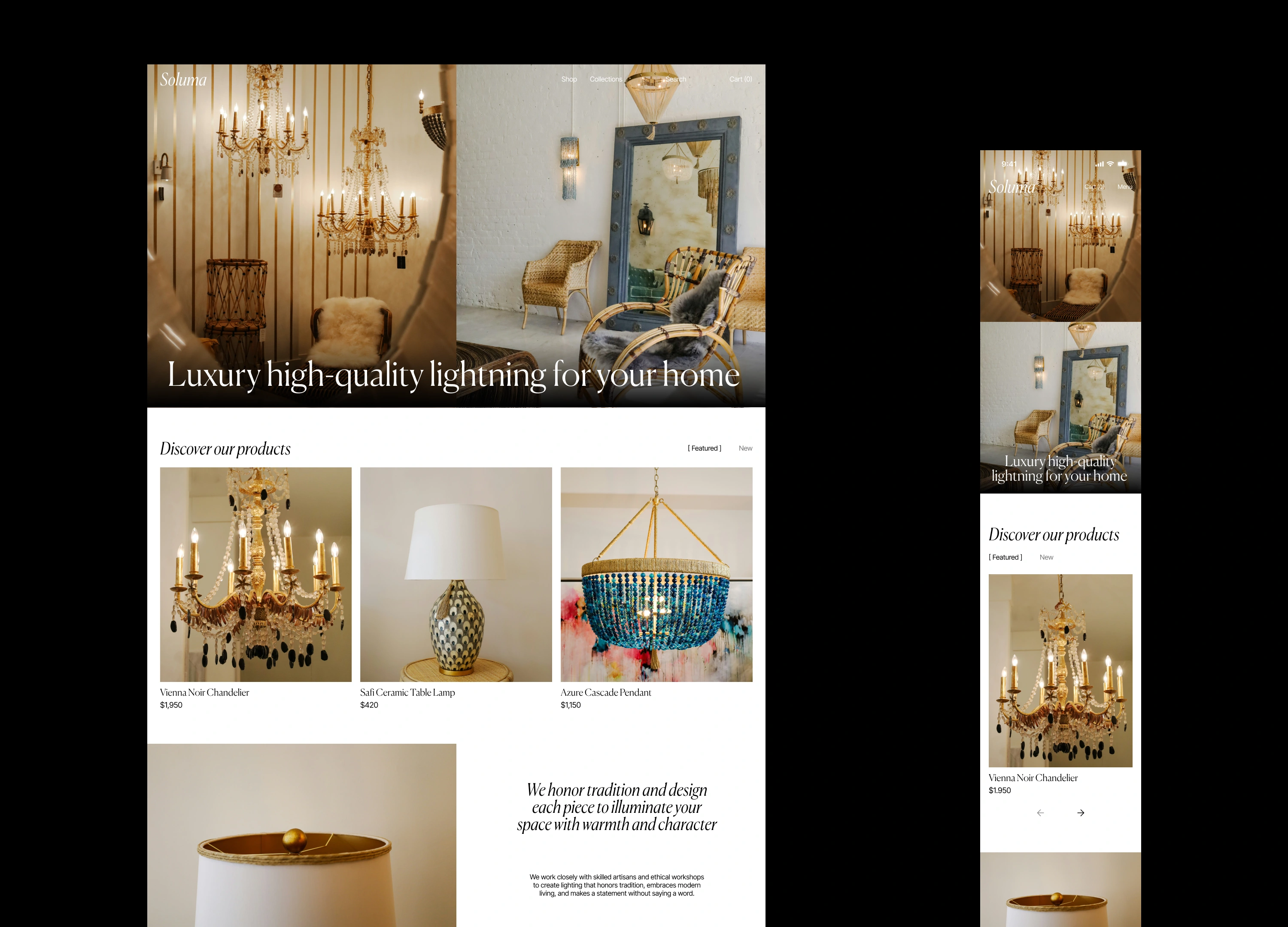 The goal was to create a visually appealing e-commerce site for a vintage, luxurious lighting company. The design blends elegance and functionality, allowing the brand’s handcrafted chandeliers, pendants, and lamps to take center stage. Clean layouts, high-quality photography, and refined typography work together to highlight the artistry and detail of each piece. The site’s structure ensures an intuitive shopping experience, while maintaining the sophistication expected from a premium lighting brand.