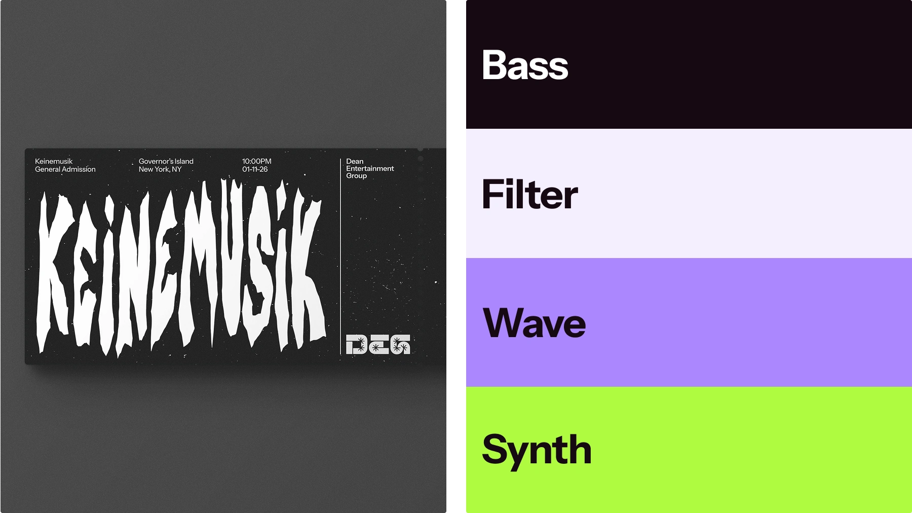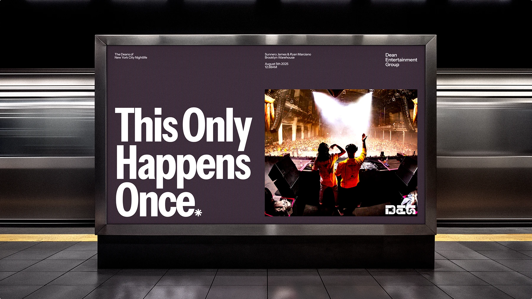 Dean Entertainment Group has produced live music events across the tri-state area for over 40 years. As they prepared to book bigger acts and expand into California and Florida, they needed to formalize their brand for the first time. One that signaled legacy and credibility without competing with their event partners.