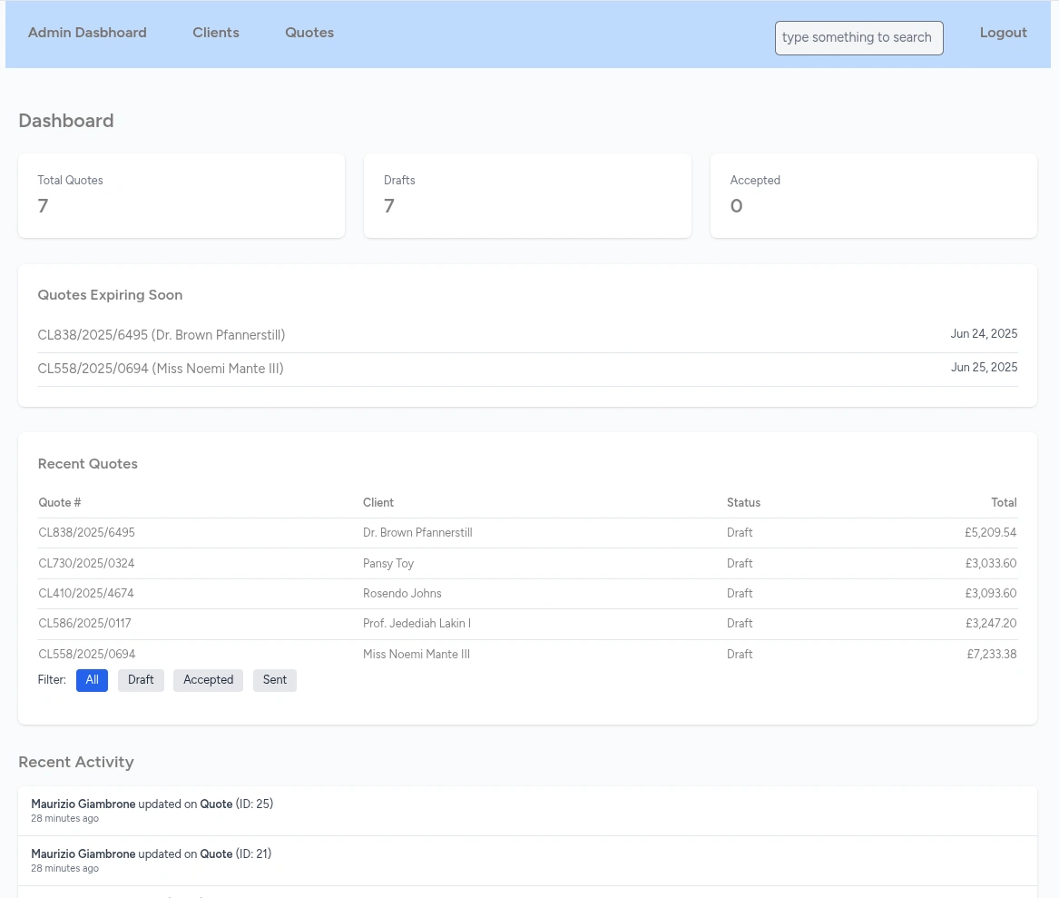 Laravel application allowing users to create, manage, and send professional quotes. Dynamic quote builds, PDF generation with branding, and email functionality.