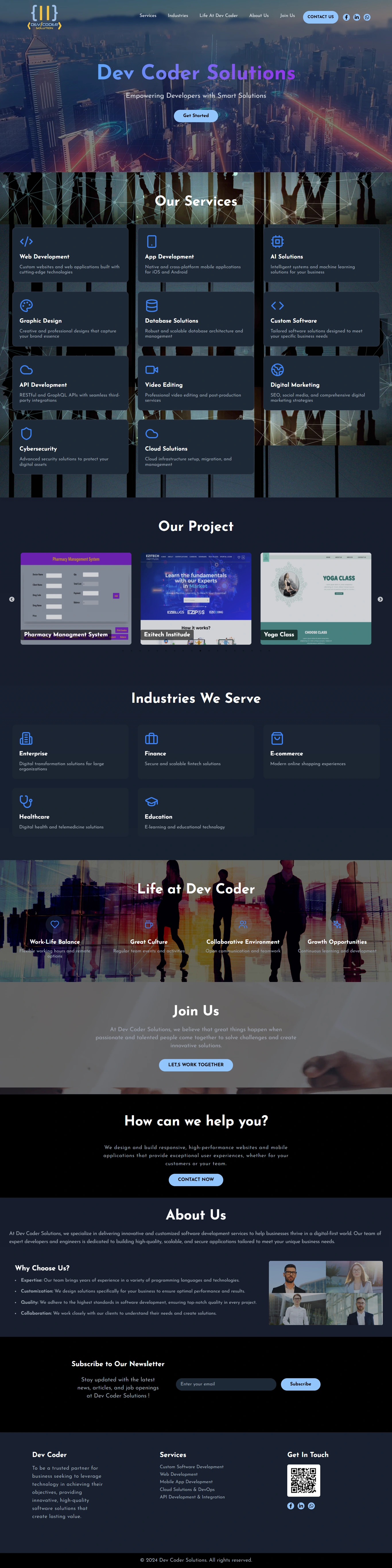DevCoder is a modern tech solutions brand focused on delivering custom web applications, business websites, and automation systems. The goal was to build a scalable digital presence that demonstrates technical expertise, clean design, and problem-solving for global clients. Unlike traditional WordPress sites, we developed this project in React, ensuring maximum performance, flexibility, and long-term scalability.