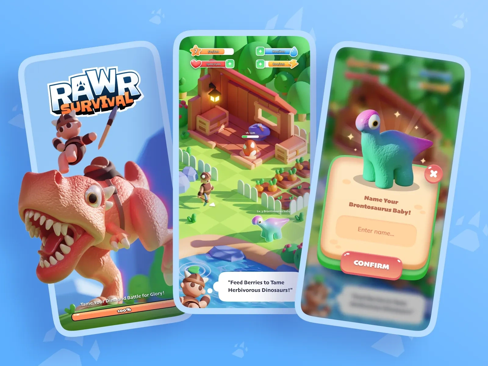 A vibrant 3D survival sim UI featuring clay-style art. Includes splash screens, resource management HUDs, and pet evolution flows. Tame your dino today! 🦖