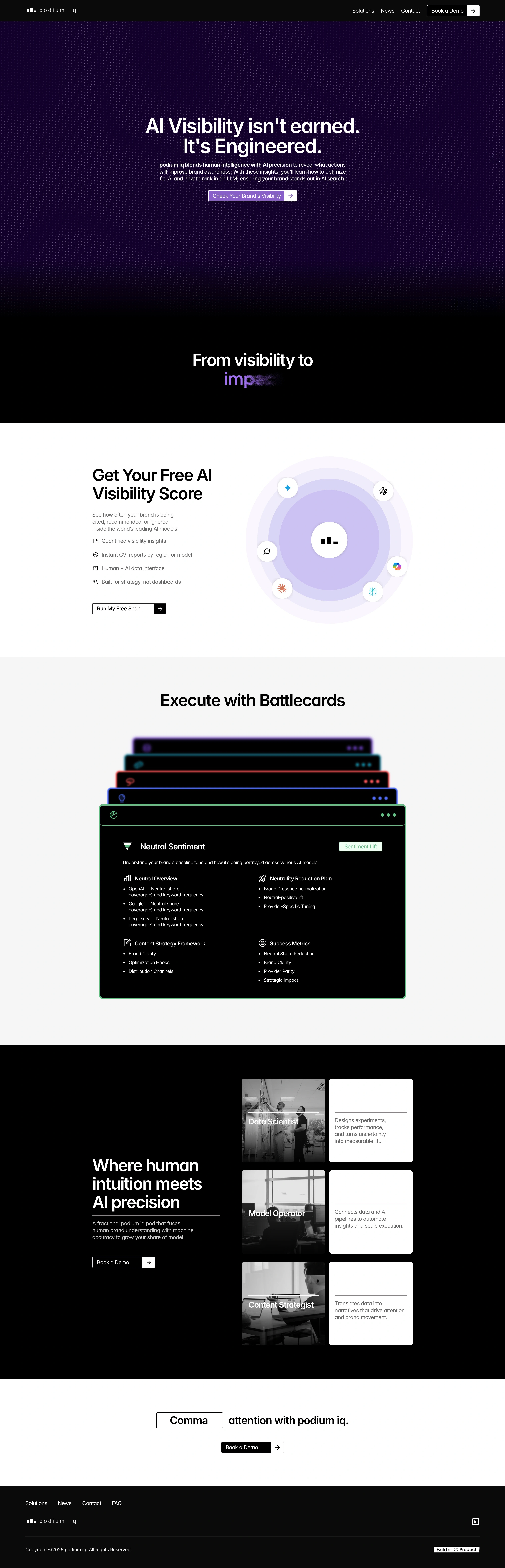 Podium IQ is an AI analytics platform that helps brands understand how language models perceive them. The original experience made the product feel abstract and overly technical, so my goal was to translate that complexity into a visual language that felt clear, immersive, and instantly understandable.
