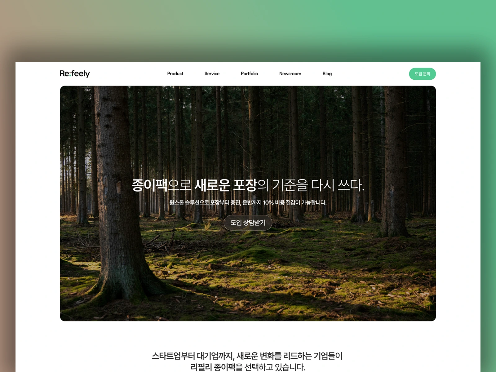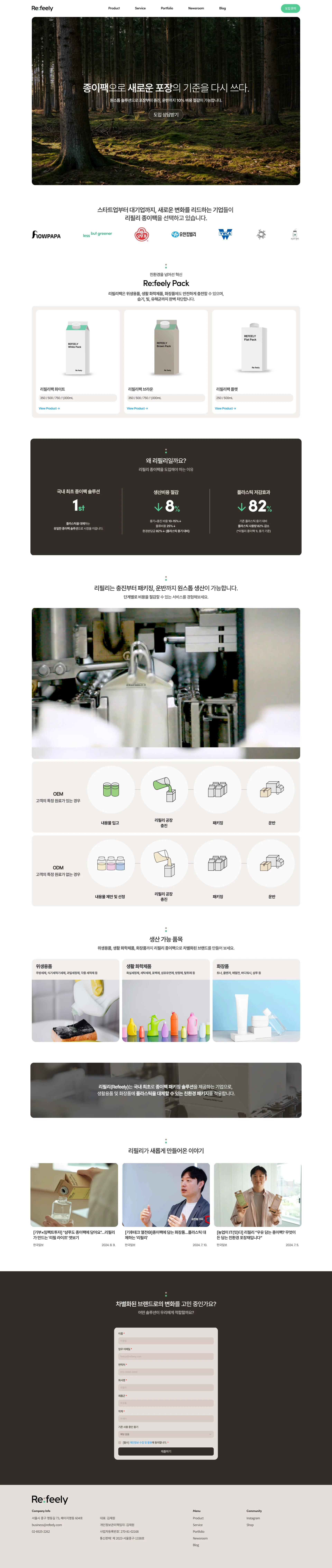 The Re:feely B2B website was designed to clearly communicate the brand philosophy of an eco-friendly packaging company through nature-inspired visuals and a clean, structured layout. A forest-themed hero section embodies sustainability and harmony with nature, while the warm palette of white and brown tones conveys reliability and approachability. The site’s information architecture is intuitively organized, with icons, videos, and real-world case studies highlighting the practicality and versatility of the products. Despite being a B2B platform, the design incorporates a soft, emotional touch — effectively bridging professionalism with a sense of purpose and environmental sincerity.