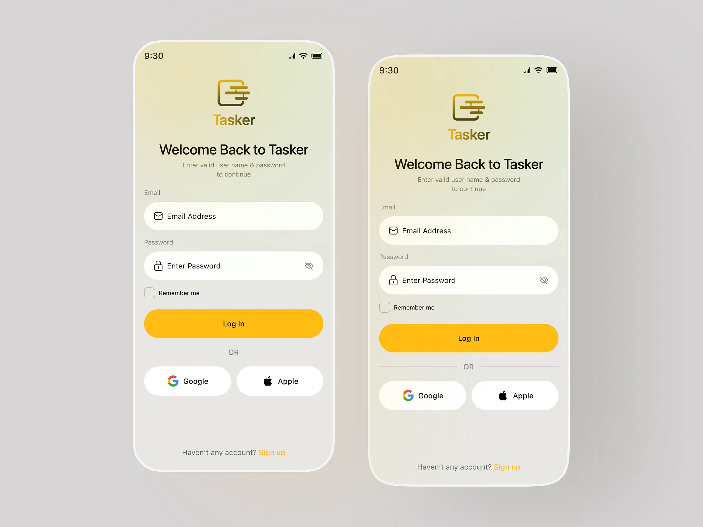 A clean and modern login & sign-up screen designed for a task management app. The interface focuses on simplicity, smooth authentication flow, and user-friendly input fields to help users get started quickly. Soft colors, rounded components, and clear hierarchy create a calm and productive first impression.