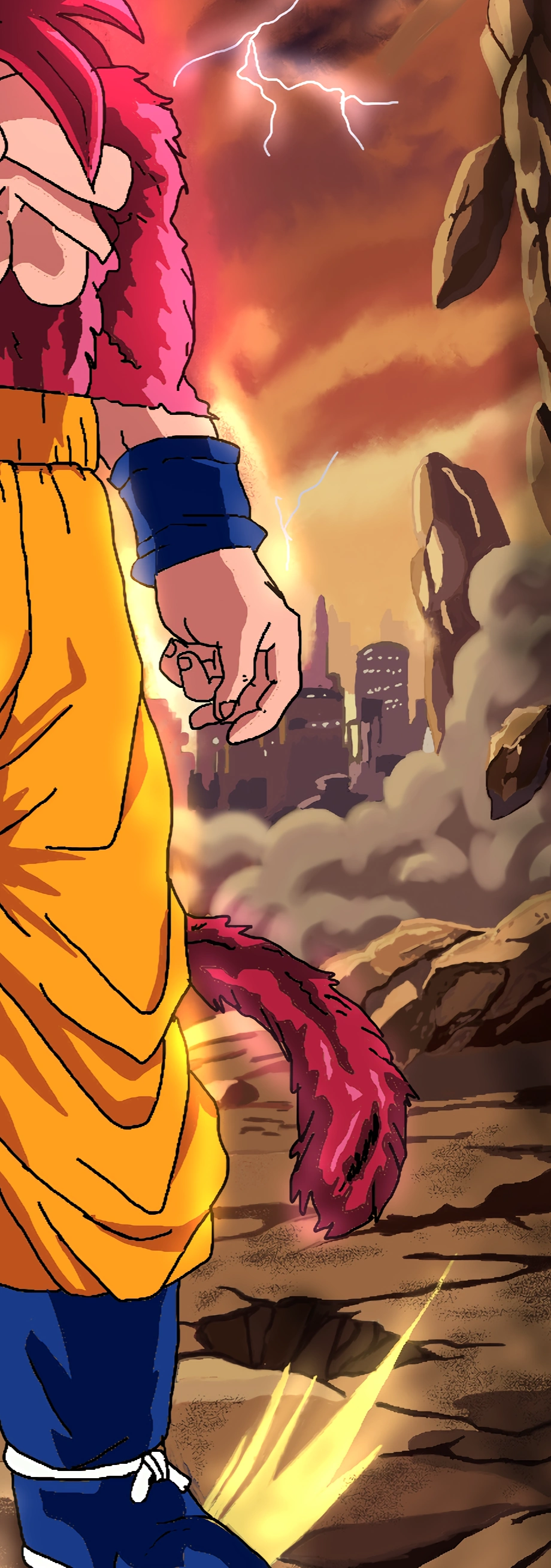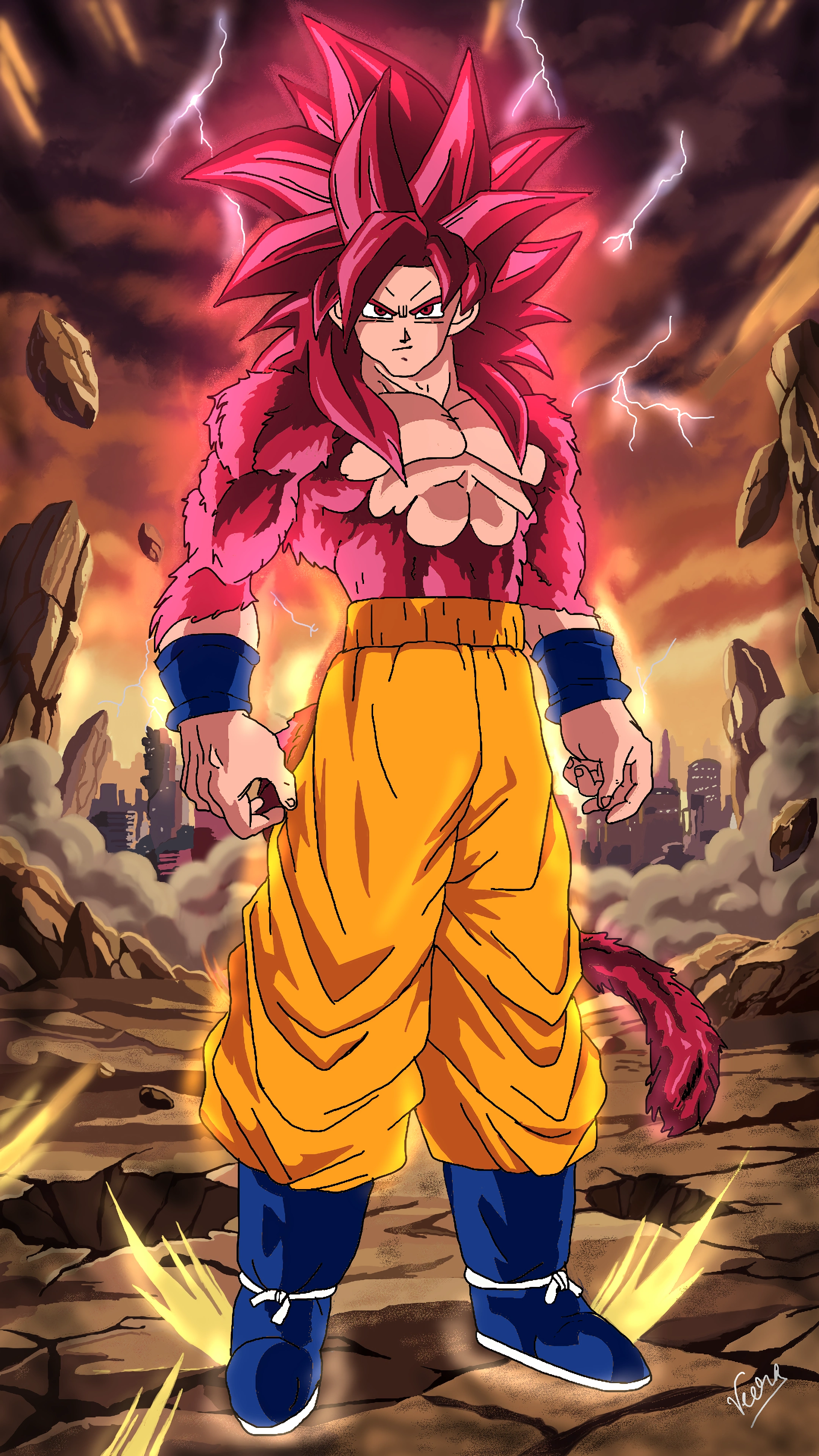 Project Overview: A high-fidelity digital illustration capturing the raw intensity of the Super Saiyan 4 transformation. This project highlights a multi-app mobile workflow, focusing on atmospheric world-building and dynamic lighting. The Workflow: Asset & Environment Creation (PENUP): Every element of the composition—including the shattered terrain, floating debris, and the lightning-streaked sky—was hand-drawn from scratch. I focused on using atmospheric perspective to create depth between the character and the distant, hazy cityscape. Technical Polishing & Mastering (Ibis Paint X): The core artwork was imported for final post-processing. I utilized advanced layering and blending modes (Add/Overlay) to refine the "glow" of the aura and ensure the highlights on the character's fur matched the environmental light sources. Technical Skills Demonstrated: Hand-drawn environment design Layer management and non-destructive editing Advanced lighting and color grading Character rendering and cel-shading
