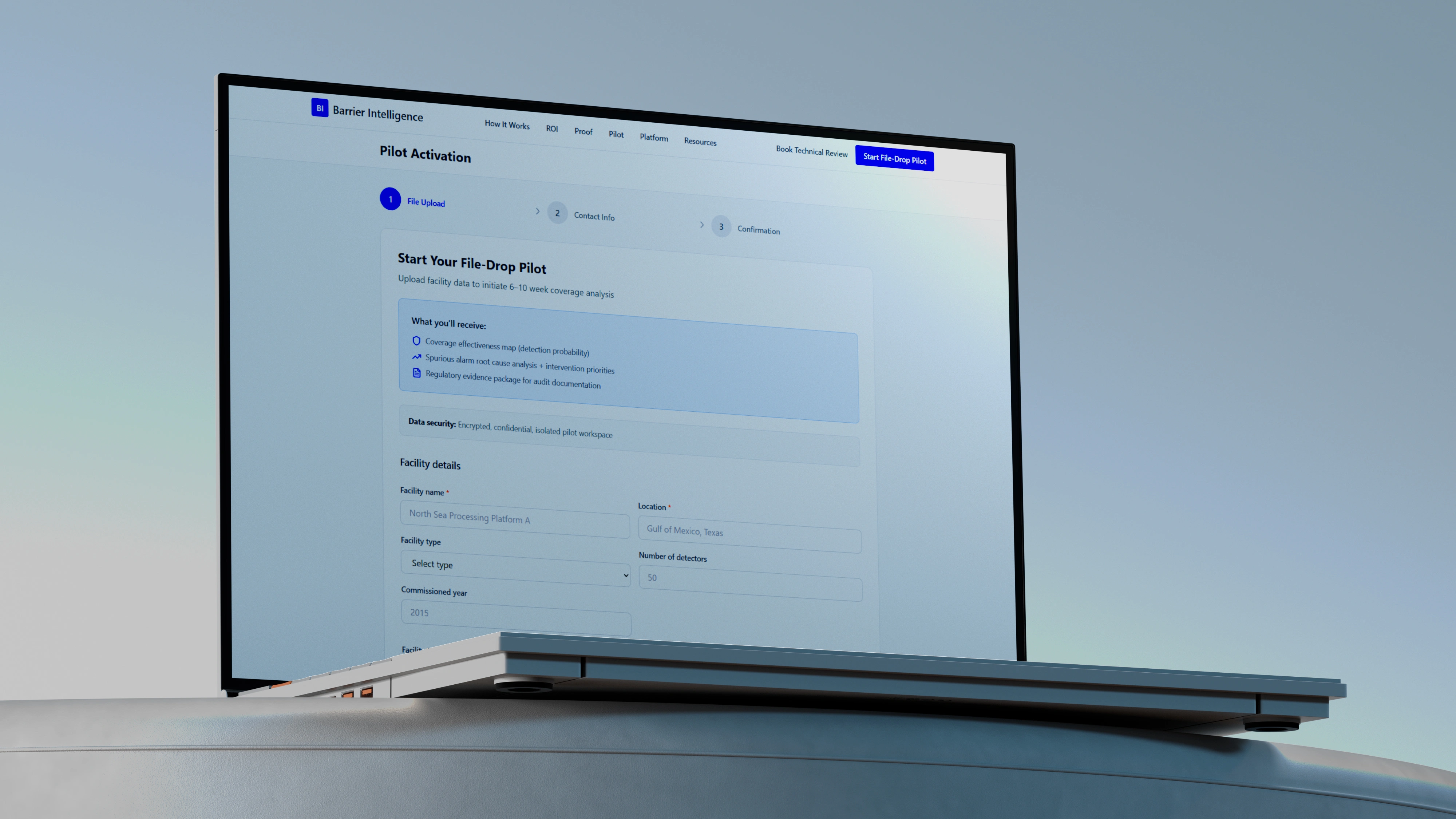 Barrier Intelligence helps oil & gas facilities turn static gas detection (≈60% effective) into live safety intelligence by making the invisible “designed once, degrading daily” gap measurable. The pilot activation experience is engineered to convert skeptical technical buyers by leading with hard ROI (spurious alarm waste) and backing every claim with physics-based, vendor-agnostic evidence.