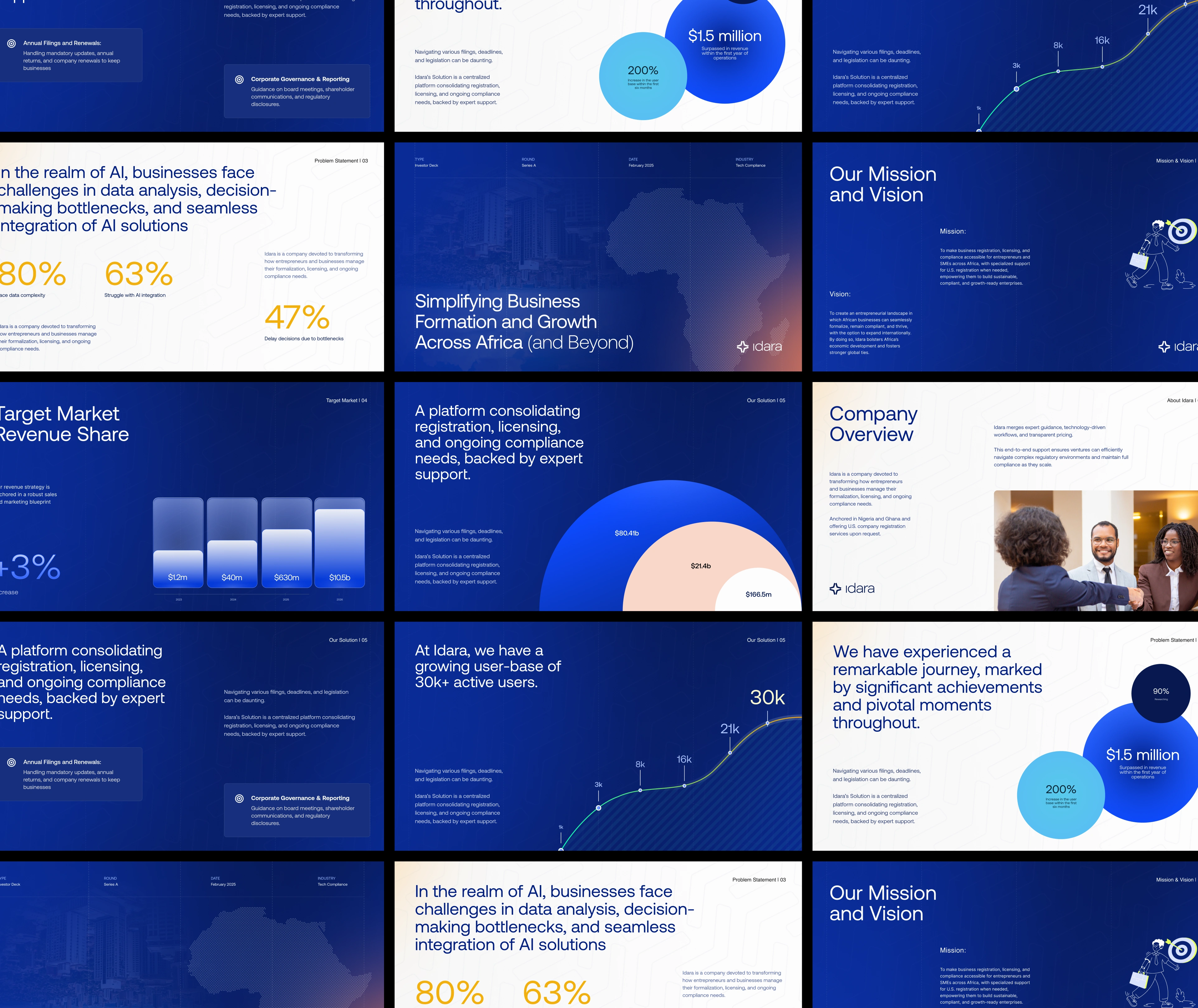 Idara needed a professional, engaging deck to simplify complex compliance concepts and effectively communicate its value to clients, investors, and regulatory stakeholders.