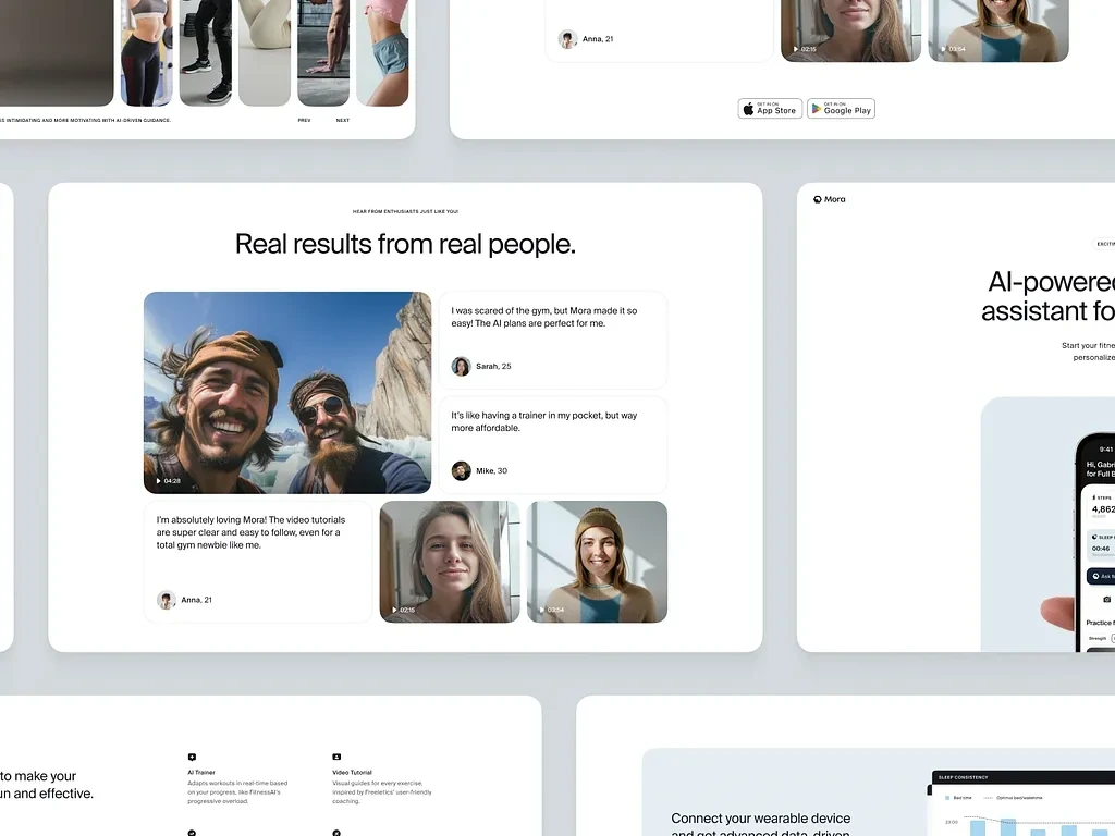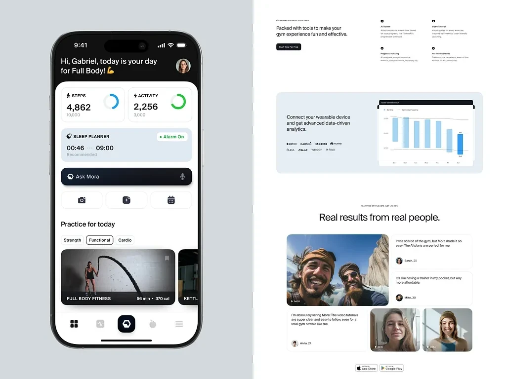 Our fitness website design for Mora emphasizes accessibility and confidence-building through clear messaging, strong social proof, and a clean interface. Key features include progress tracking, wearable integration, and real-time AI workout adjustments, creating a seamless sports AI app experience.