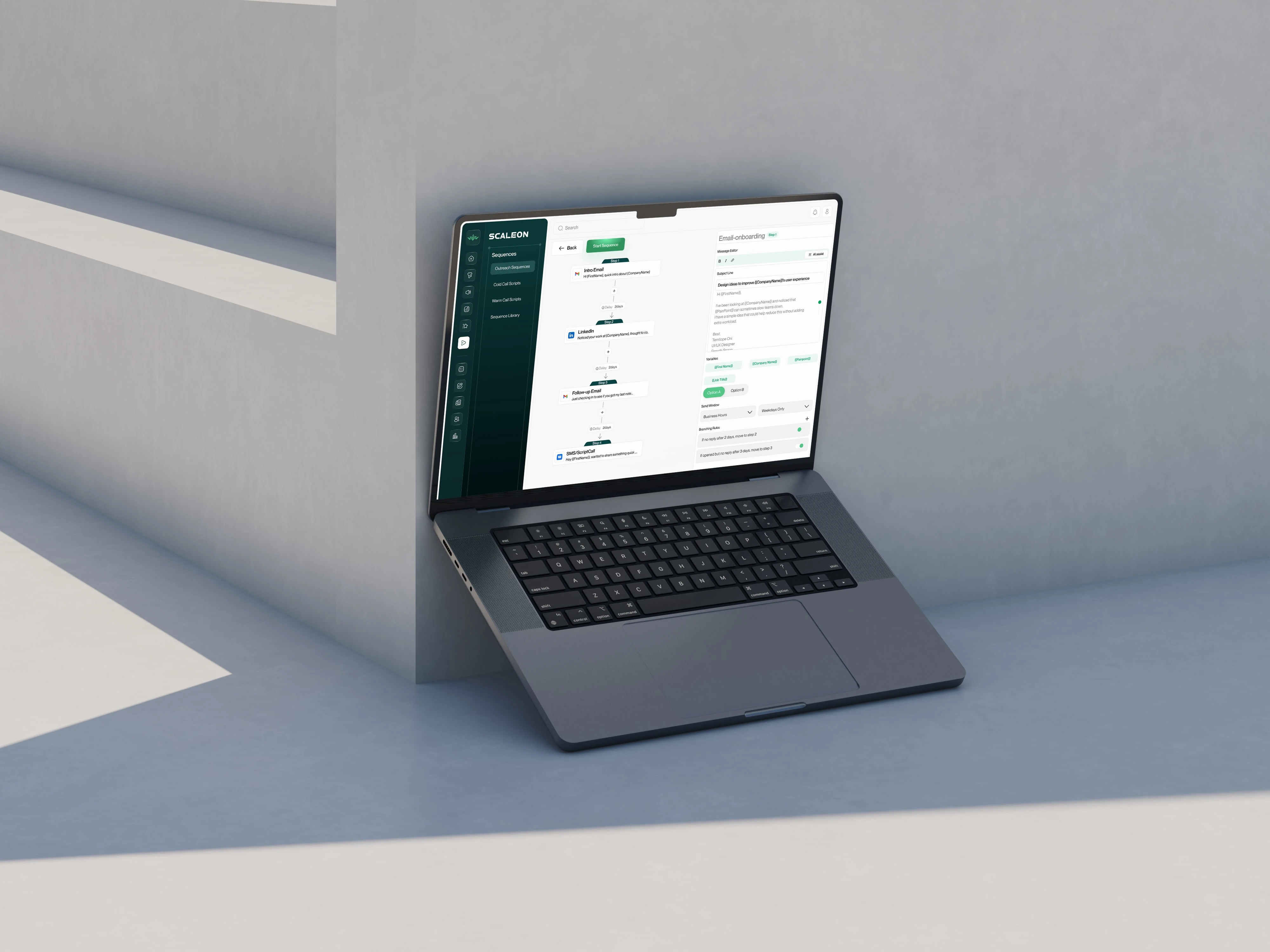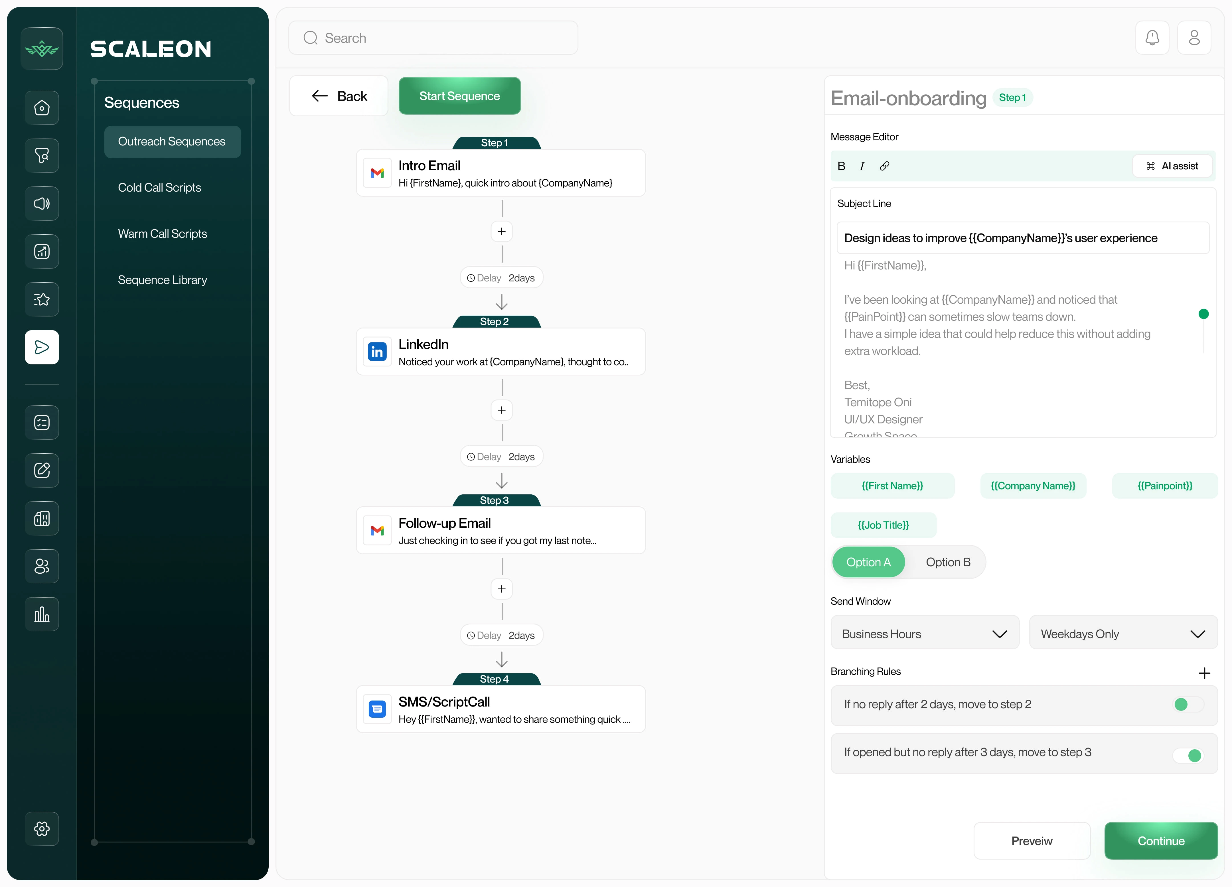 Solution:Sequence Builder (timeline, delays, A/B, “if opened but no reply → step X”), Validate for missing variables and send windows, Simulate and “Preview as {{Persona}}”.