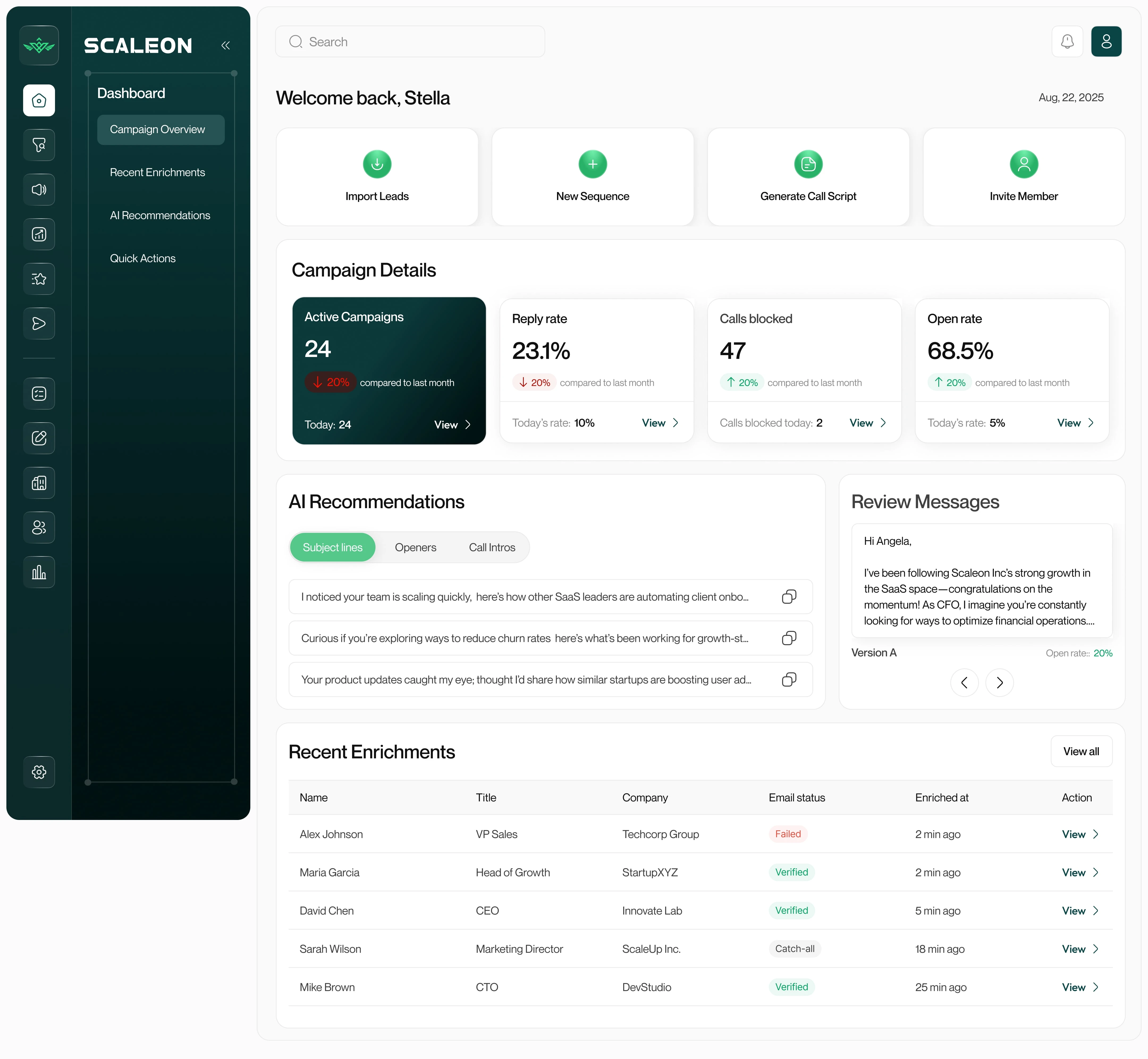 Scaleon is a lead enrichment, segmentation, and AI-personalization platform with multi-channel sequences. It unifies verified data (with citations), AI copy generation, and sequence orchestration into one workflow for sales teams and agencies Designed to help Sales teams and Team members.