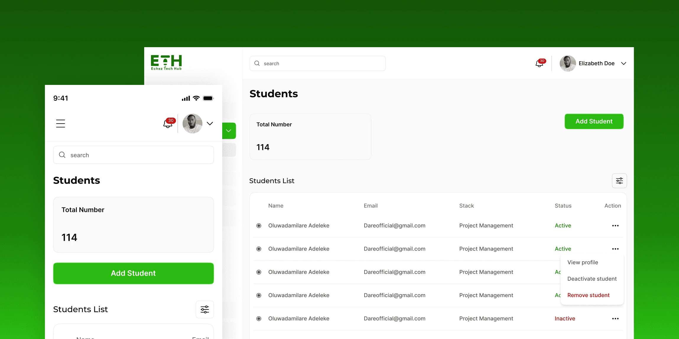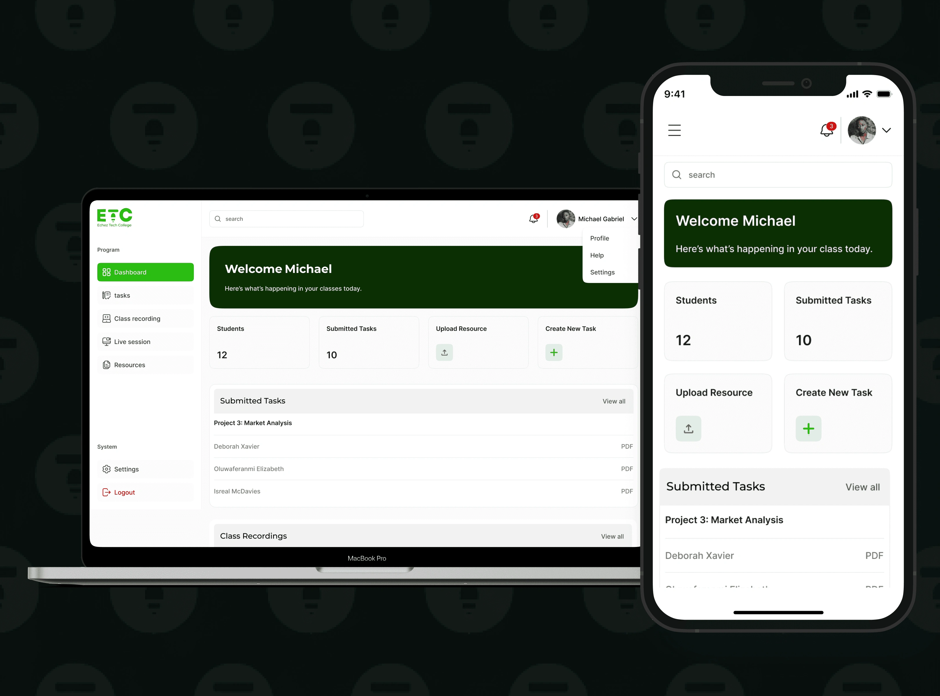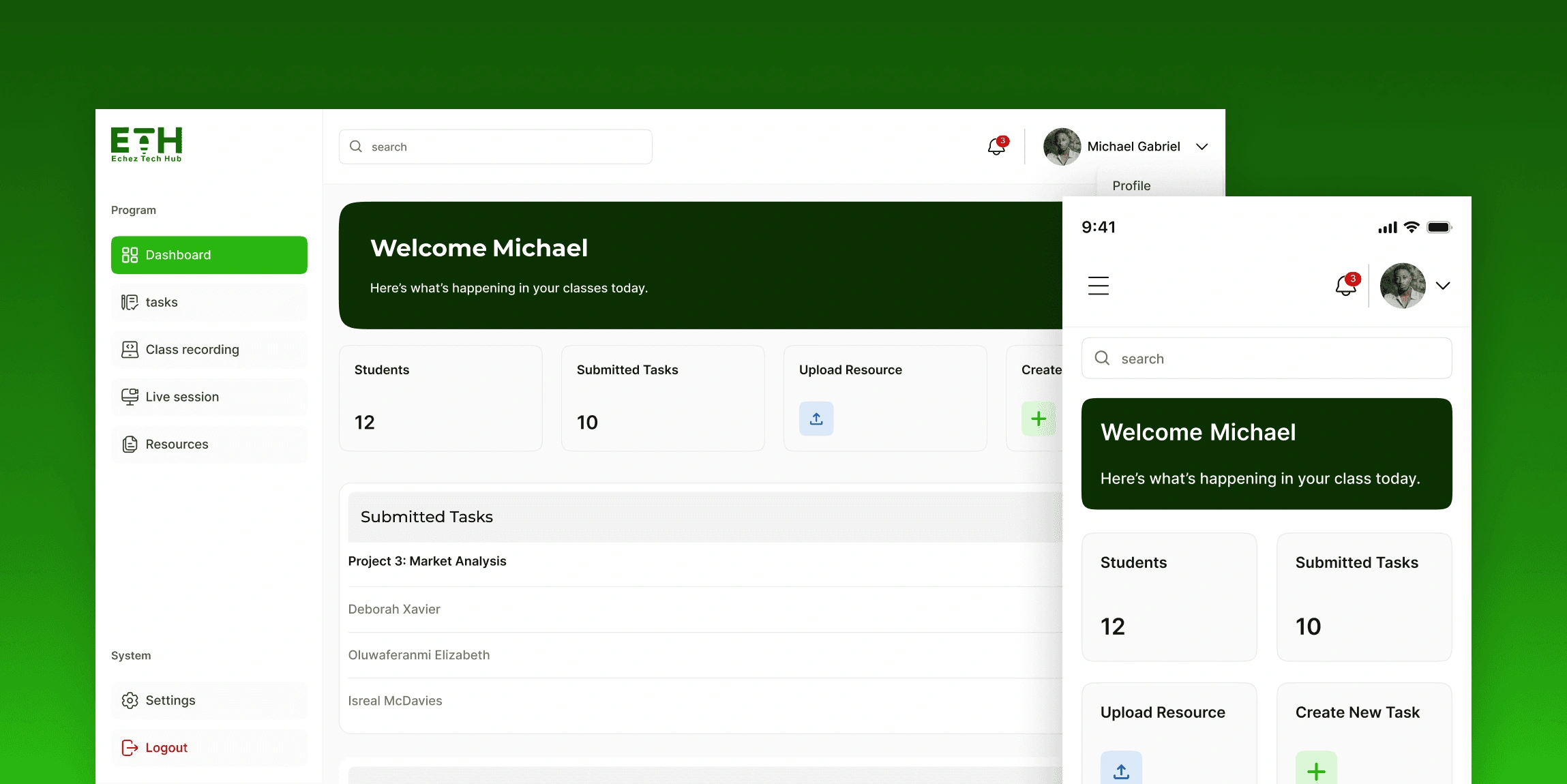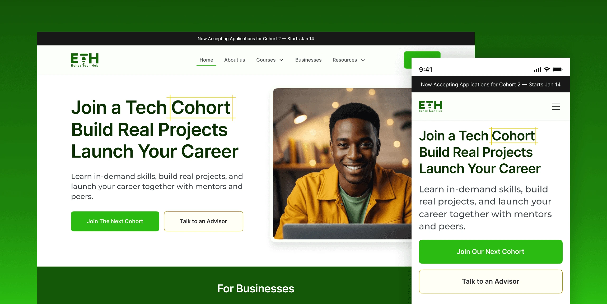 The goal was to design a clean, modern website and an Education Management System (EMS) for Echez Tech Hub, a training and tech services company. The website would help visitors quickly understand what Echez offers, explore courses, and contact the team, while the EMS would support students, tutors, and admins with a structured learning experience, clear task submissions, resources, and live session access.