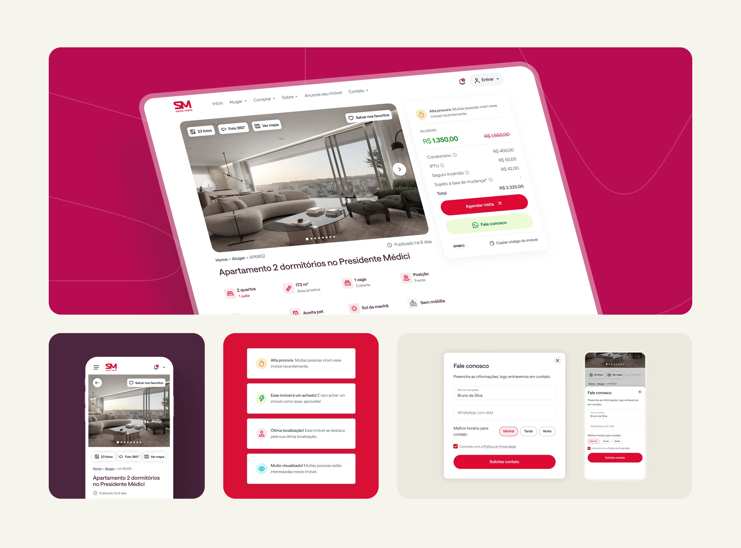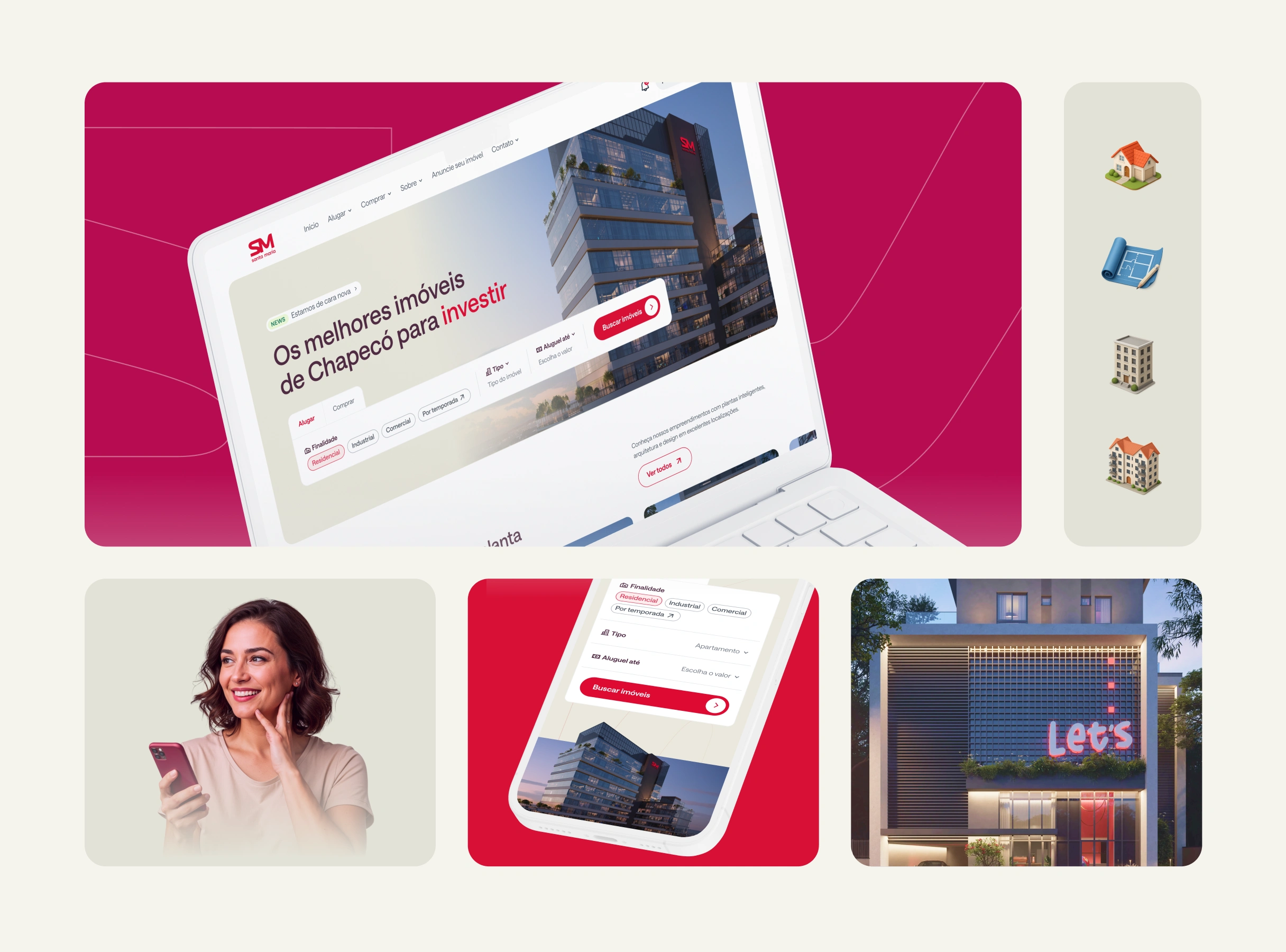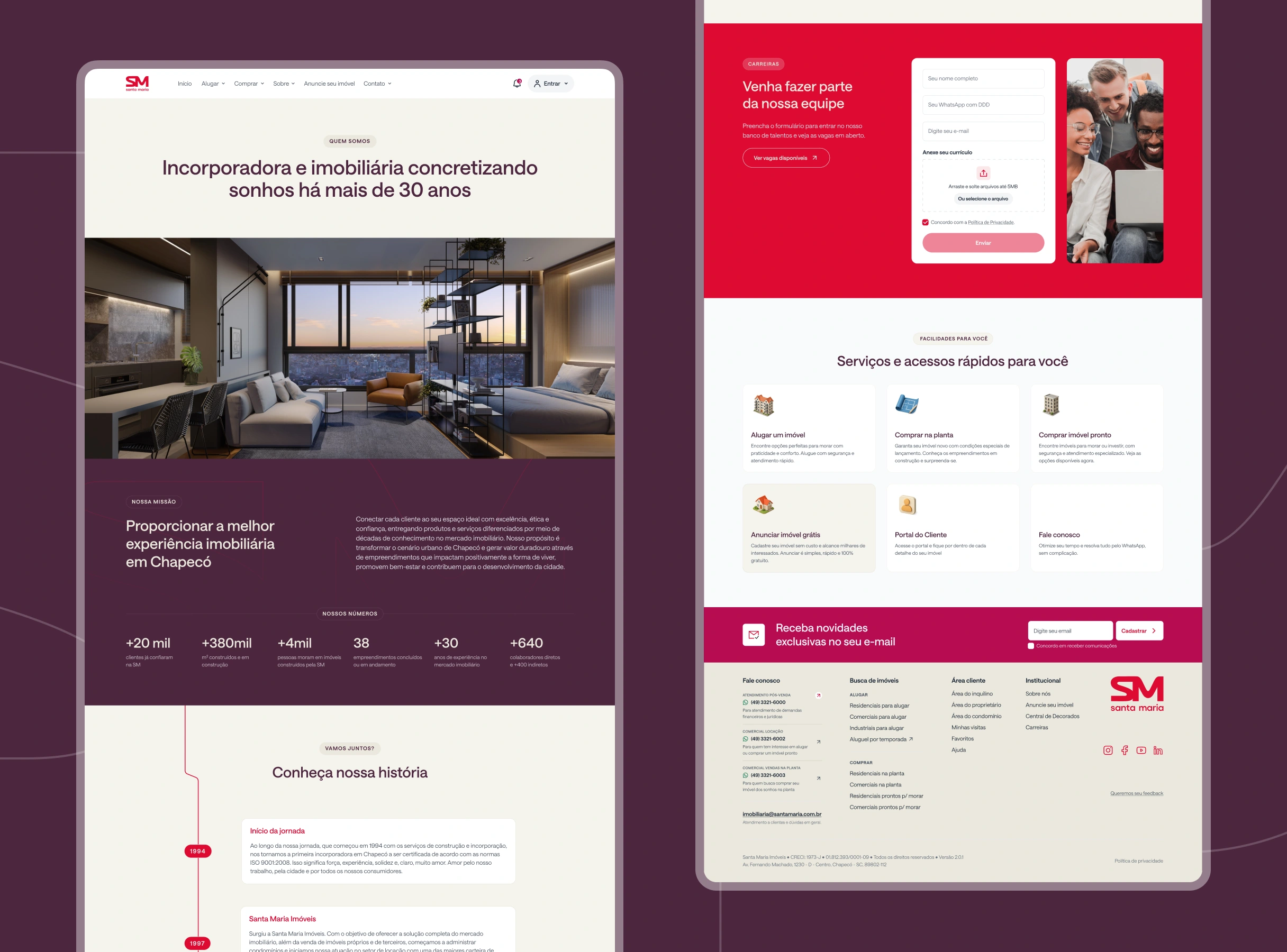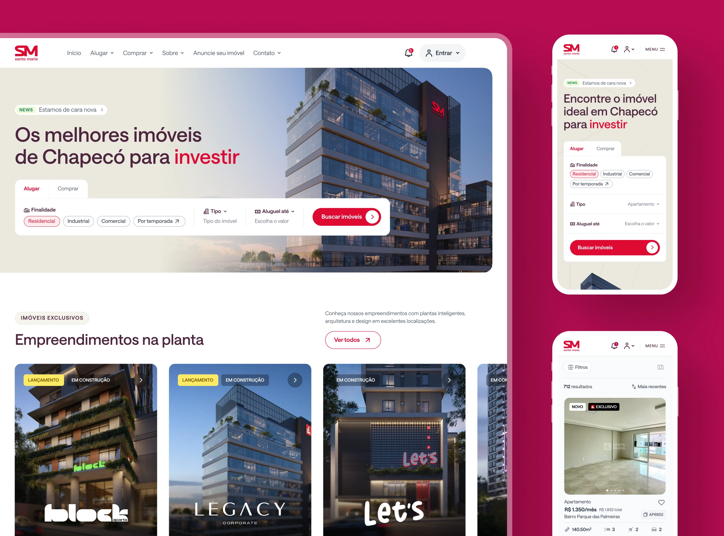 http://santamaria.com.br A dedicated interface redesign for Santa Maria, a prominent real estate and construction firm in Chapecó, Santa Catarina. As the company underwent a brand evolution, our role was to translate this new identity into a high-end digital interface tailored for Generation Z. The core challenge was to break away from traditional real estate layouts. We focused on crafting a visual language that balances the company's solid heritage in property development with a fresh, modern spirit that resonates with a younger, digital-native audience. Visual Execution Every interface element was designed to convey innovation and architectural precision: ↗︎ Strategic UX: Information architecture designed to simplify the complex real estate journey, ensuring a frictionless conversion funnel. ↗︎ Contemporary UI: A clean, bold aesthetic that prioritizes clarity and modern appeal. ↗︎ Mobile-First Experience: Seamless navigation with a focus on touch-friendly interactions.