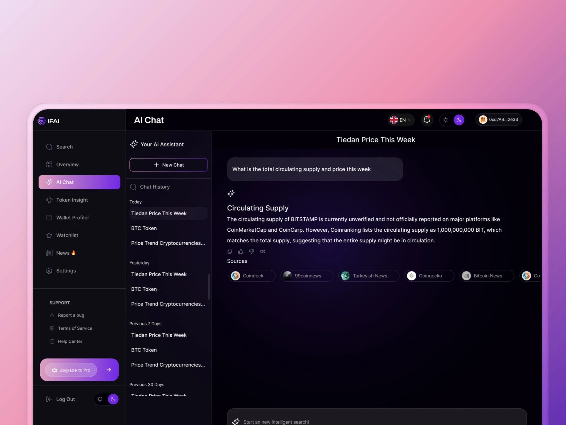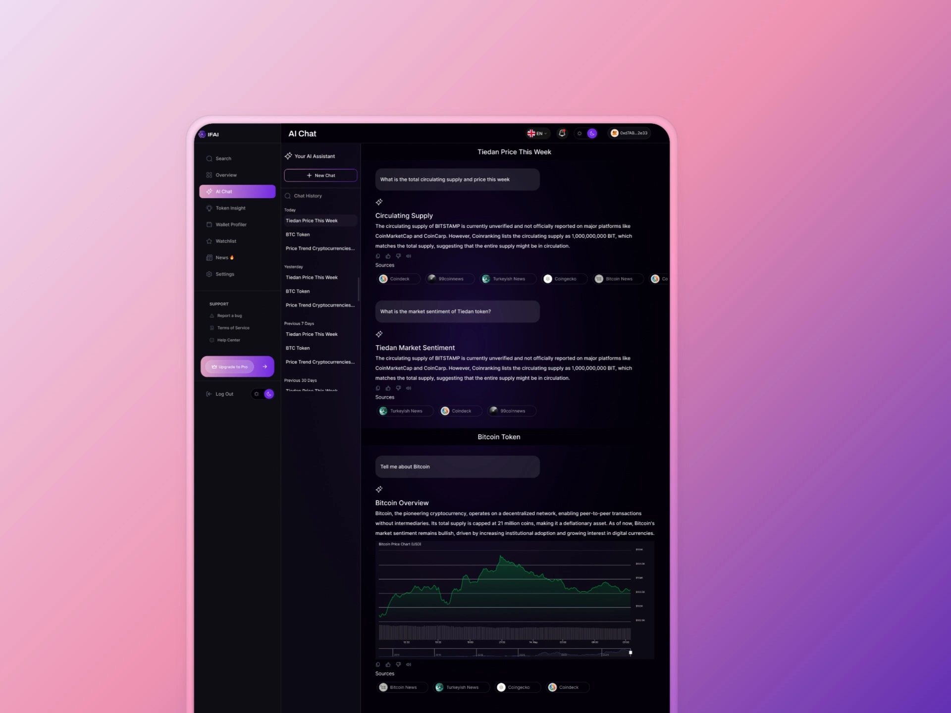 AI chat dashboard to get safety score & analysis report (such as price change, social sentiments, contract audit, etc) for selected token