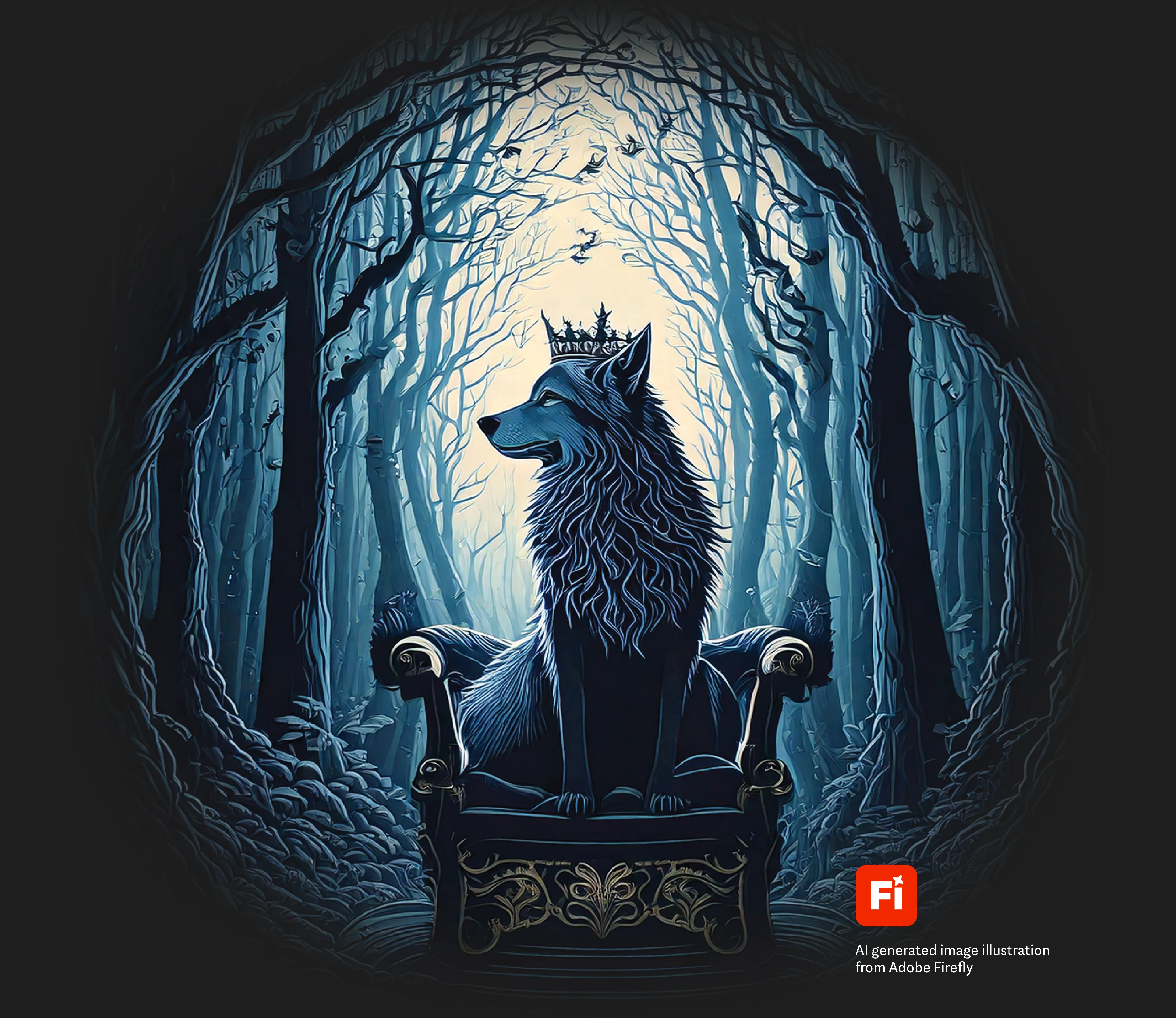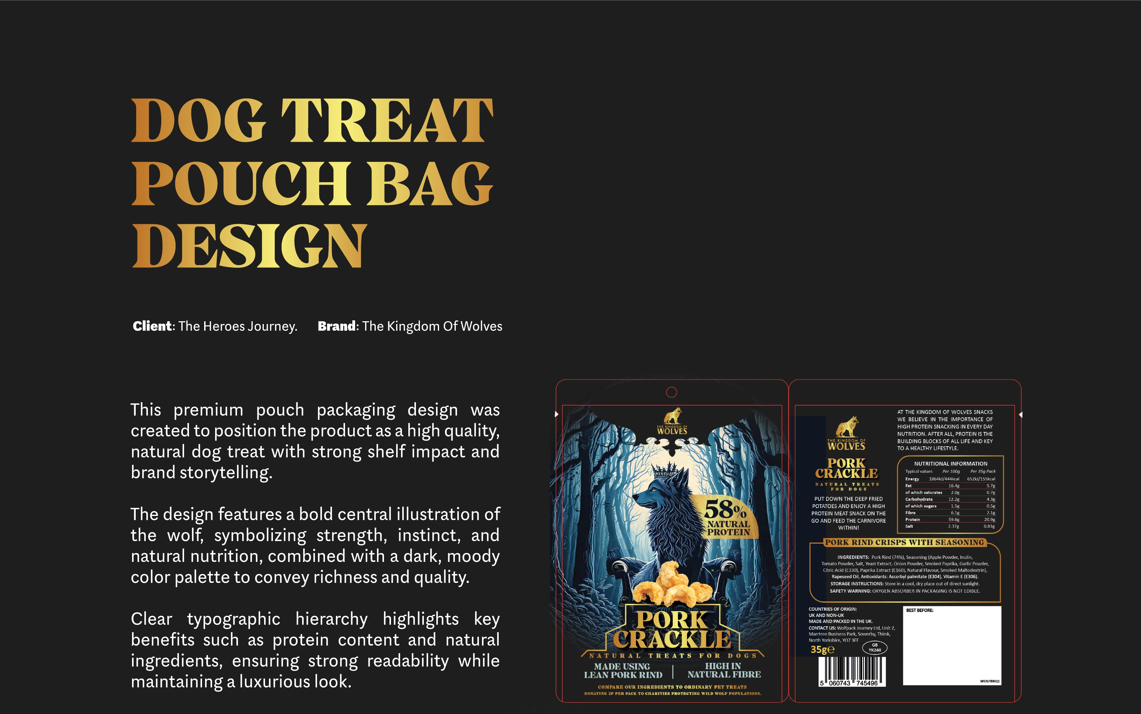 A pouch packaging design for dog treat designed to position the product as a high quality, natural dog treat with strong shelf impact and brand storytelling. The design features a bold central illustration of the wolf, symbolizing strength, instinct, and natural nutrition, combined with a dark, moody color palette to convey richness and quality.