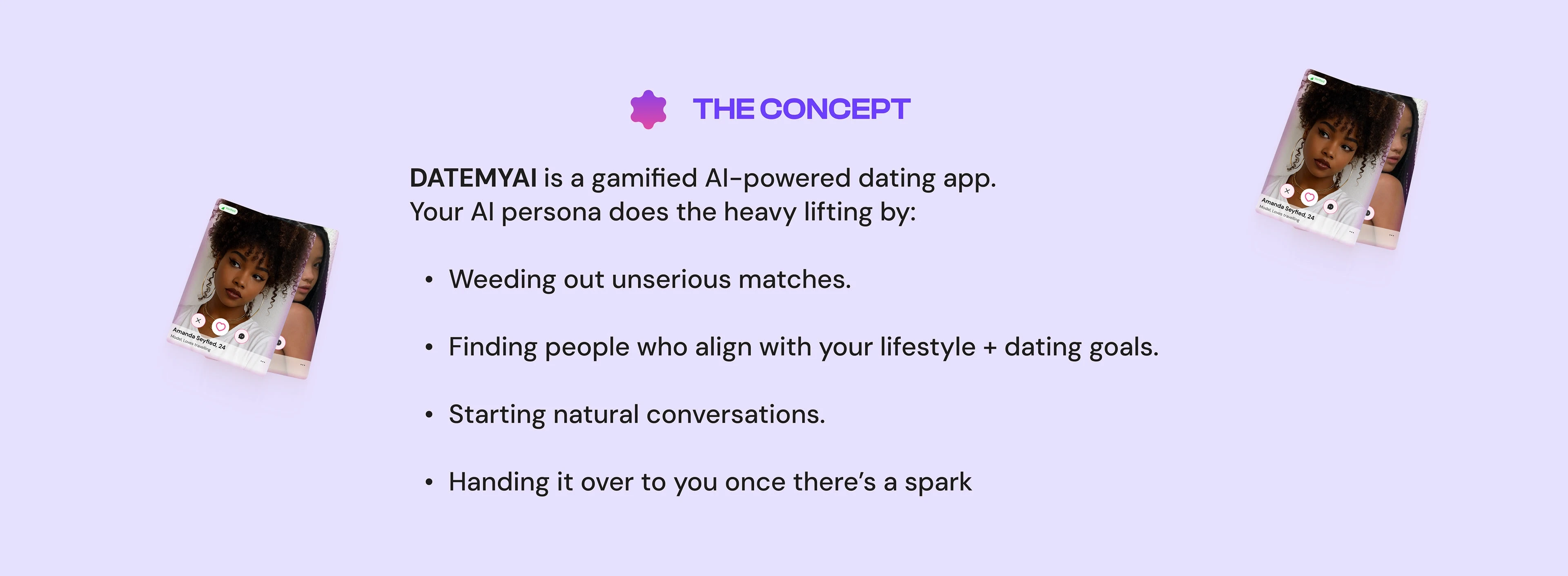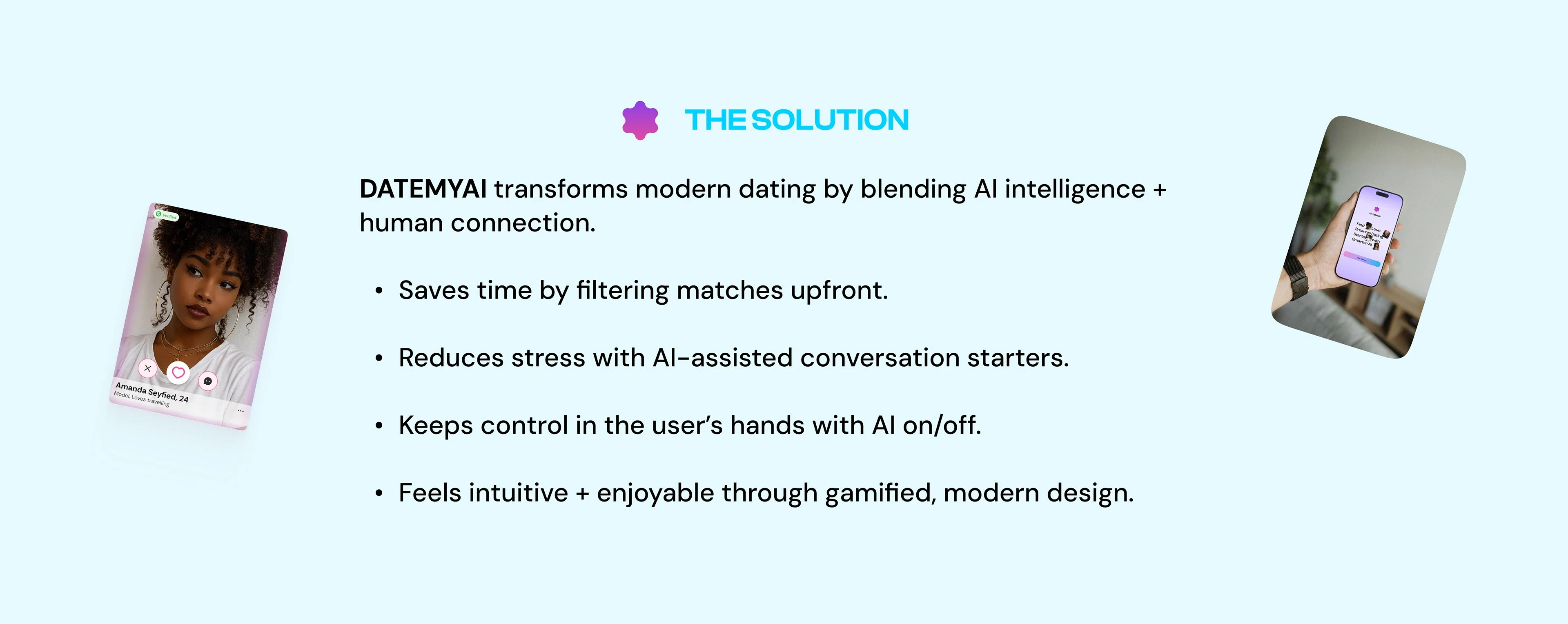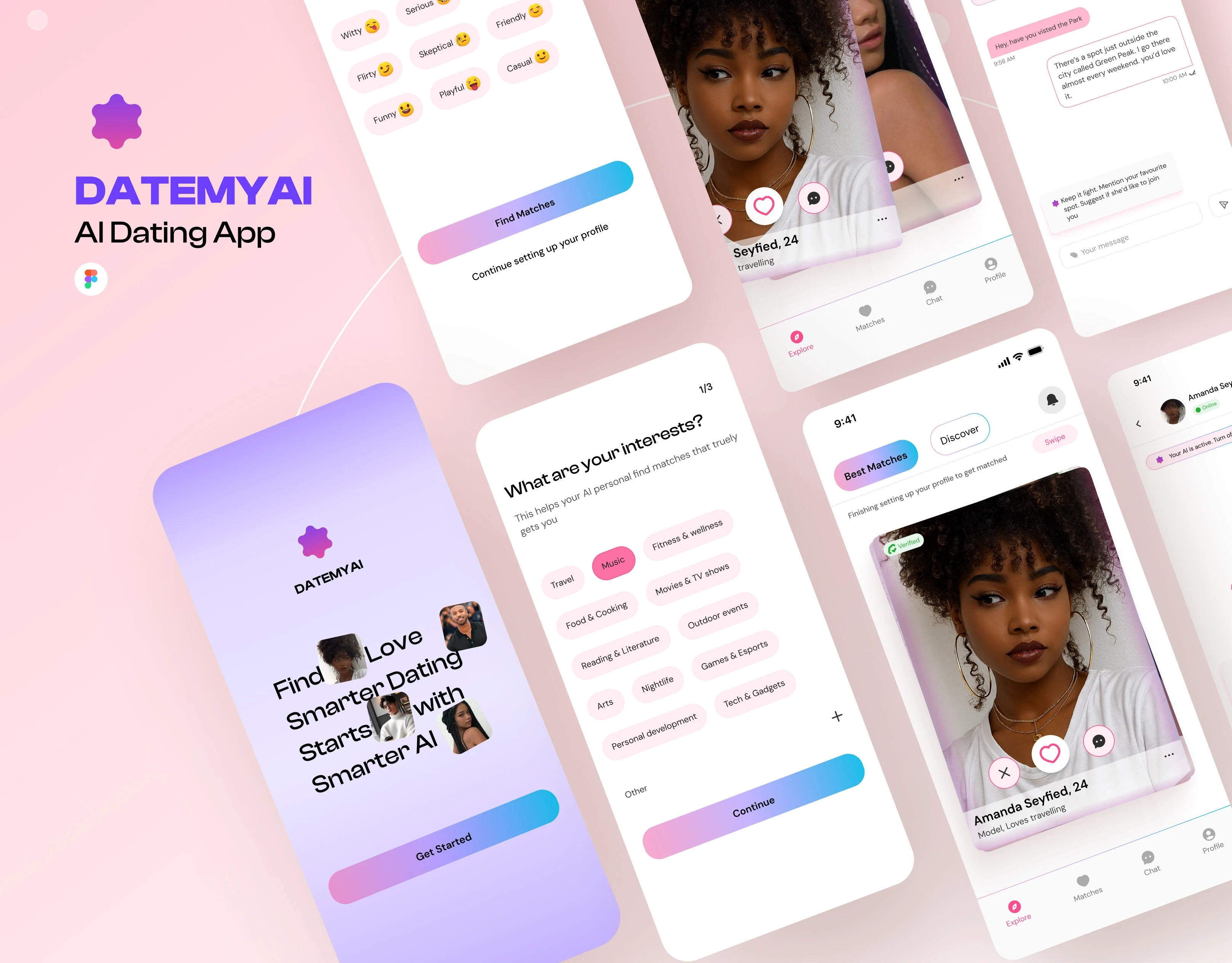 DATEMYAI is a gamified AI-powered dating app that filters matches, sparks natural conversations, and keeps you in control of your dating journey. Product design