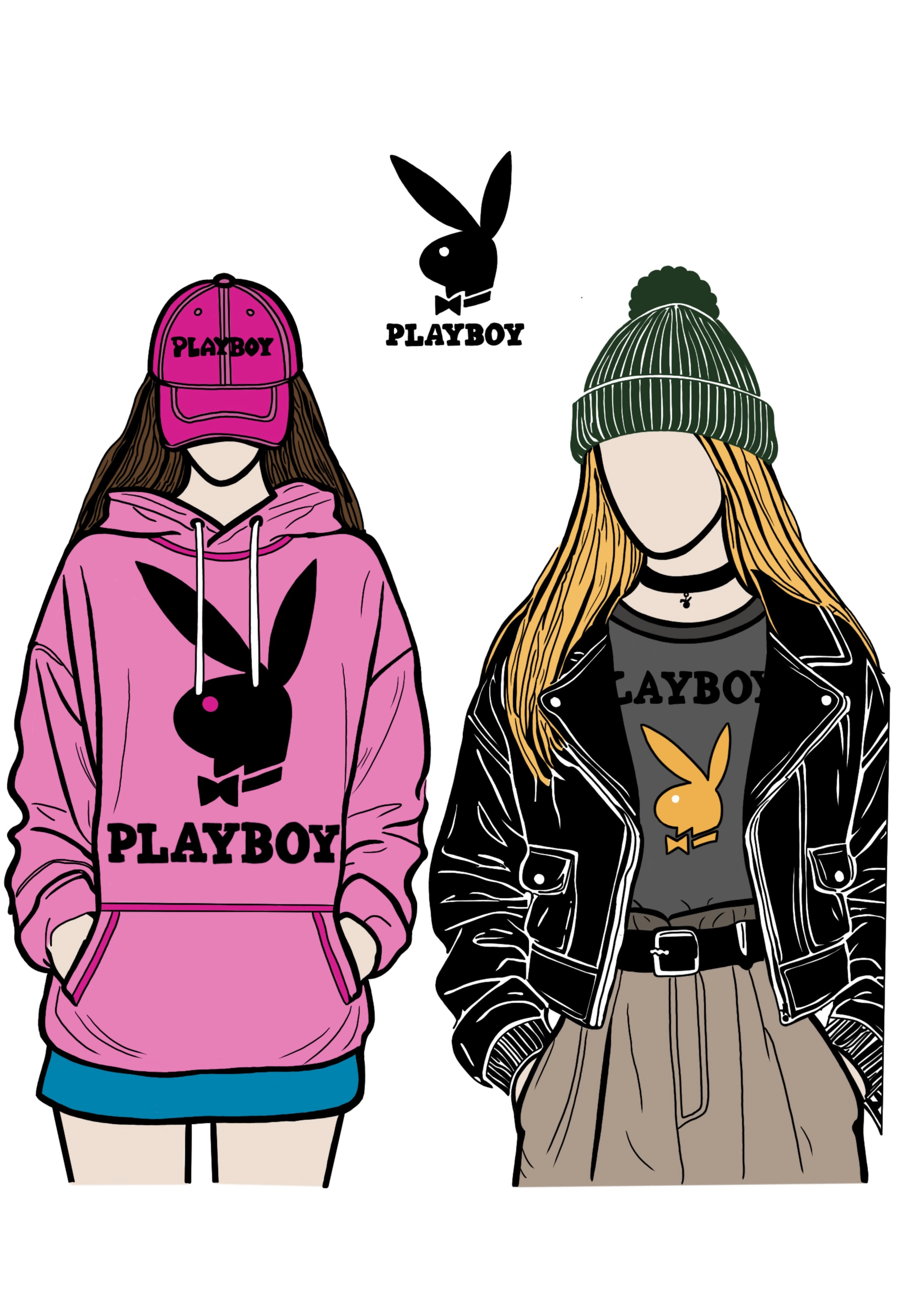 Styled and illustrated two contrasting Playboy looks: a bold pink hoodie with cap and an edgy black leather outfit. Captures street and chic brand identities.