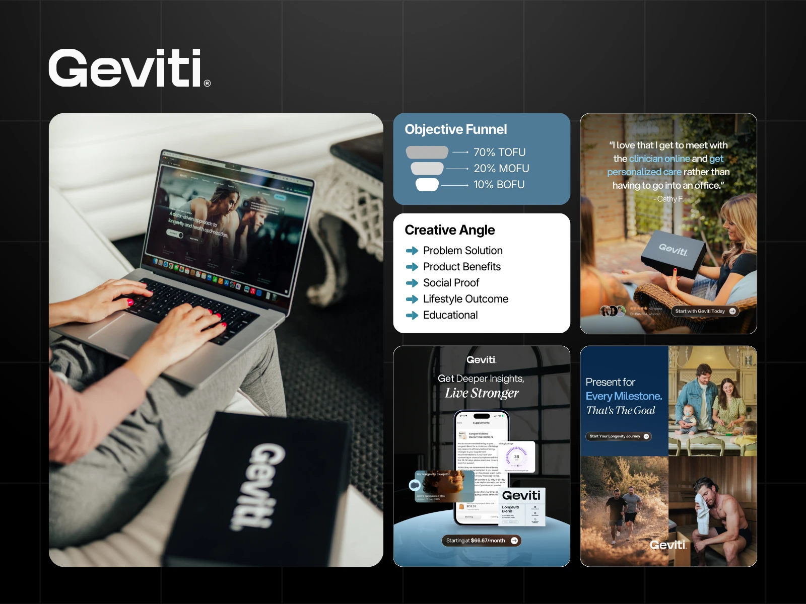 Throughout the campaign, I created a diverse range of visuals that combined lifestyle-driven, education-based, and conversion-focused elements. Each ad highlights a different angle of Geviti’s value: proactive health ownership, data-backed clarity, personalized supplements, and everyday moments improved by better well-being.