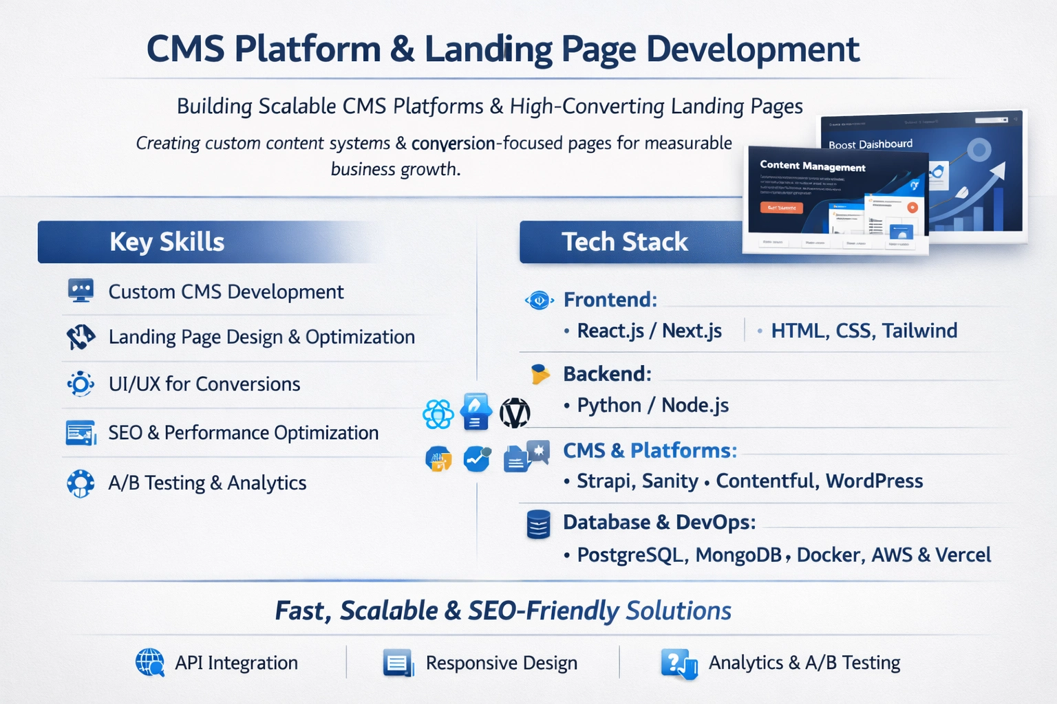 I design and build scalable CMS platforms and conversion-focused landing pages that help businesses manage content effortlessly while driving measurable growth.