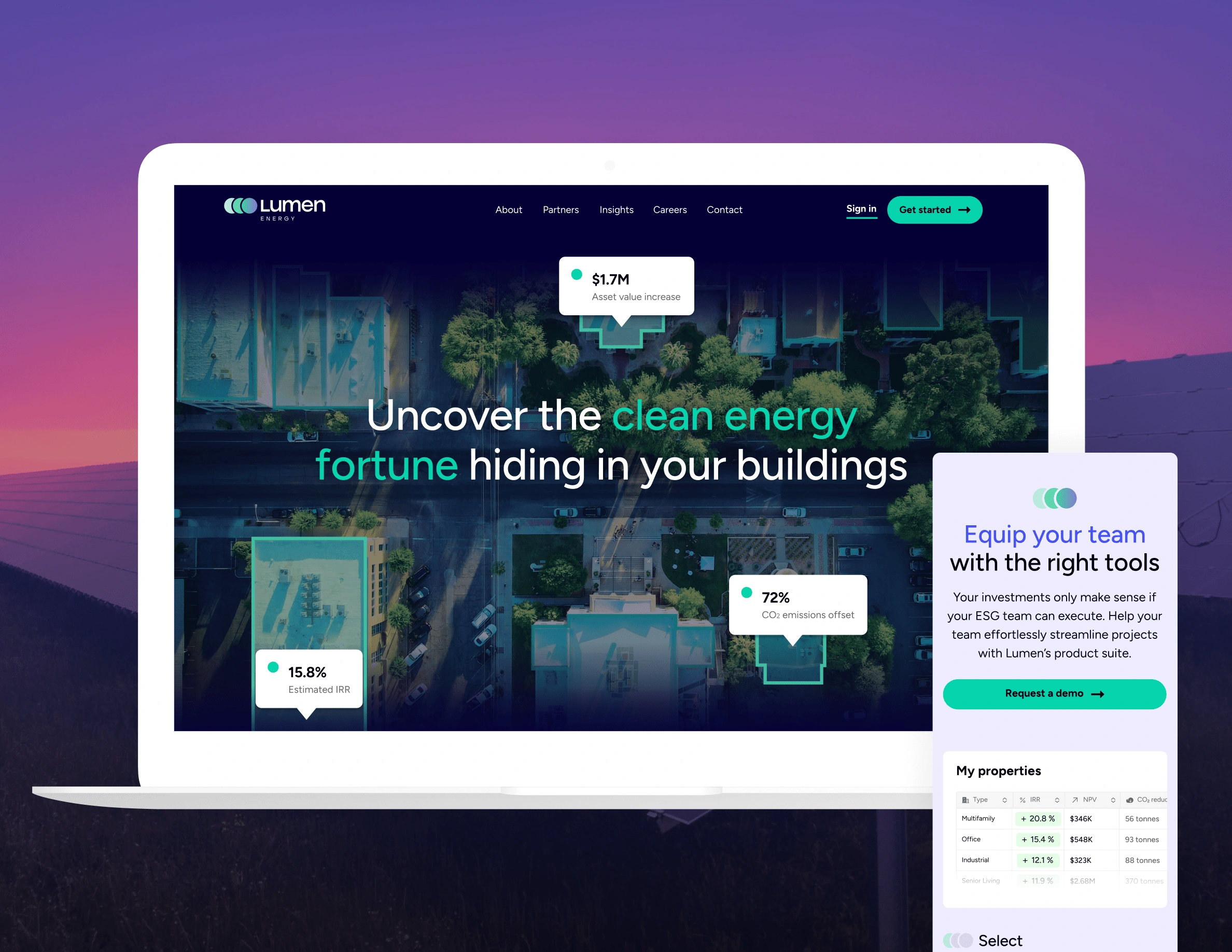 Lumen is a platform that quickly evaluates all of a real estate investor's buildings, then enables them to rapidly finance, deploy, and bill for solar and other profitable clean energy technologies wherever their IRR shines. I designed and developed a marketing website for their product using Figma and Weblow.