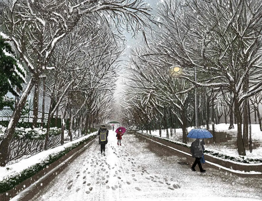 Digital illustration that captures the snowy landscape with hand-painting vibes.