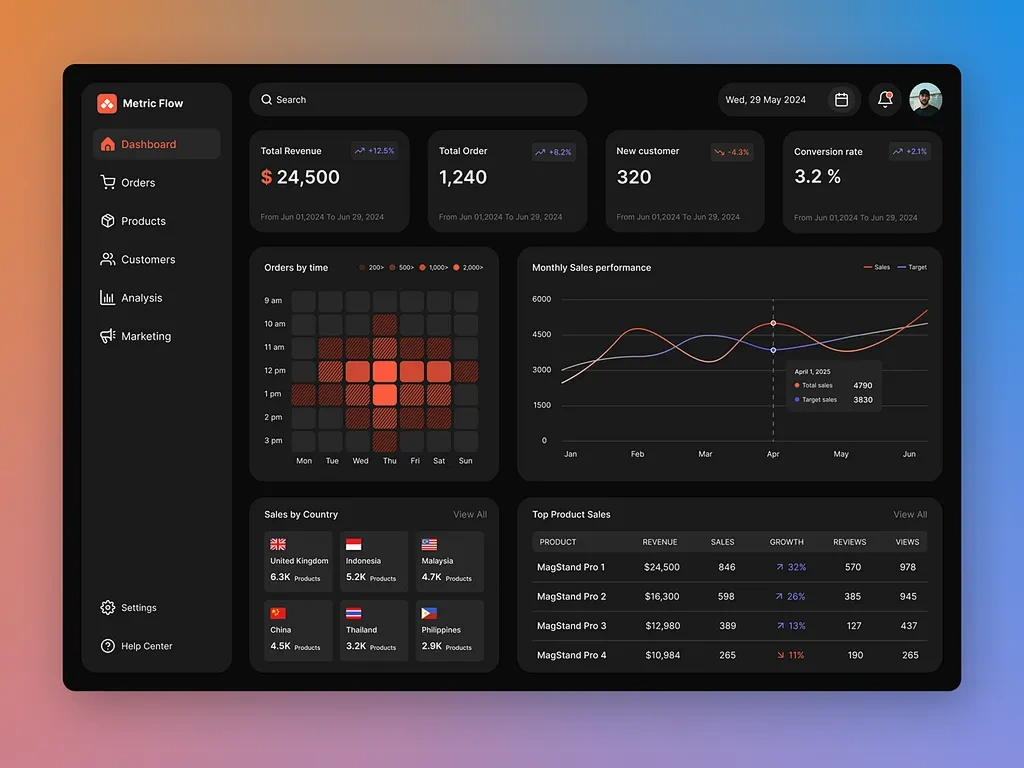 Metric Flow: A sleek SaaS platform for smart eCommerce analytics, inventory, and sales optimization.