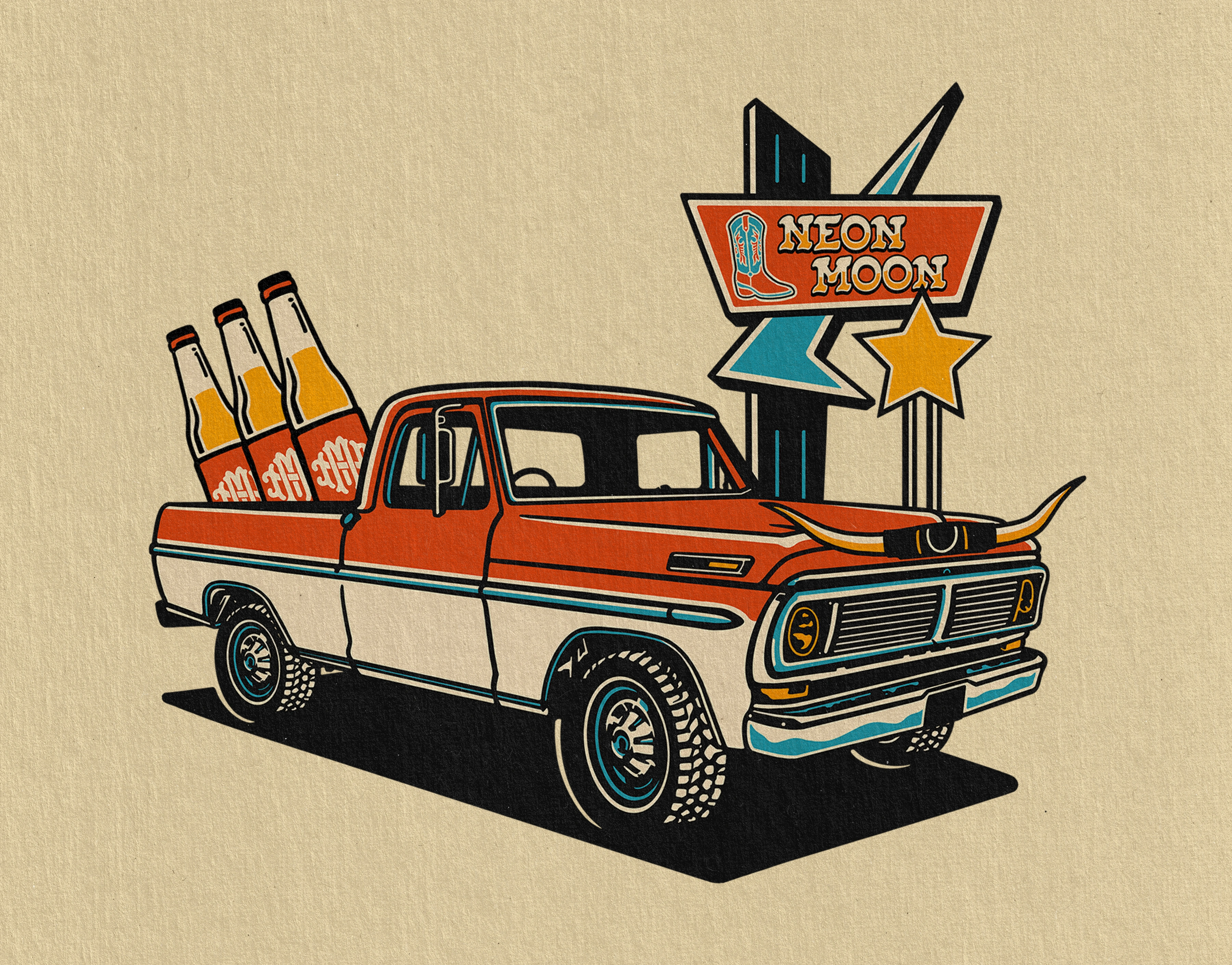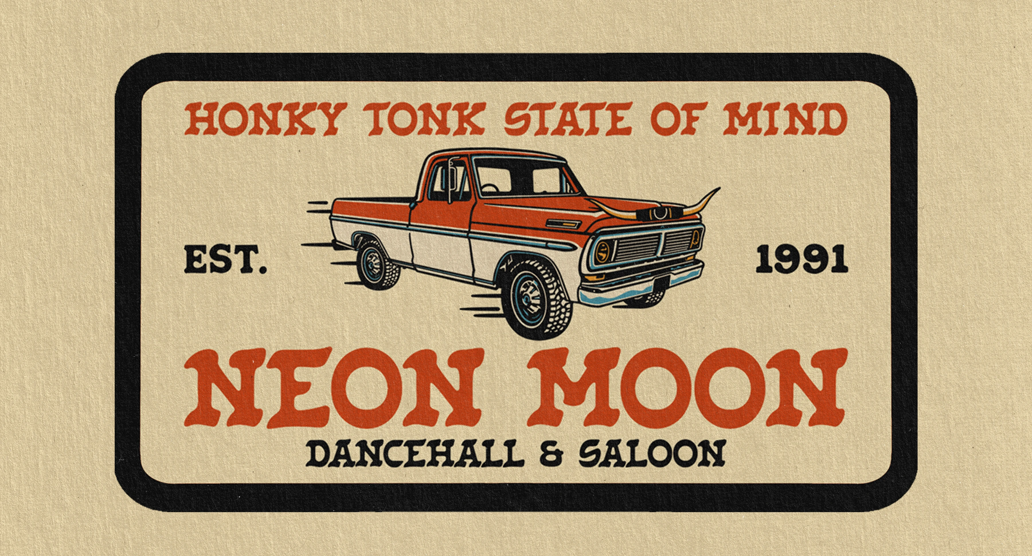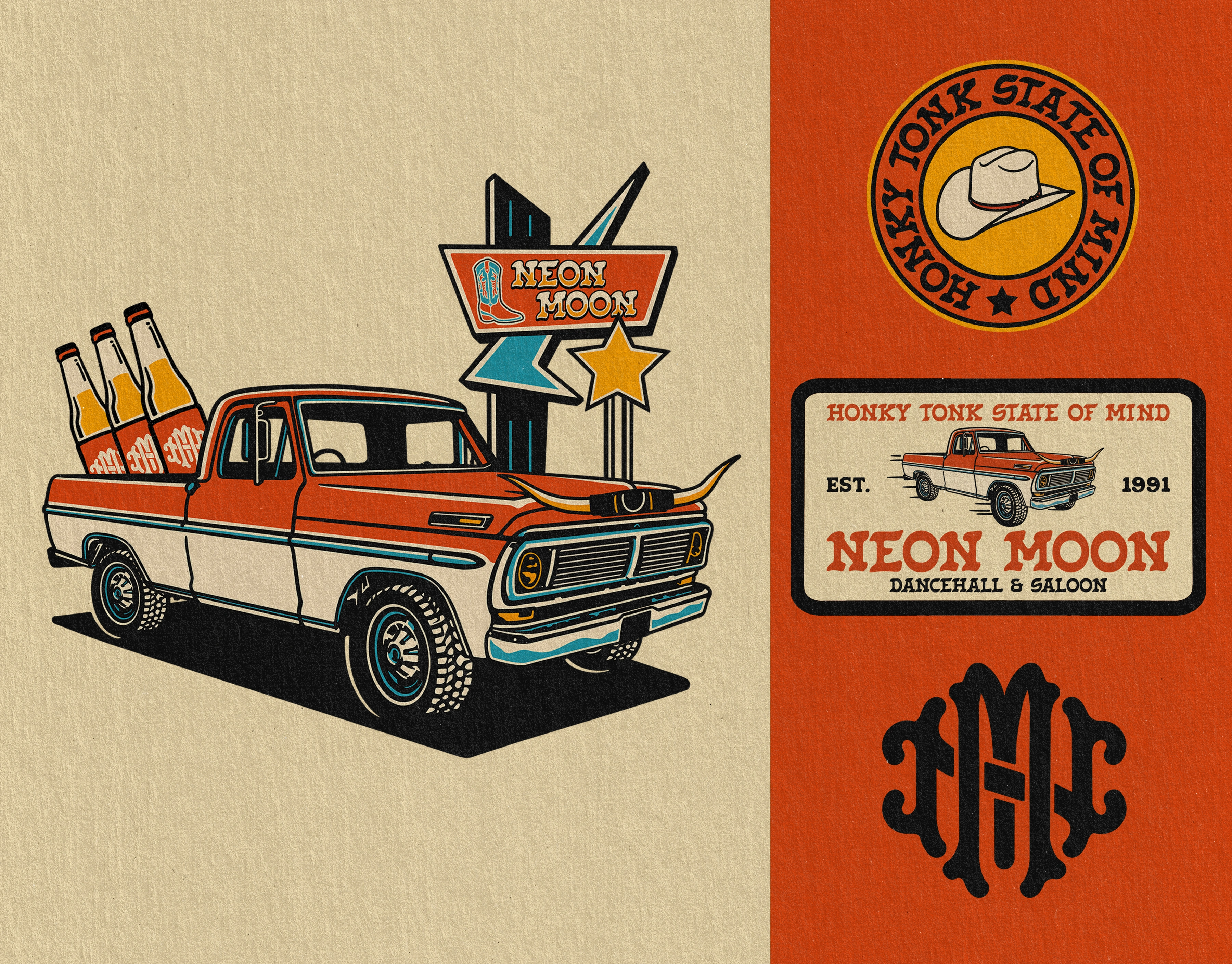 Branding for Neon Moon, blending western charm with retro flair. Bold illustrations, classic typography, and nostalgic colors evoke a true honky tonk spirit.