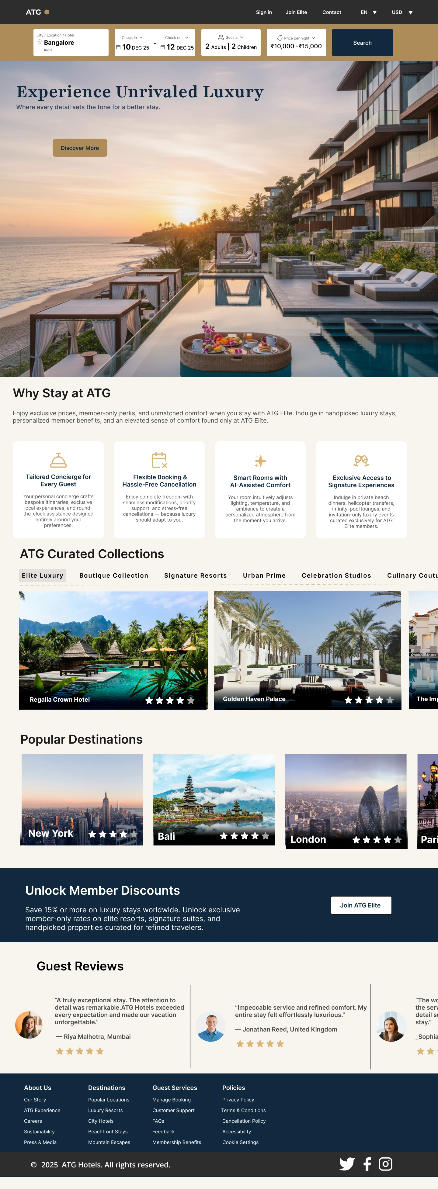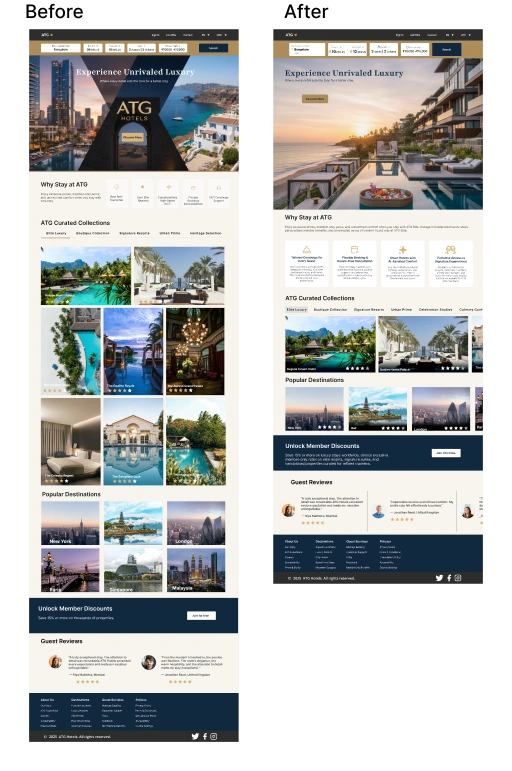 After the redesign, the landing page was transformed into a refined, high-end experience with a strong hero section, well-defined content structure, and a cohesive visual language. Clear categorization, premium imagery, and balanced spacing improved discoverability while reinforcing ATG’s curated luxury identity.
