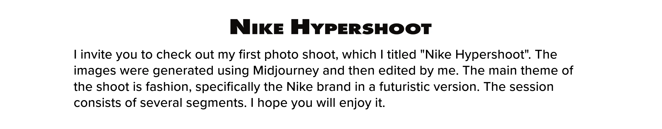 Explore my first shoot, “Nike Hypershoot,” with Midjourney-generated images edited by me. The theme is futuristic Nike fashion across several segments. Enjoy!