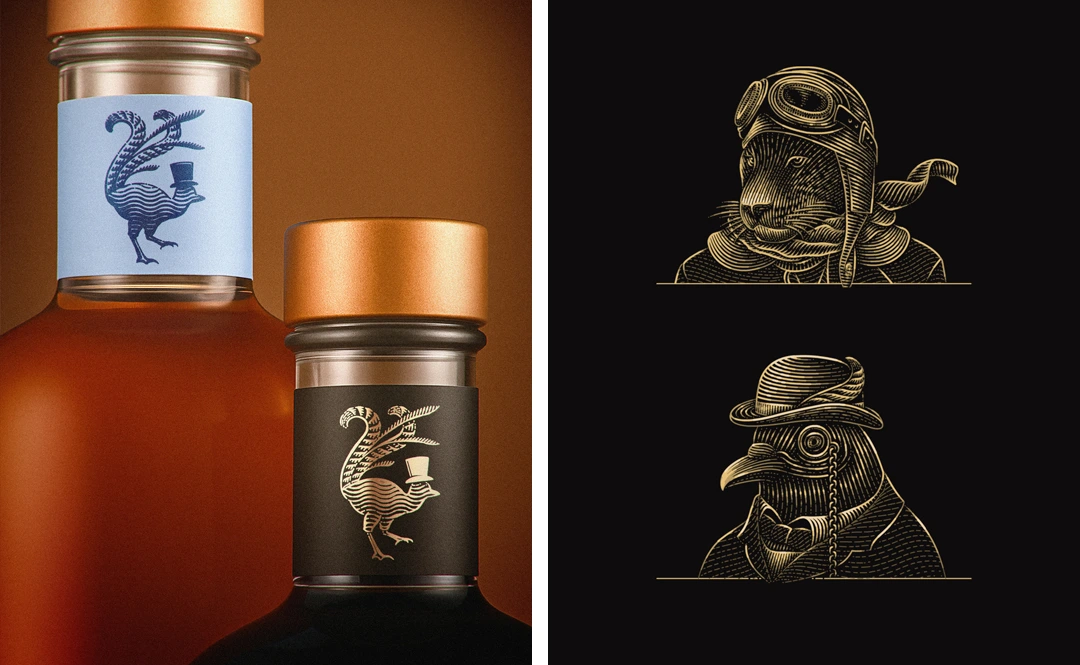Drawn in a custom engraved style, the illustration balances refinement with wit, standing out across packaging and brand materials.