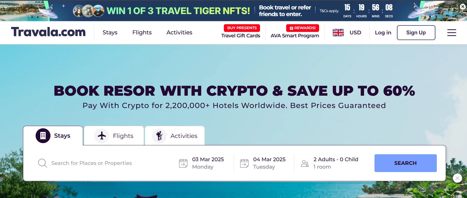 Travala.com is the leading crypto-native travel booking service with 2,200,000+ properties in 230 countries, 400,000+ activities, and 600+ airlines globally.